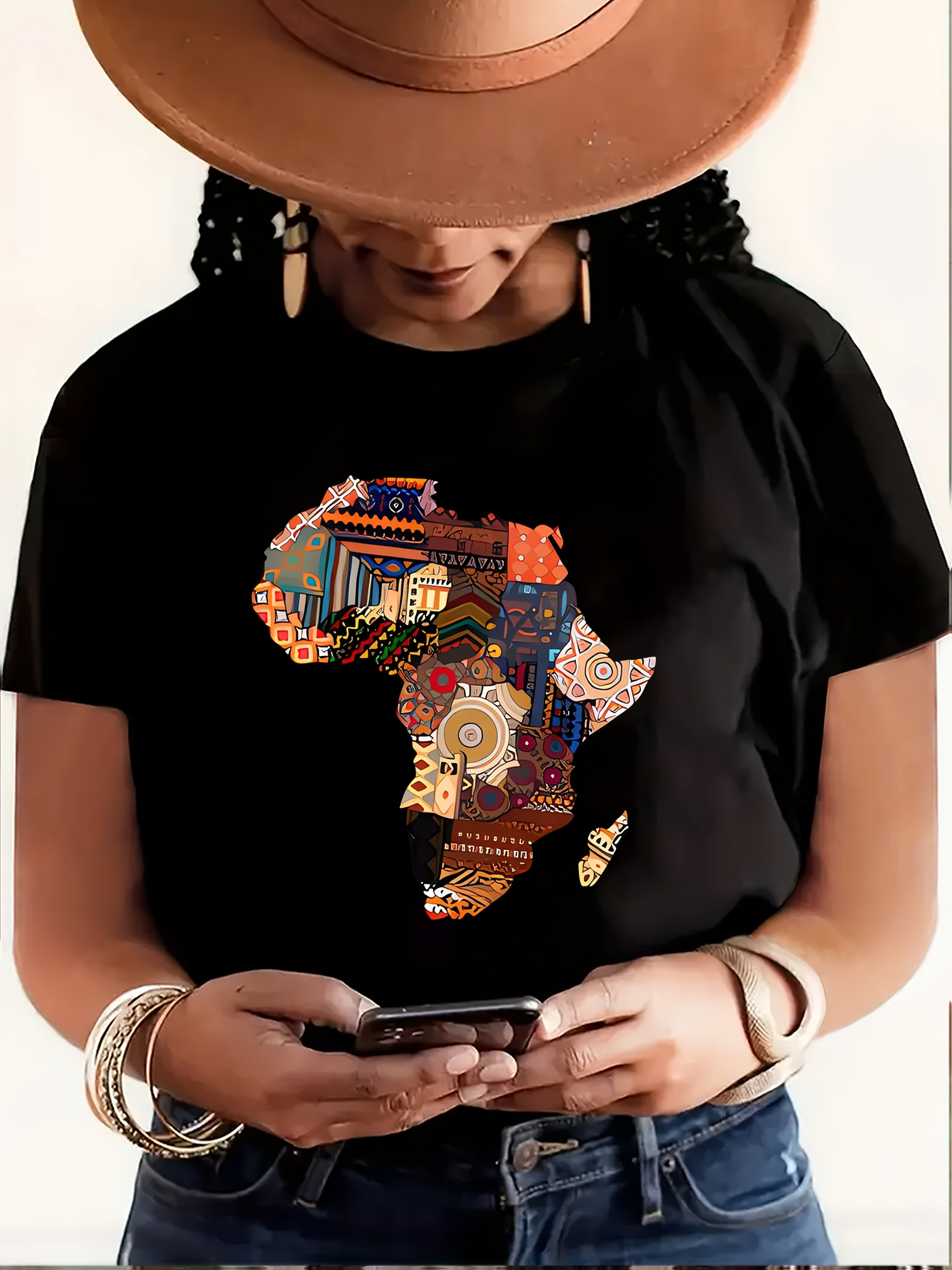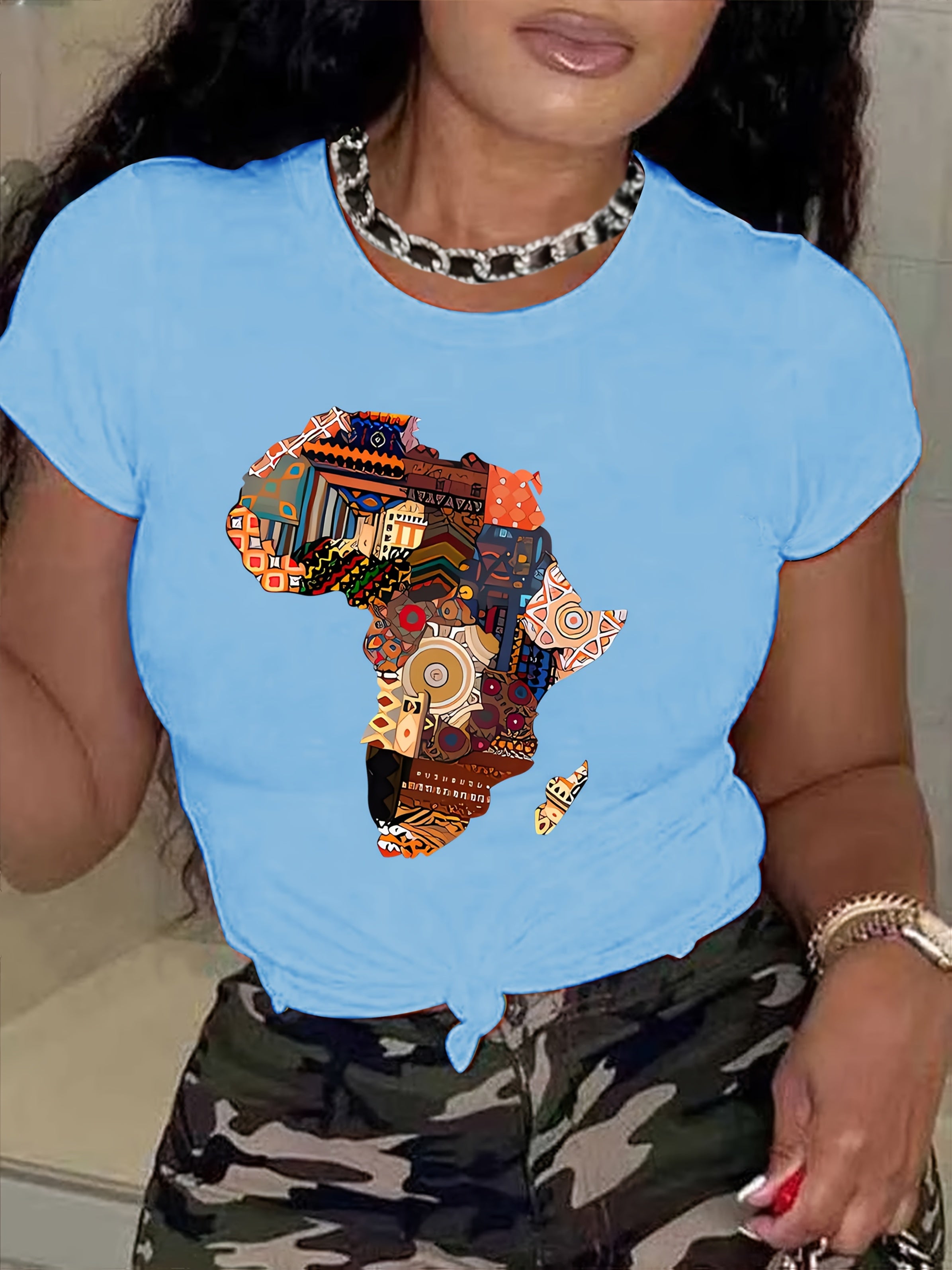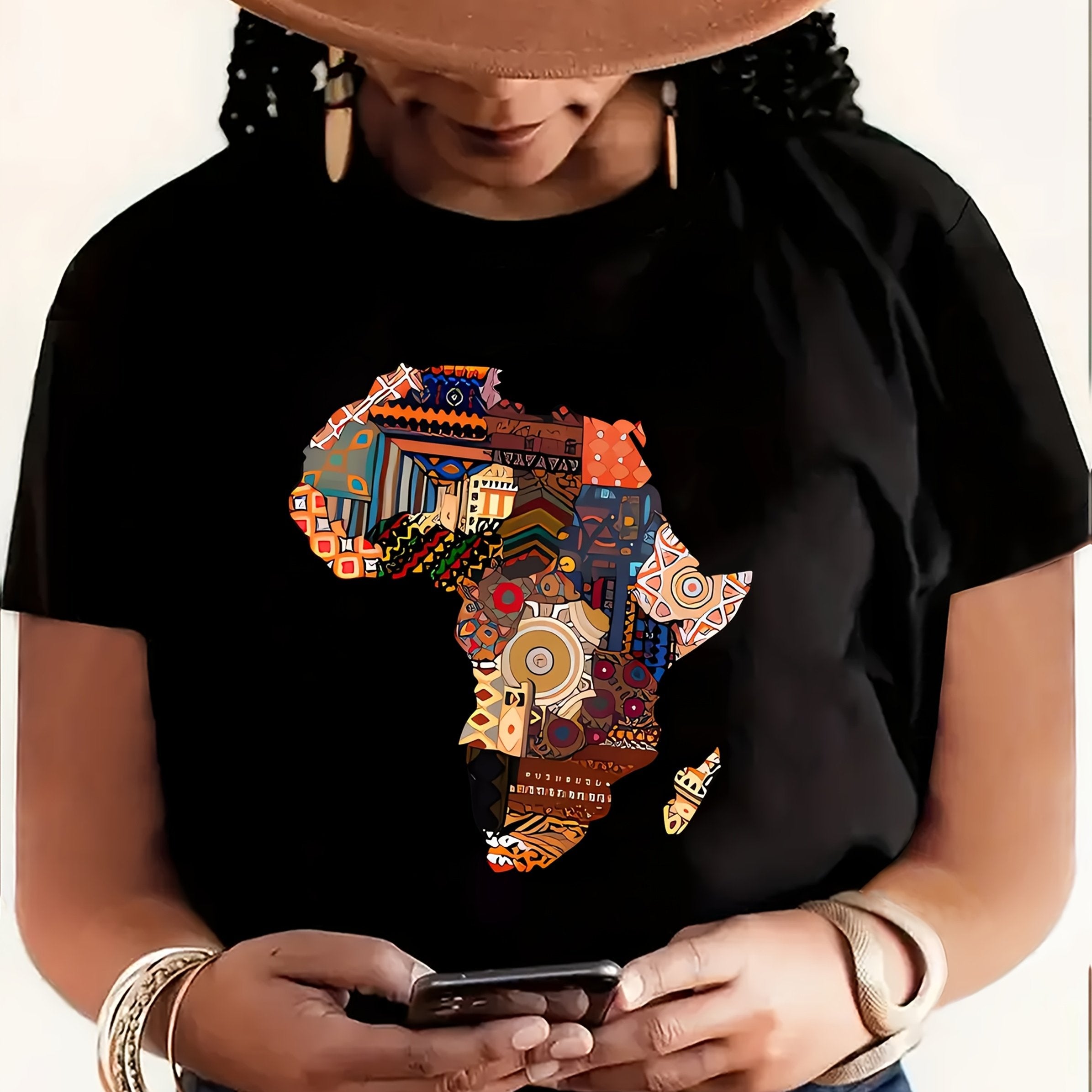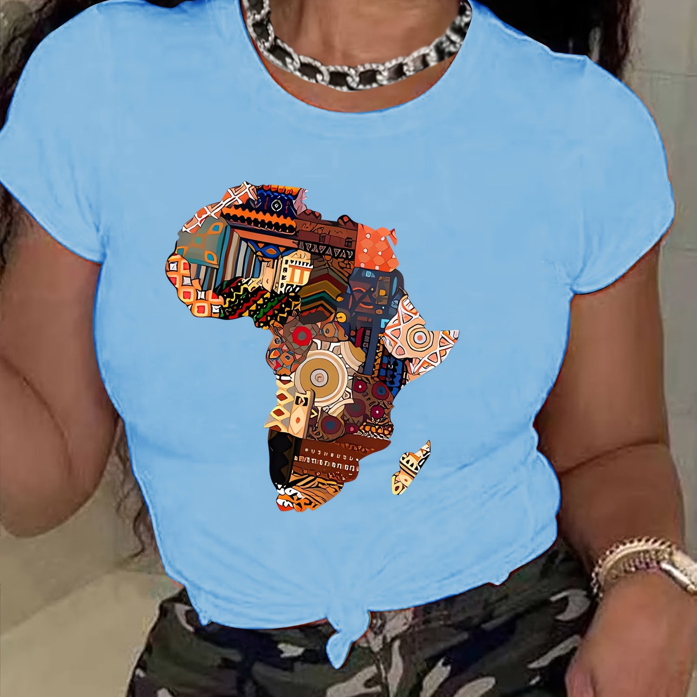 Women's African-Inspired Patchwork Print Casual Short Sleeve T-Shirt - Vibrant Red Round Neck Top with Cultural Motifs, Medium Stretch & Machine Washable for Spring/Summer, Casual Attire, Comfortable Fabric