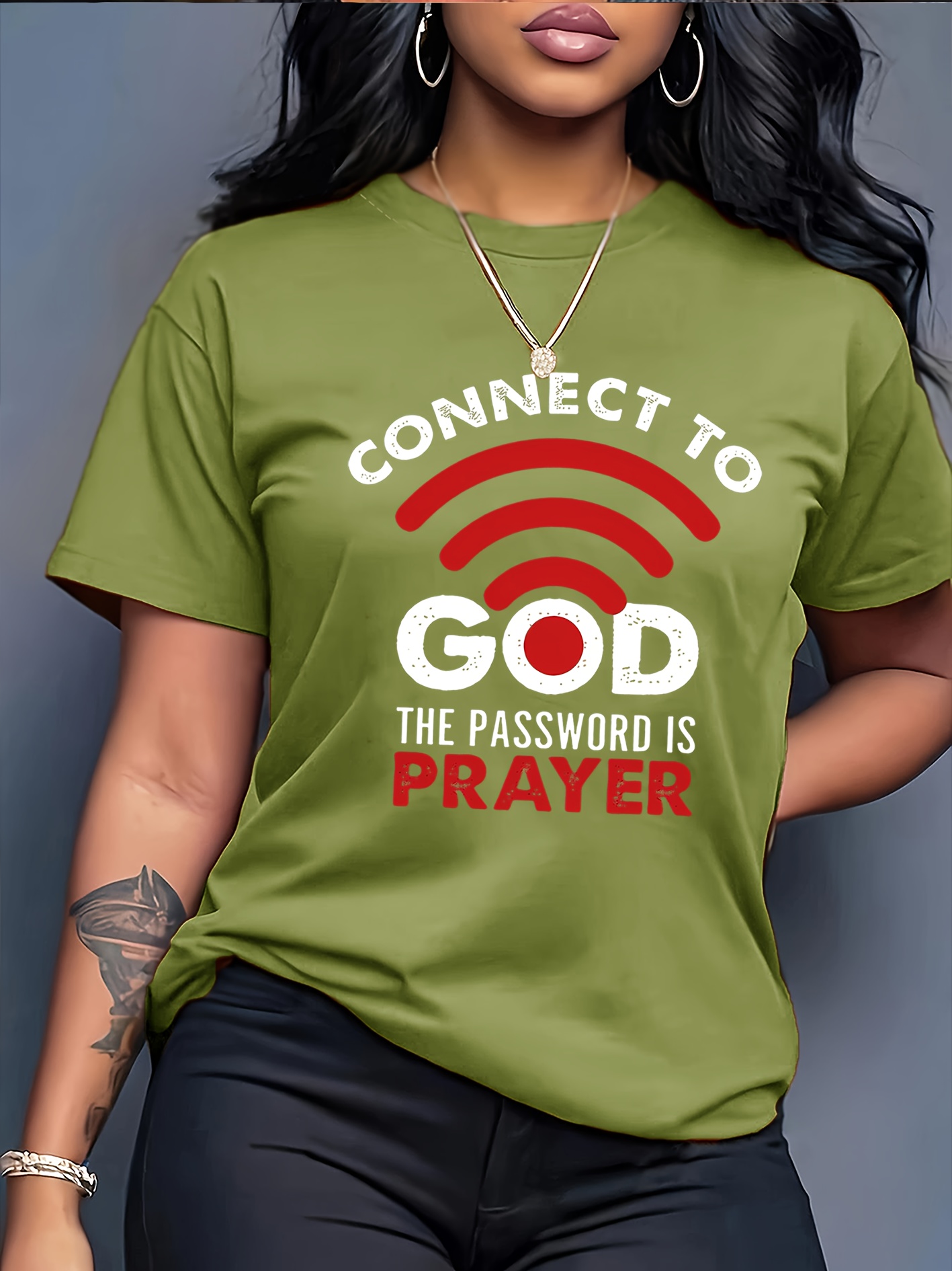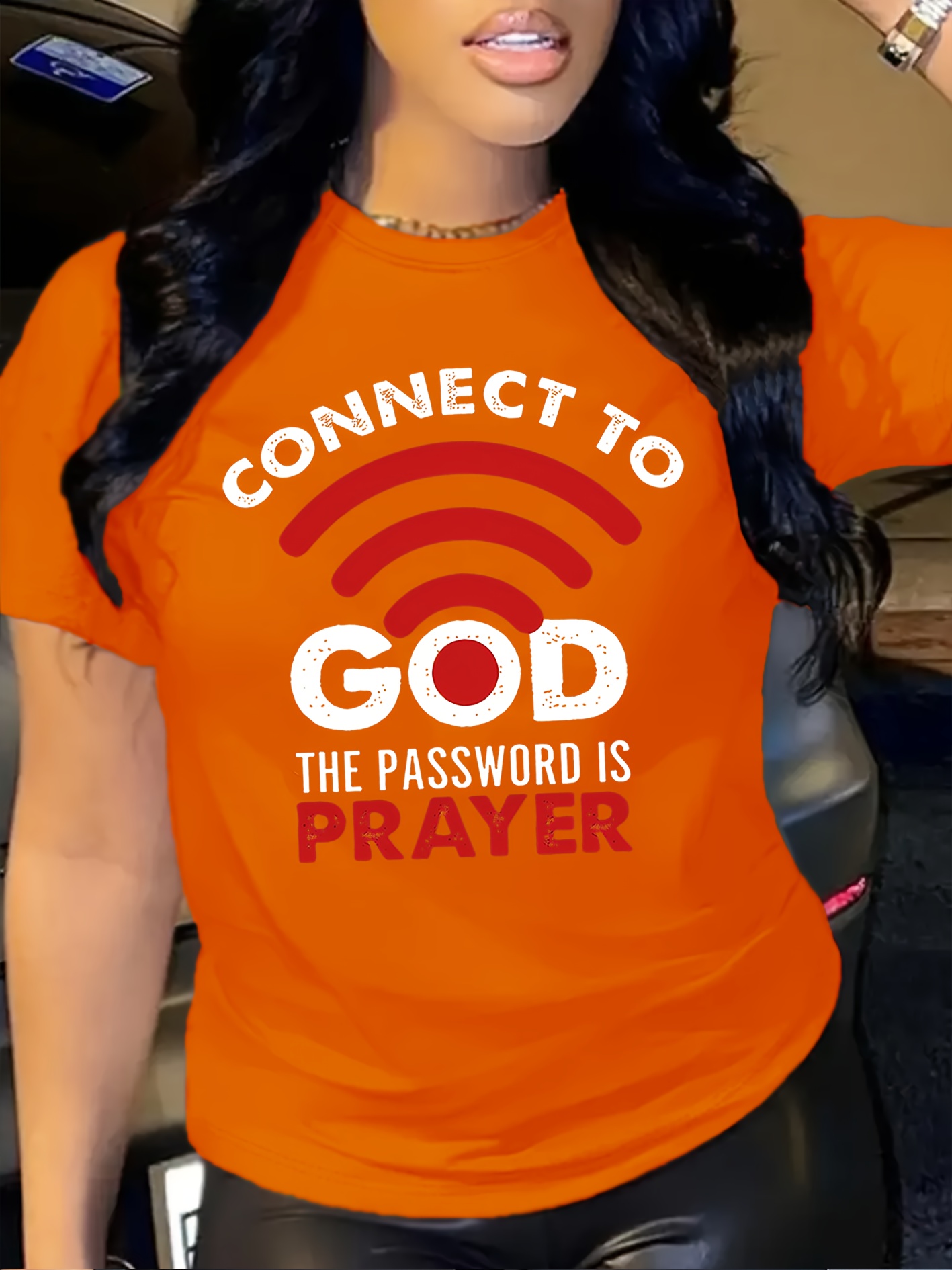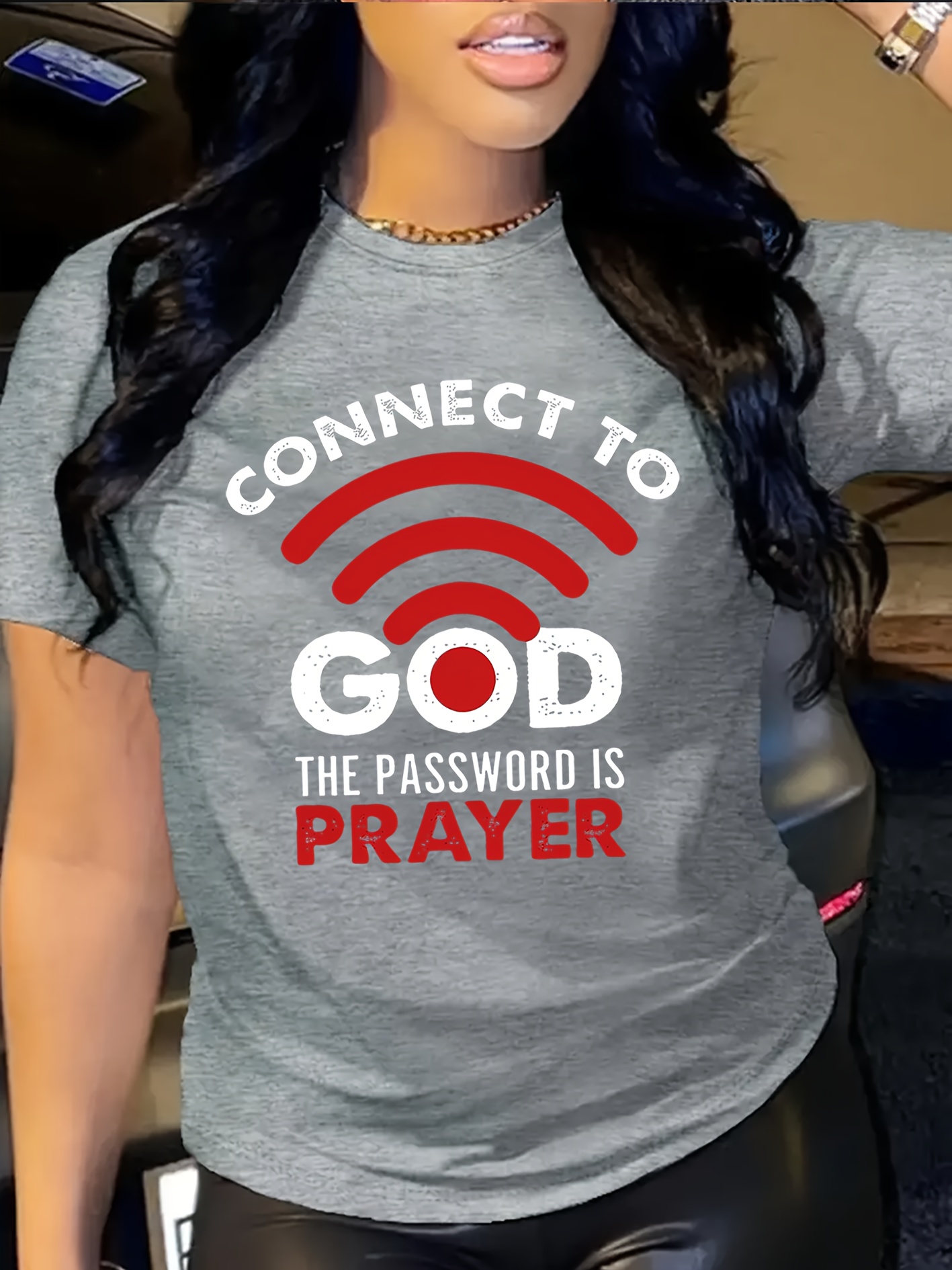 Women'S Casual Crew Neck T-Shirt with "Connect to God, The Password is Prayer" Print, Polyester 100%, Knit Fabric, 180g/m², All Seasons