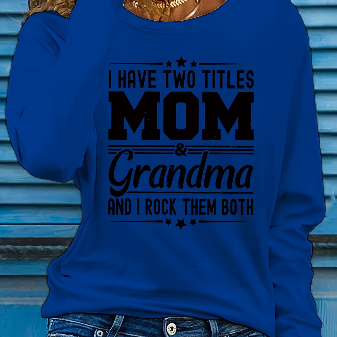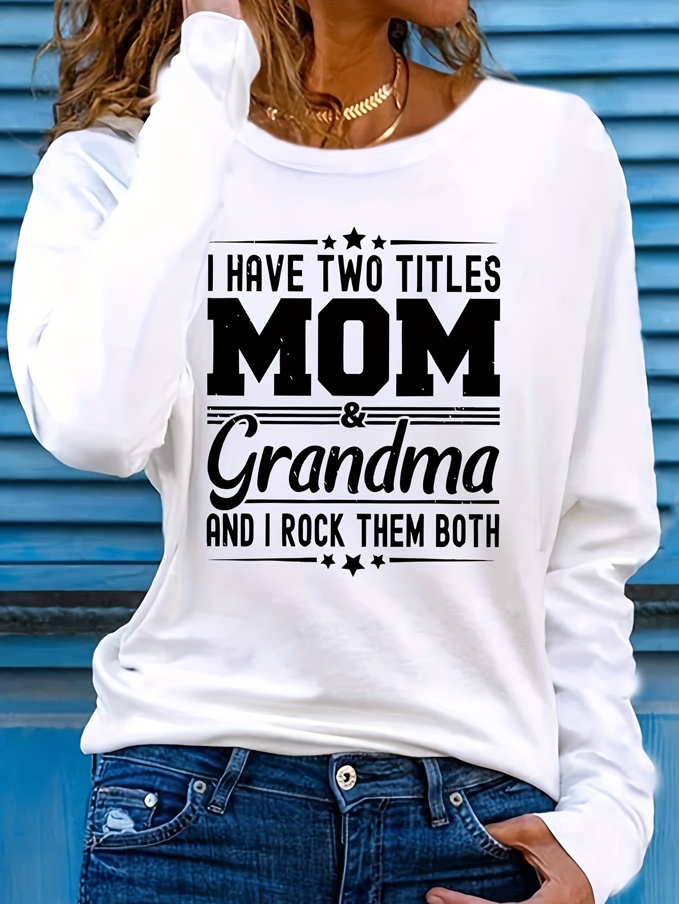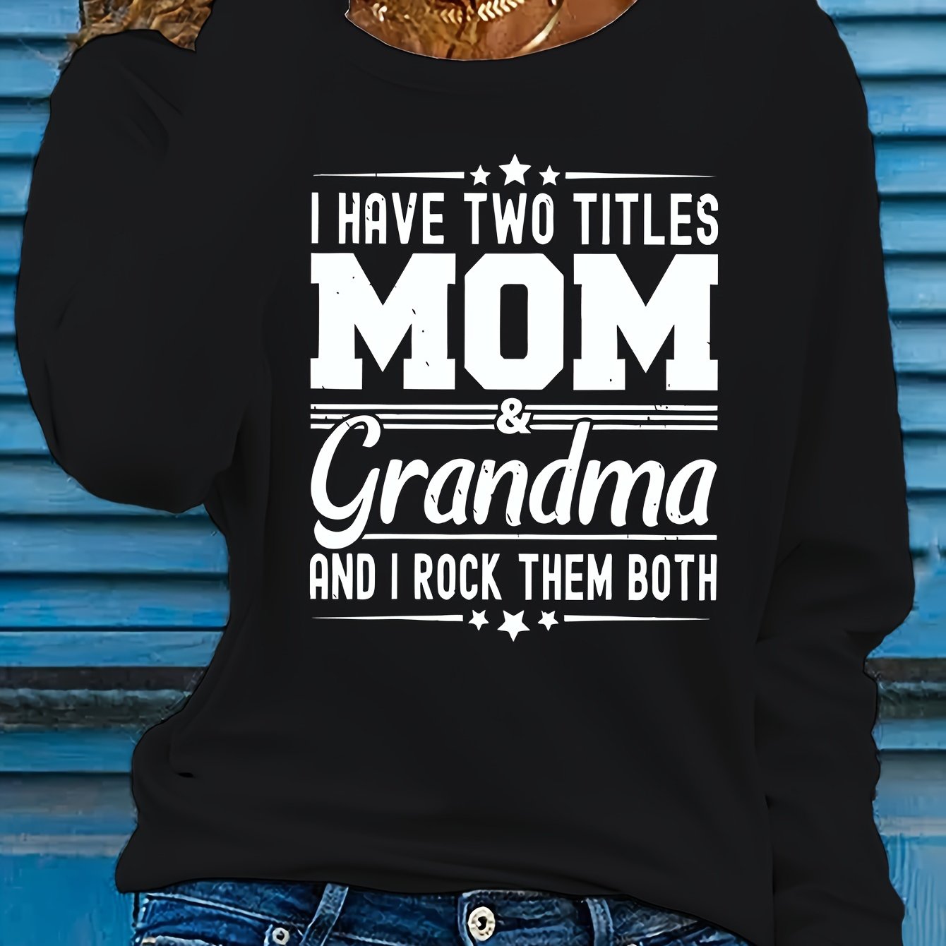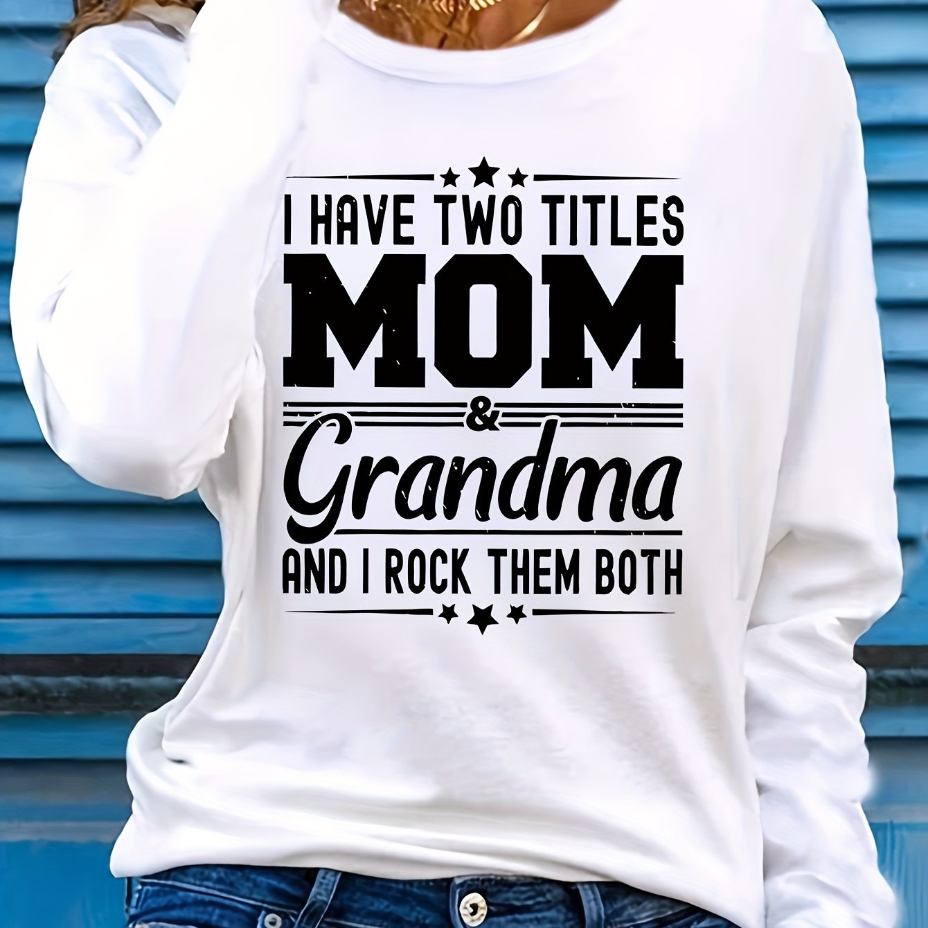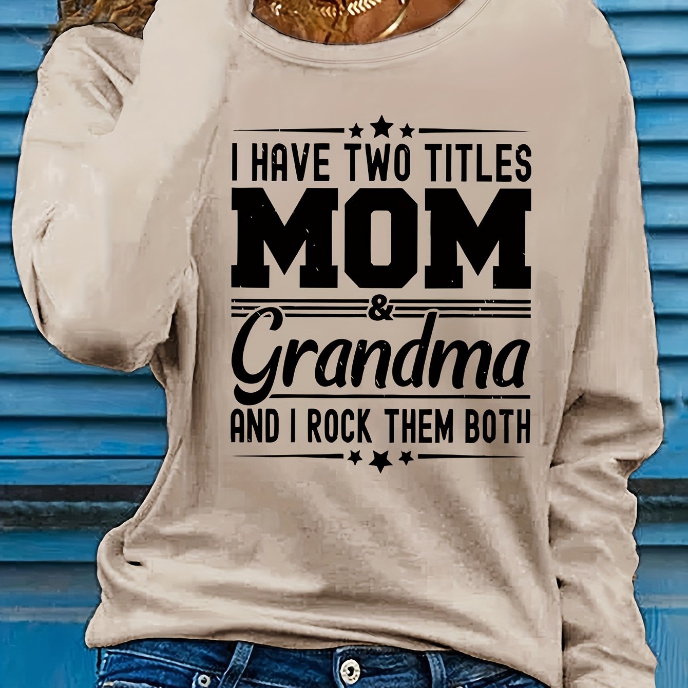 Women'S Long Sleeve Crew Neck T-Shirt with "Mom & Grandma" Letter Print, Casual Polyester Top for All Seasons, Knit Fabric with Medium Stretch, Regular Fit - Applique Detail