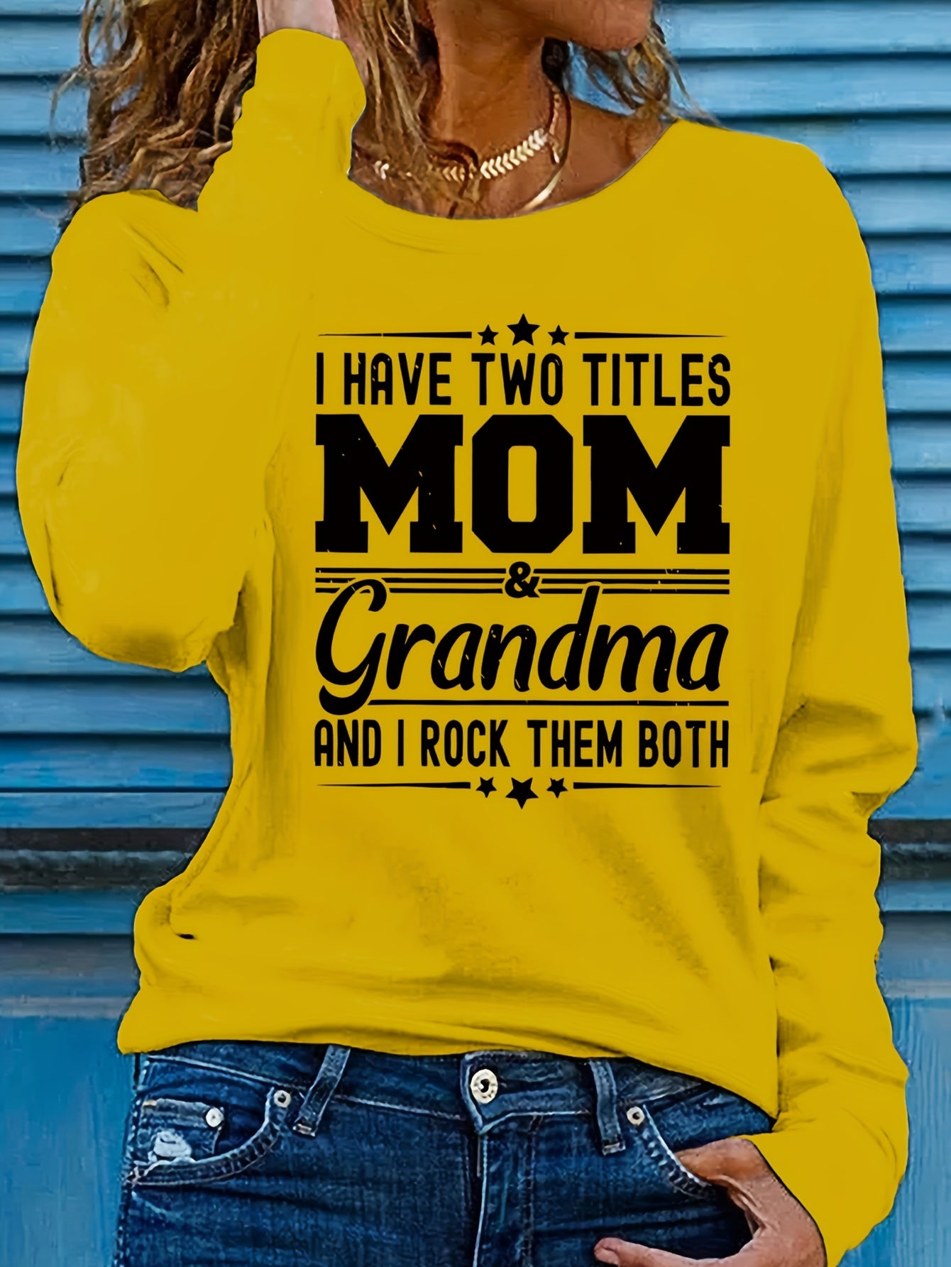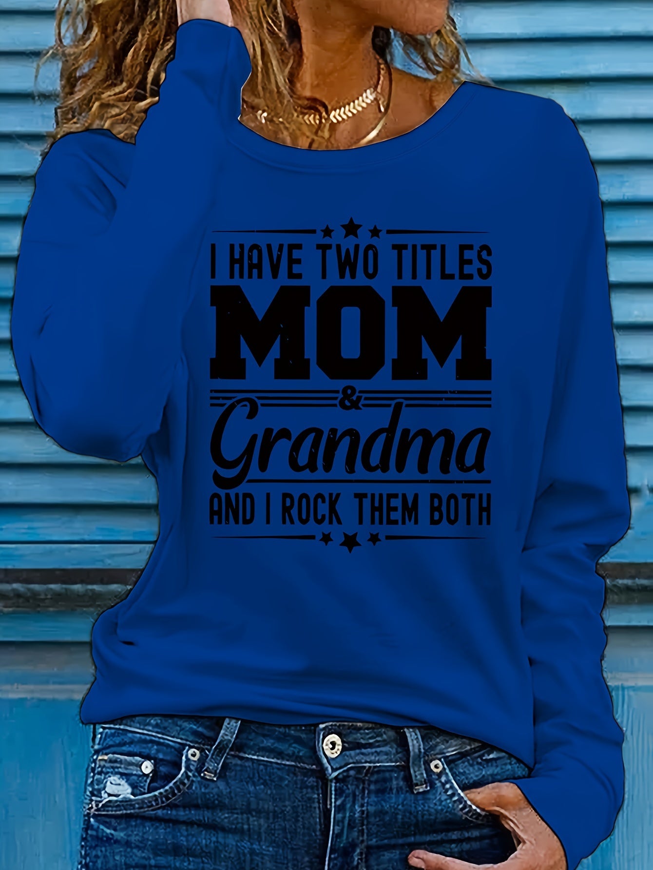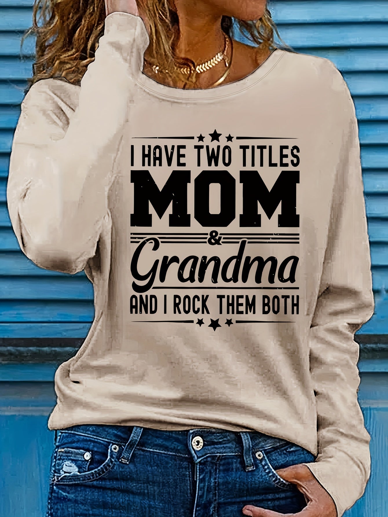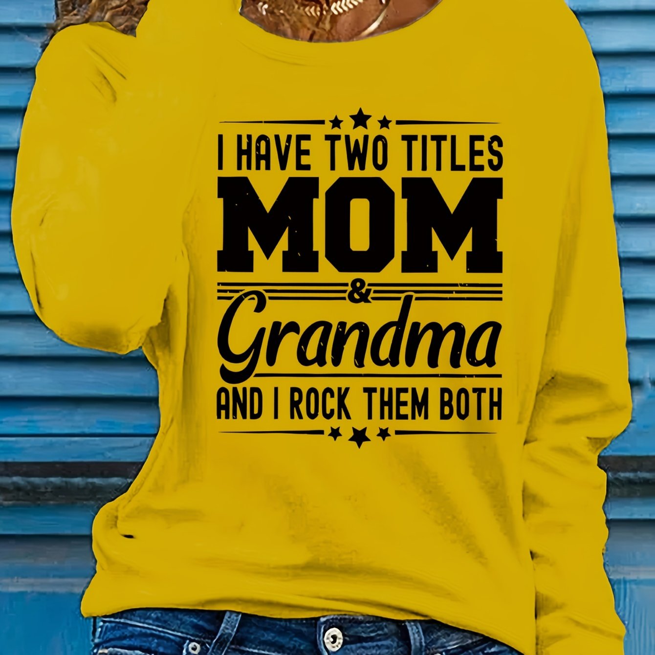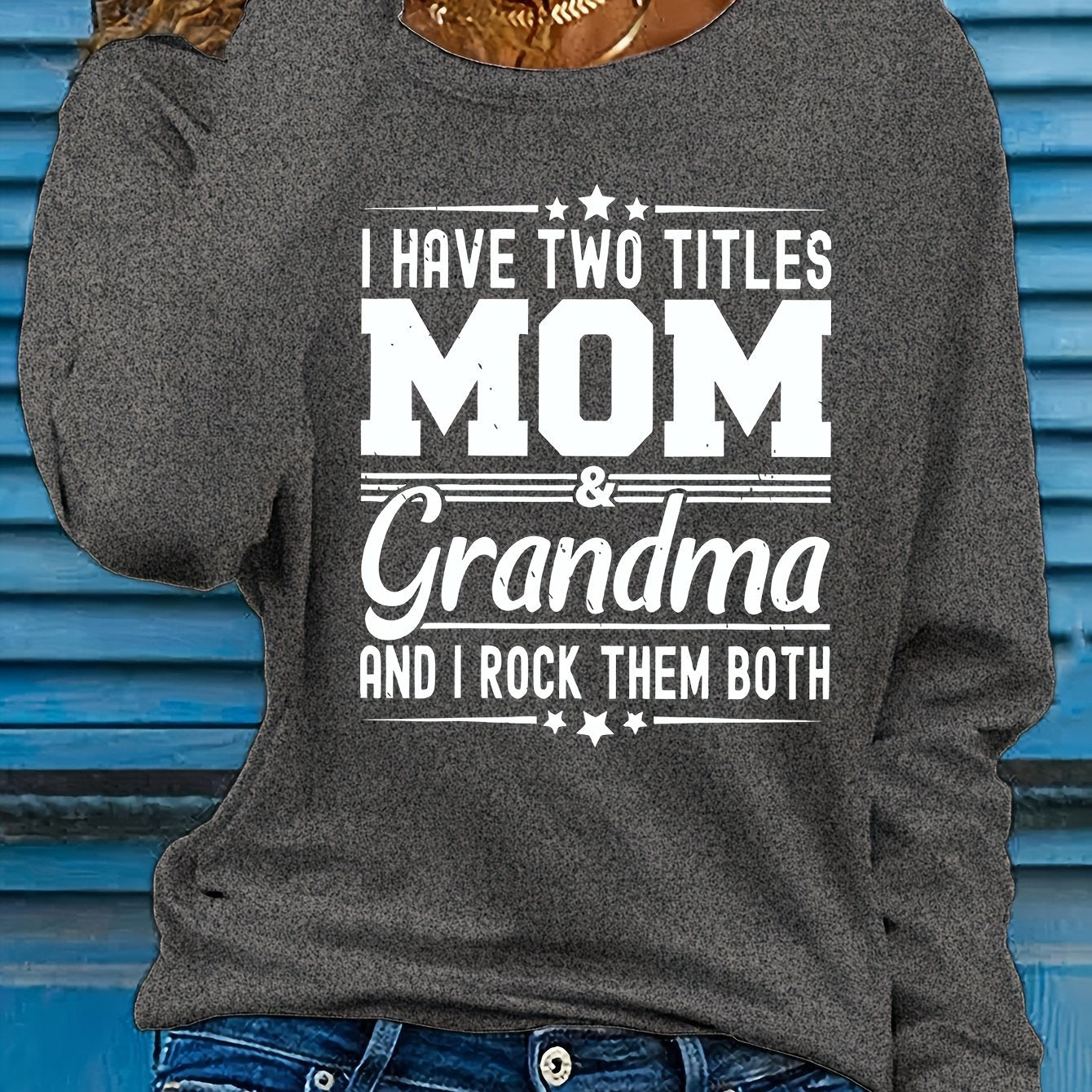 Women'S Long Sleeve Crew Neck T-Shirt with "Mom & Grandma" Letter Print, Casual Polyester Top for All Seasons, Knit Fabric with Medium Stretch, Regular Fit - Applique Detail