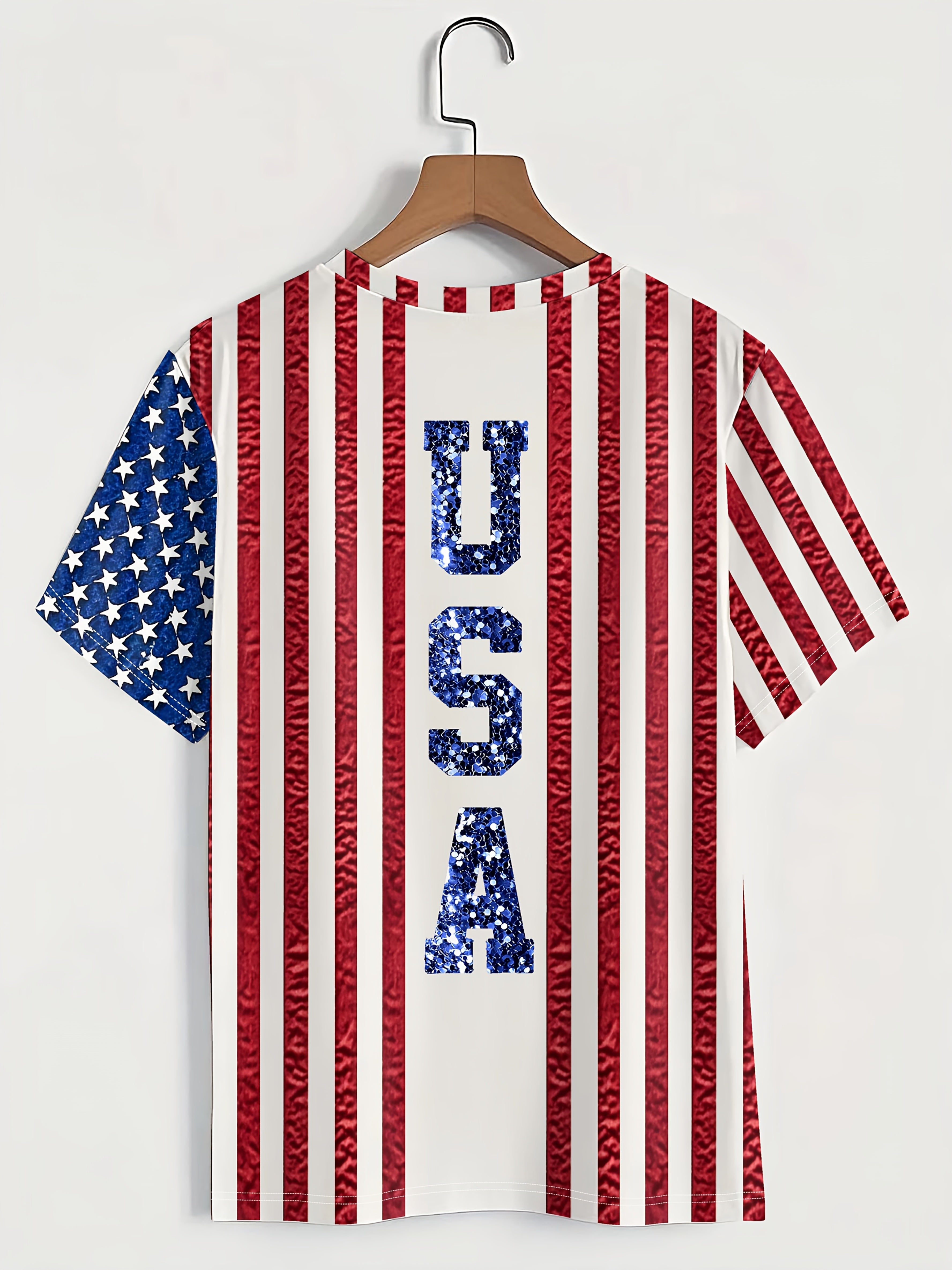 Women's Printed, Non-Glitter Sequin Flag Print Casual T-Shirt - Spring/Summer Fashion Design, Minimalist, Romantic Style, Artistic, Casual Attire, Vacation Look, Versatile and Stylish