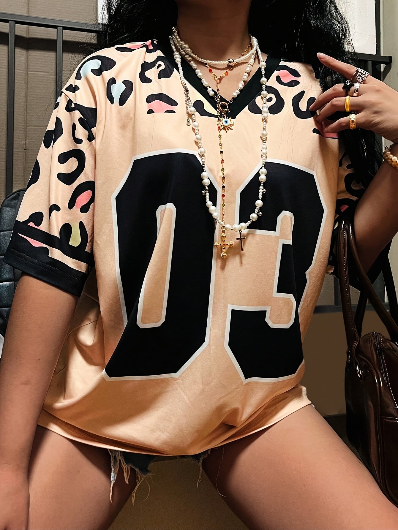 Women's Sporty Chic V-Neck T-Shirt with Bold '03' Numerals & Leopard Print - Lightweight Breathable Fabric, Machine Washable, Spring/Summer Casual Top, Ladies T Shirts, Summer Fashion, Vneck Tee, Sophisticated Design