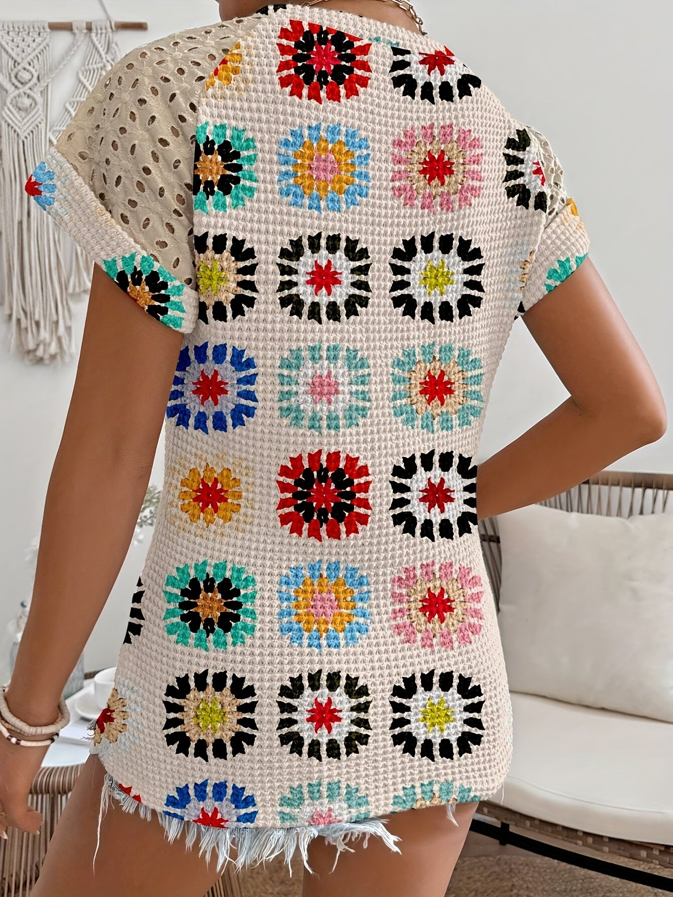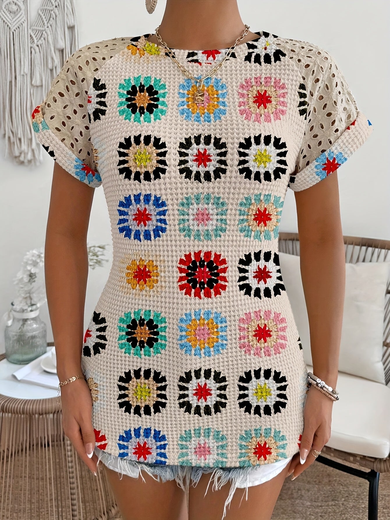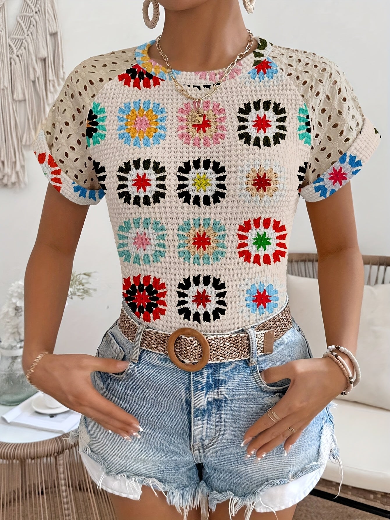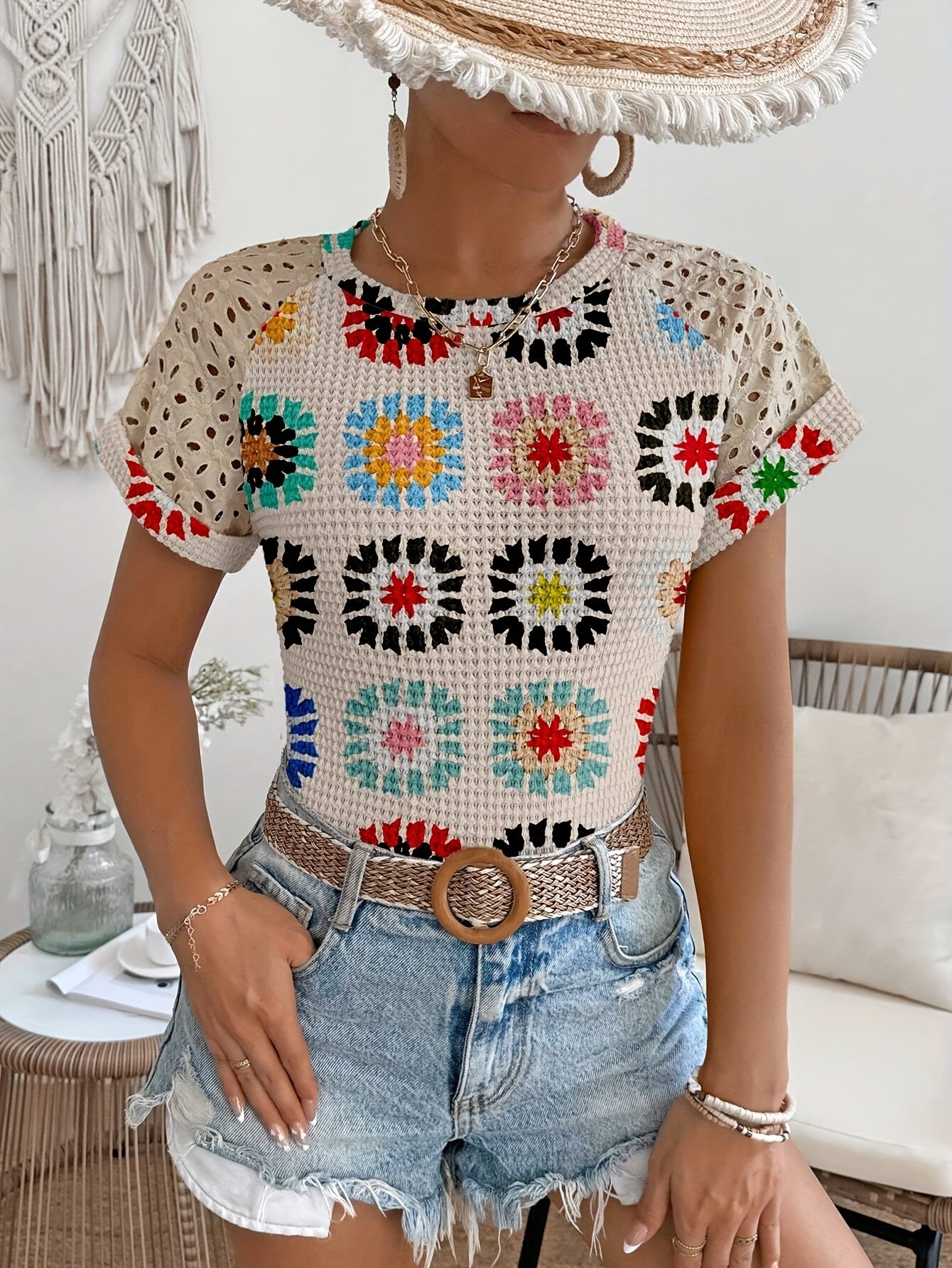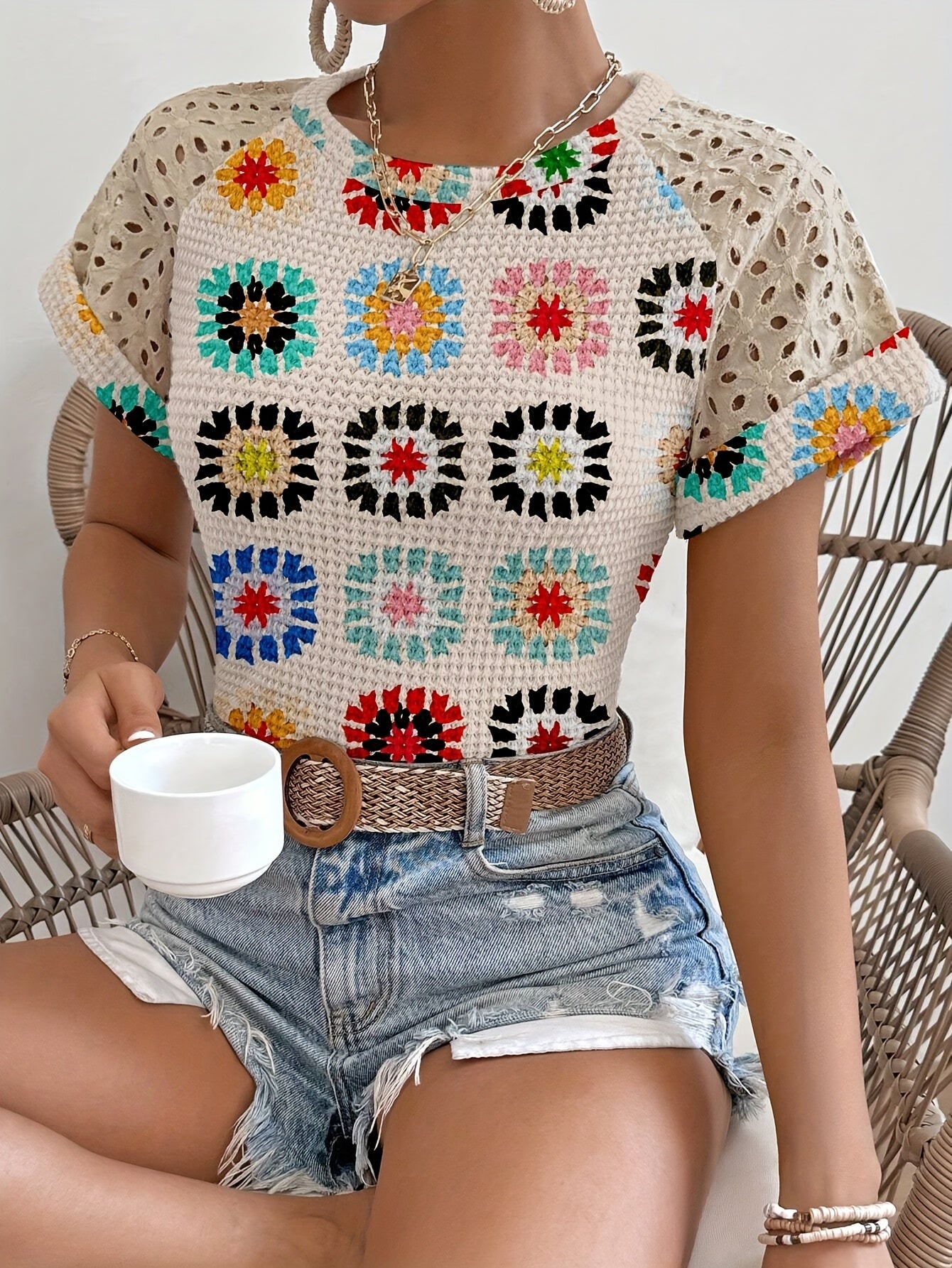 Women's Stylish Geometric Print T-Shirt with Lace Sleeves & Color Block Cuffs - Lightweight Polyester Blend for Spring, Summer & Fall - Machine Washable Casual Top, Casual Summer Top | Lace Sleeves Top | Trendy Tshirt