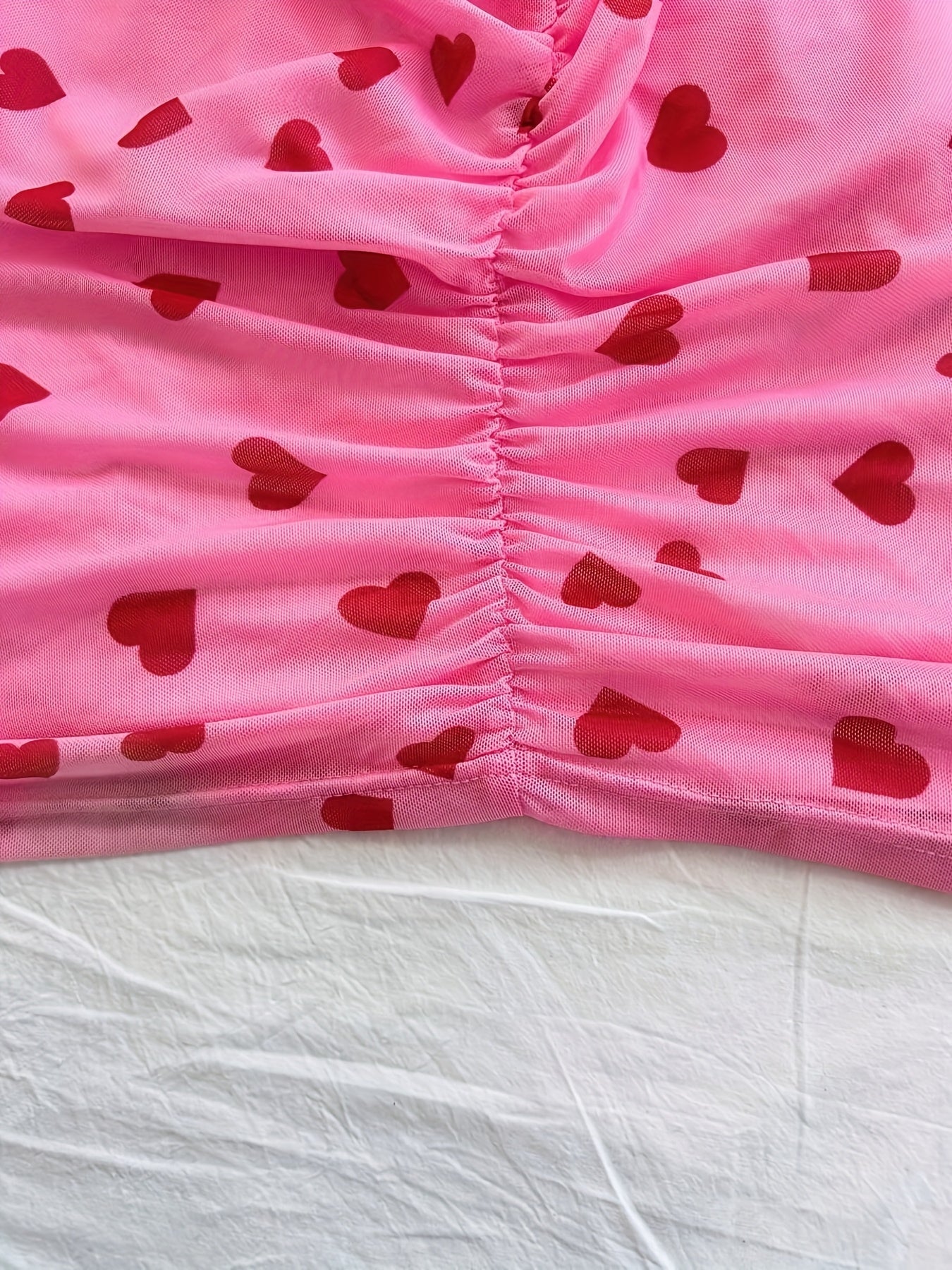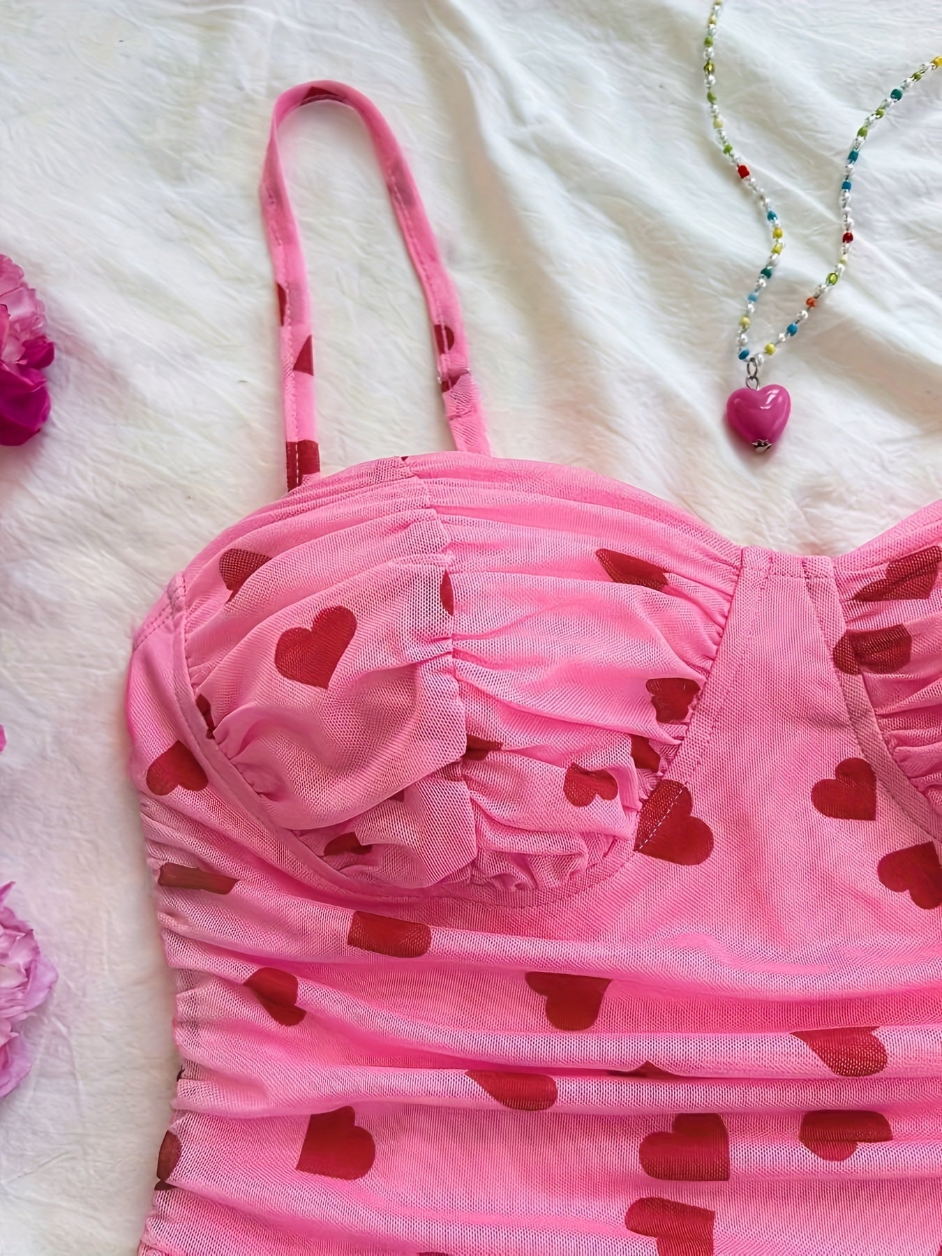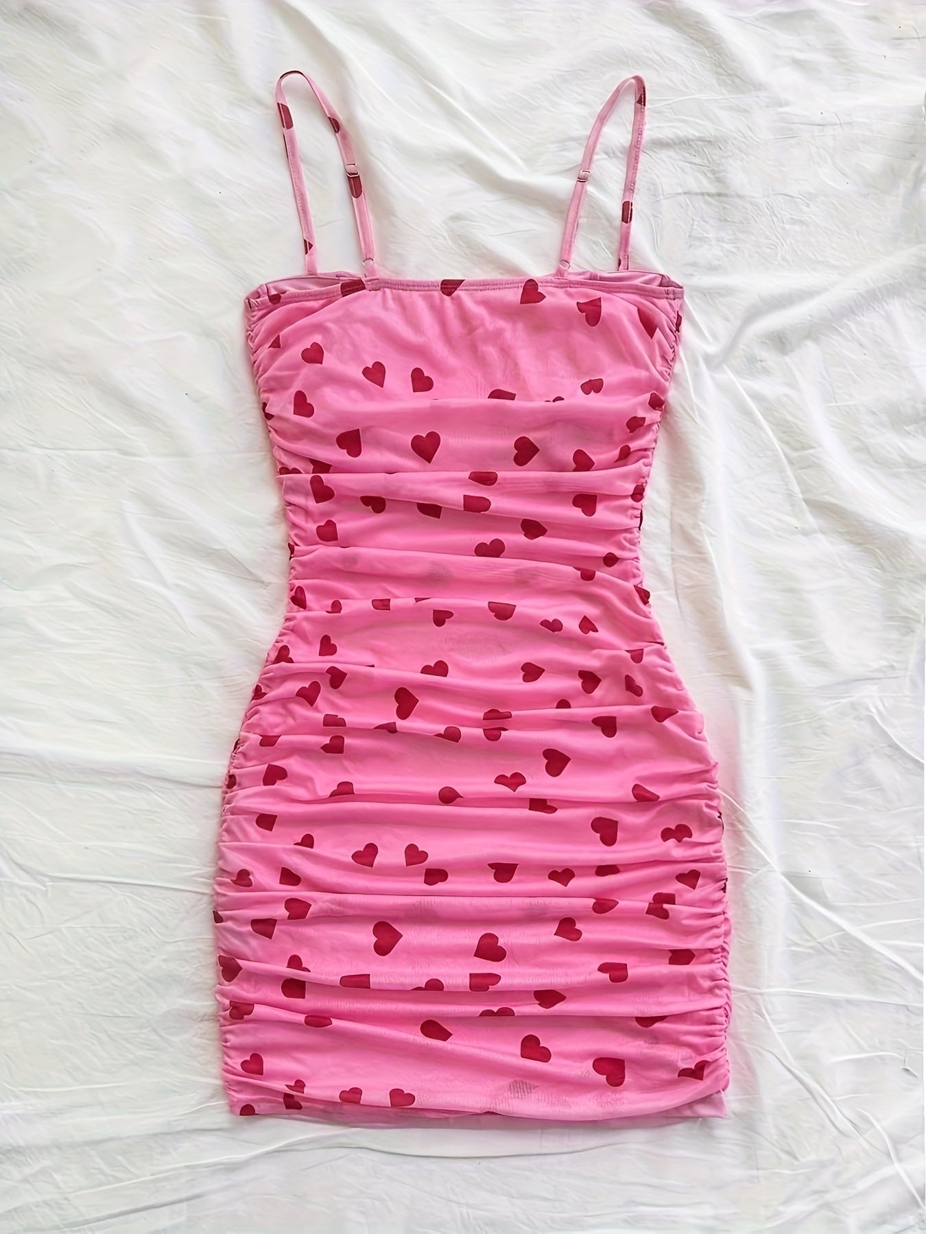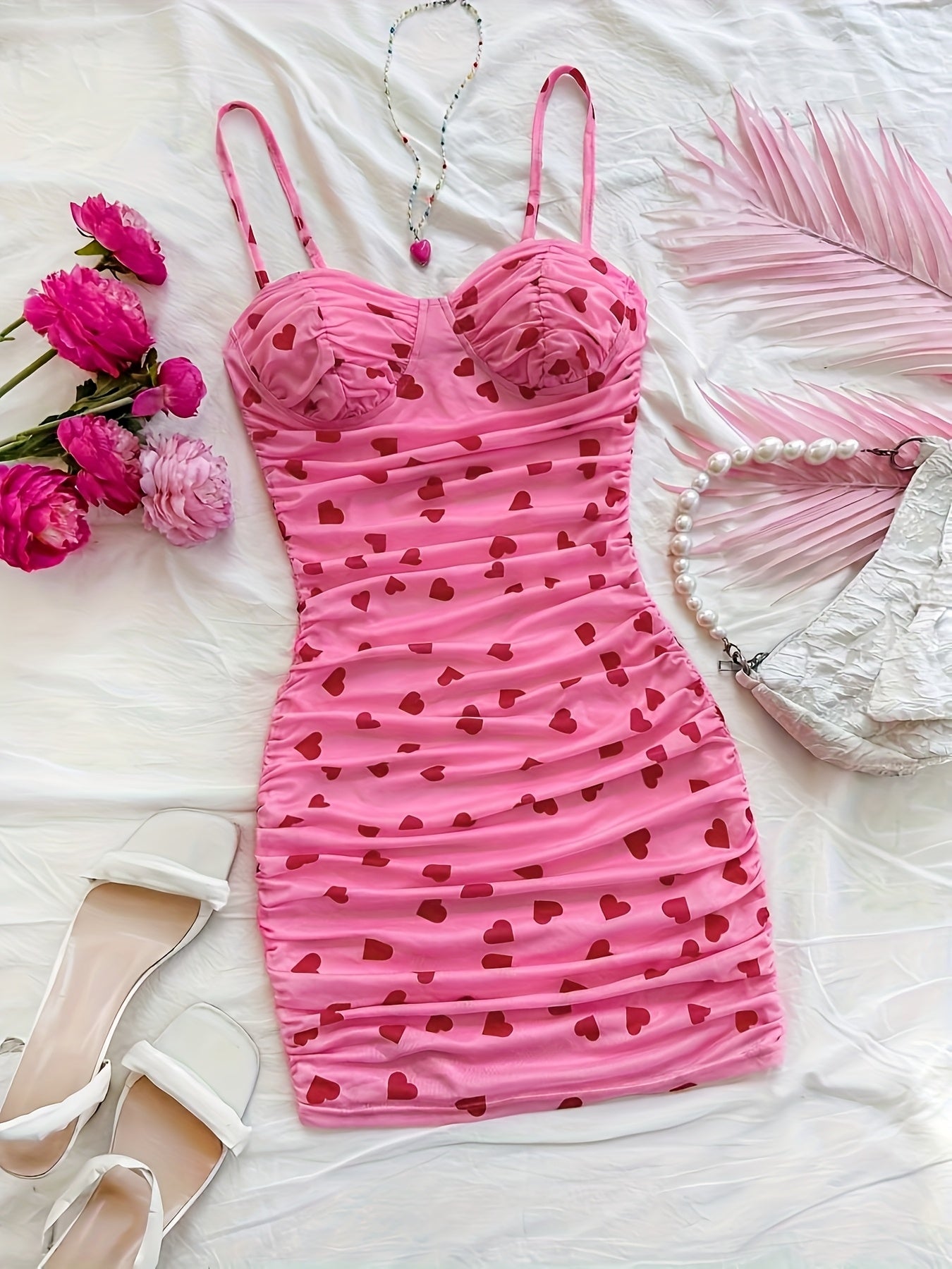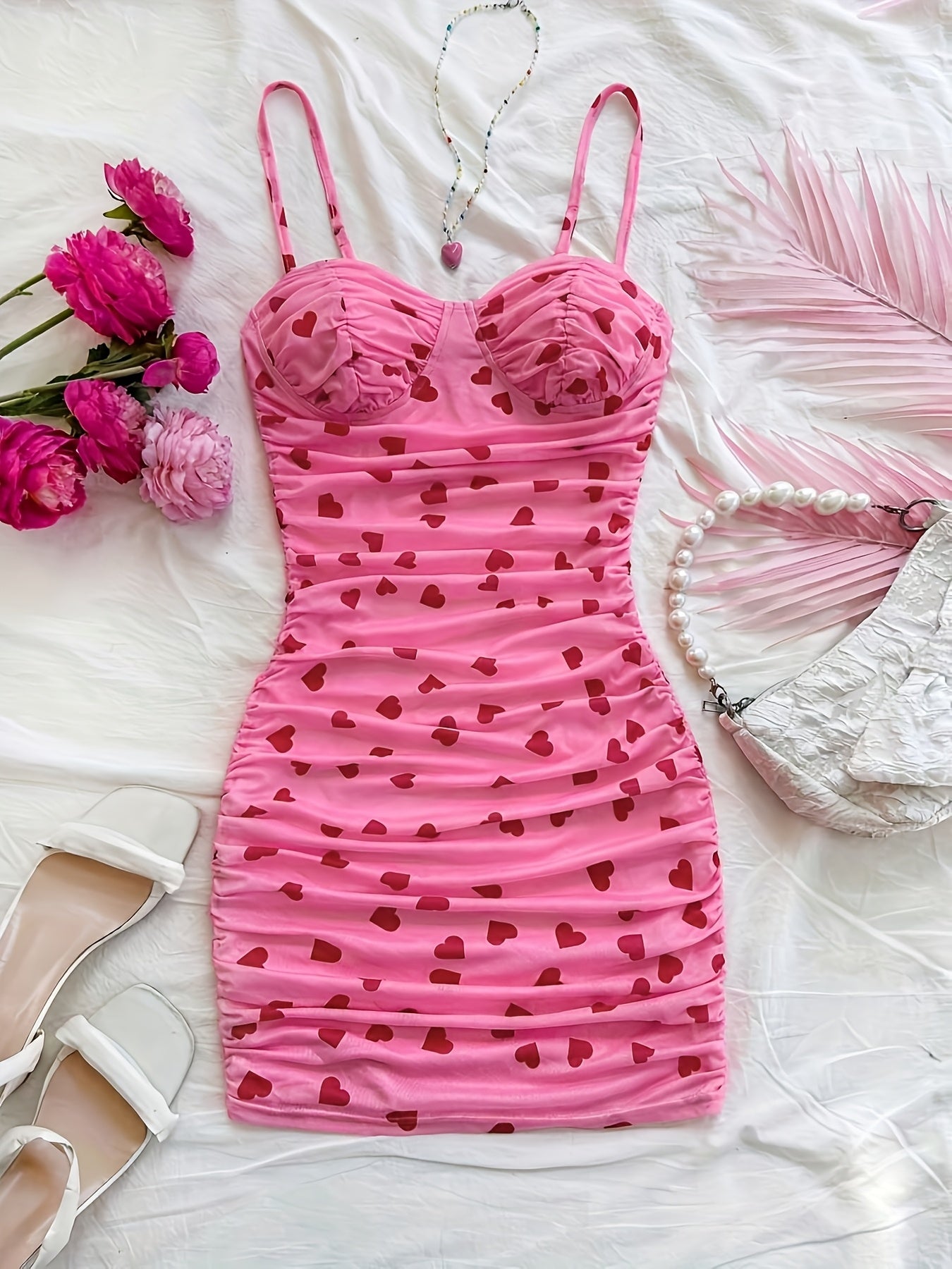 Women's Stylish Pink Heart Print V-Neck Cami Dress - Sleeveless Ruched Bodycon Summer Dress for Casual or Vacation Wear, Romantic Getaway Attire | Vneck Dress | Gathered Detailing
