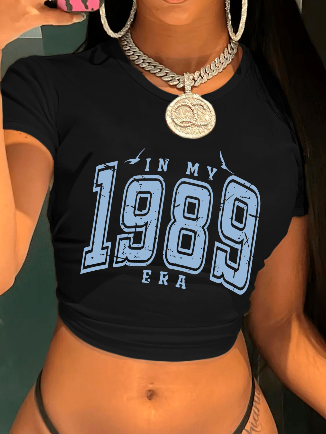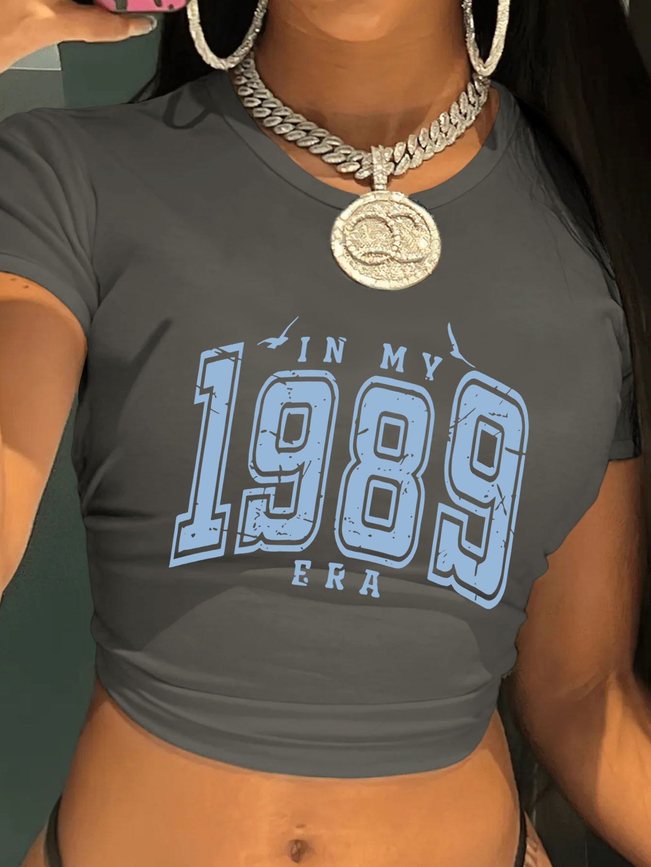 Women'S Y2K Graphic Crop Top T-Shirt - "In My 1989 Era" Letter Print, Short Sleeve, Crew Neck, Lightweight Polyester, Spring/Summer Casual Wear
