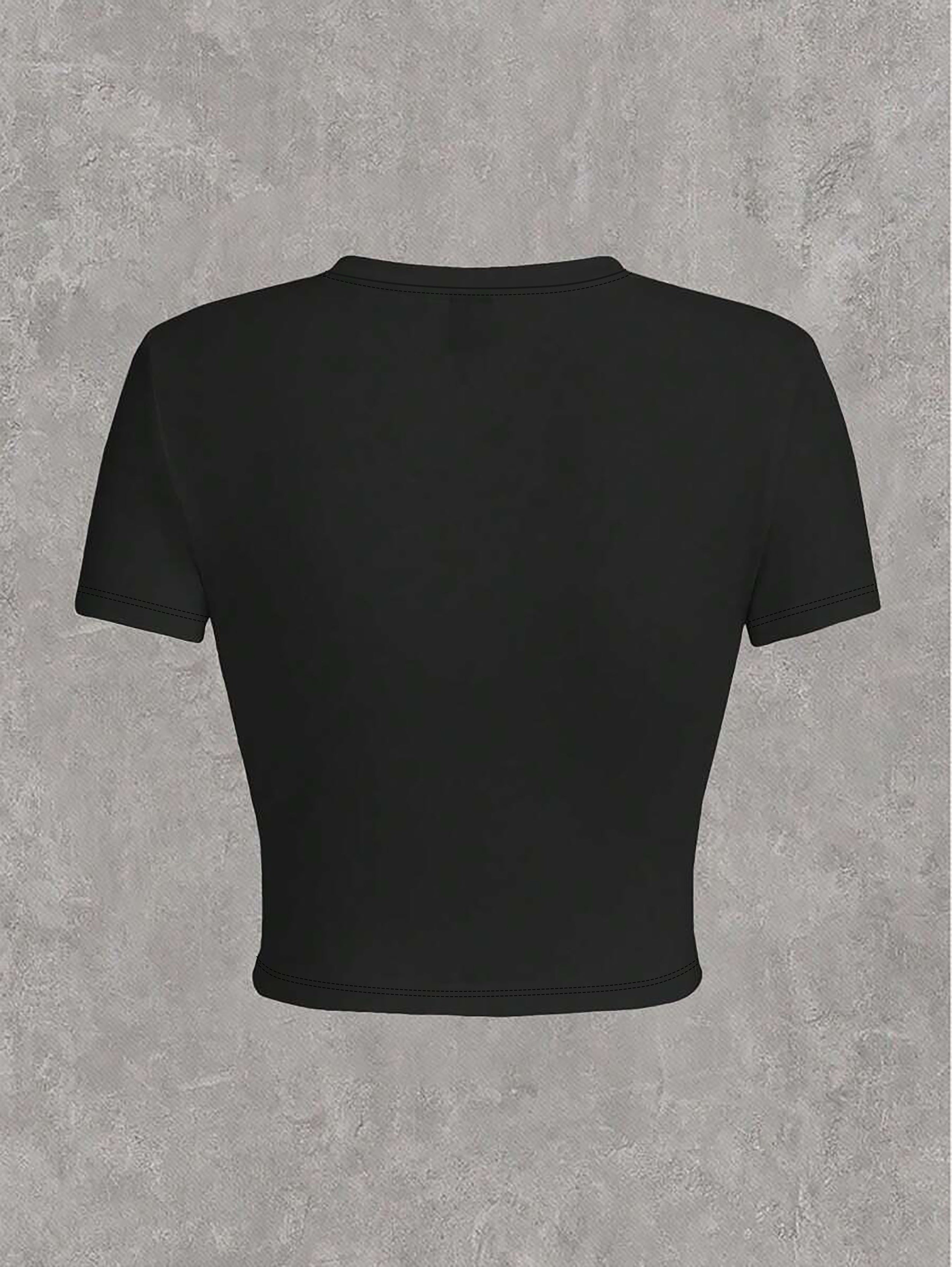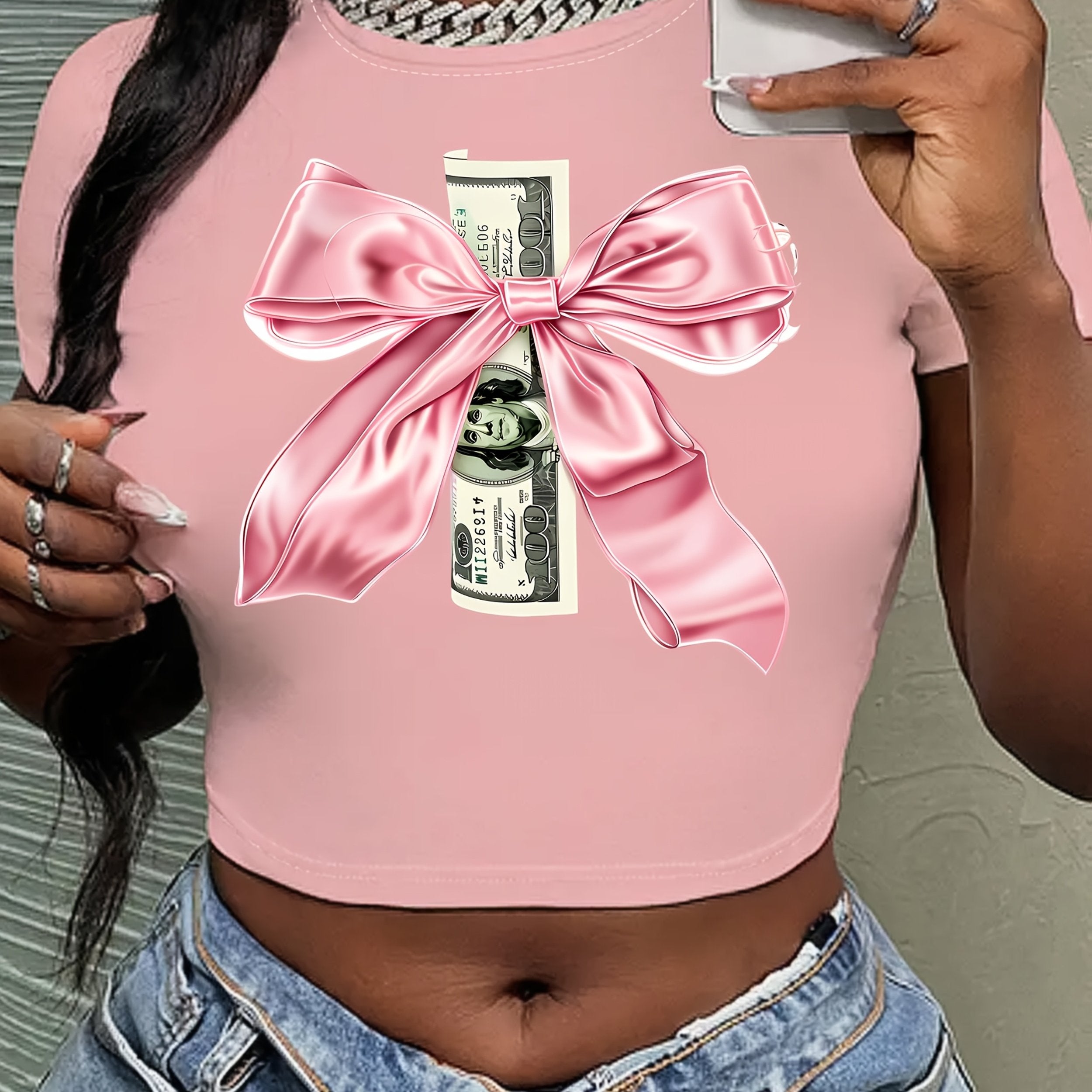 Women'S Y2K-Inspired Pink Bow & Dollar Bill Graphic Crop Top T-Shirt - Short Sleeve, Butterfly Print, Medium Stretch, Spring/Summer Casual Wear, Casual Wear | Playful Print Top | Comfortable Fit, Y2K Fashion