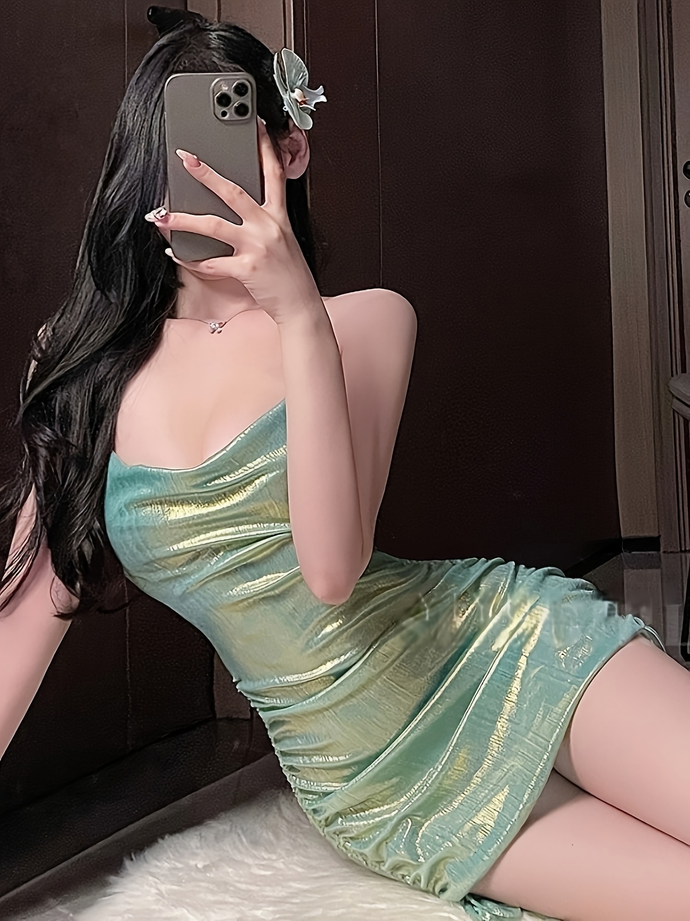 Women'S Sexy Shiny Fitted Bodycon Mini Dress, Polyester Knit Fabric, Solid Color, Backless with Drawstring Detail, for Night Out
