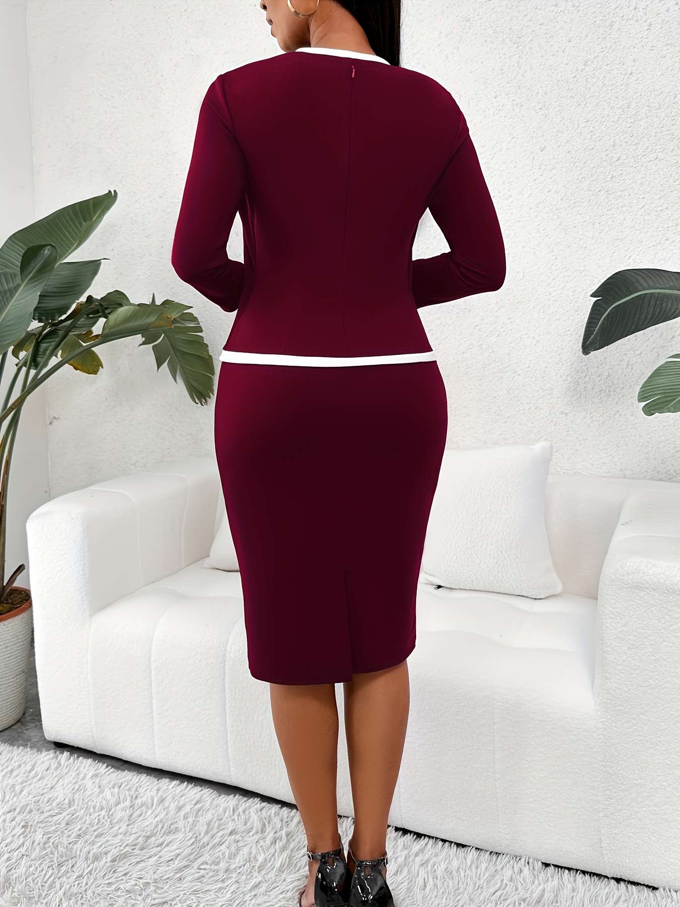 2 In 1 Contrast Trim Dress, Elegant Bodycon Long Sleeve Dress For Office & Work, Women's Clothing