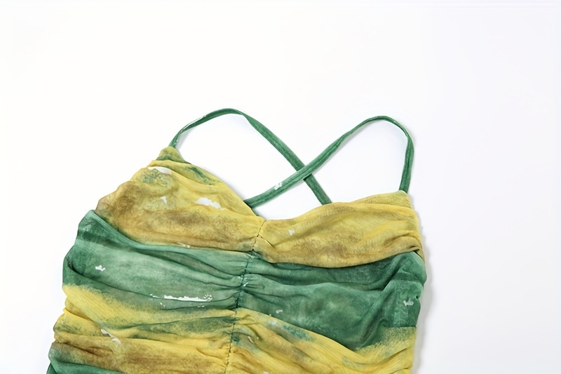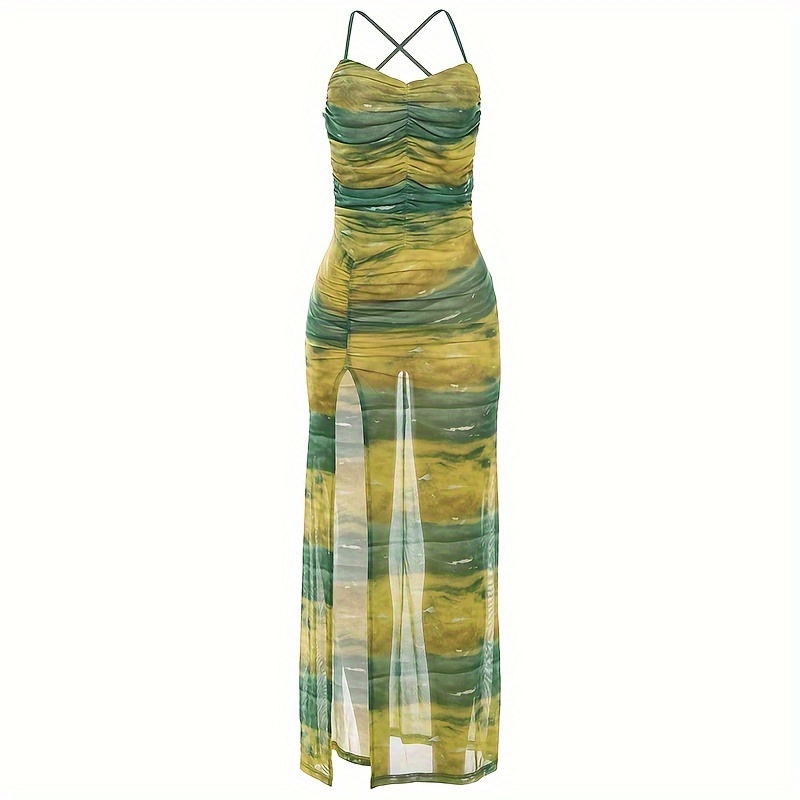 Backless Ruched High Slit Cami Dress - Sexy Slinky Sleeveless Maxi Dress - Polyester - For Spring & Summer - Women's Clothing - Perfect for Parties & Casual Occasions