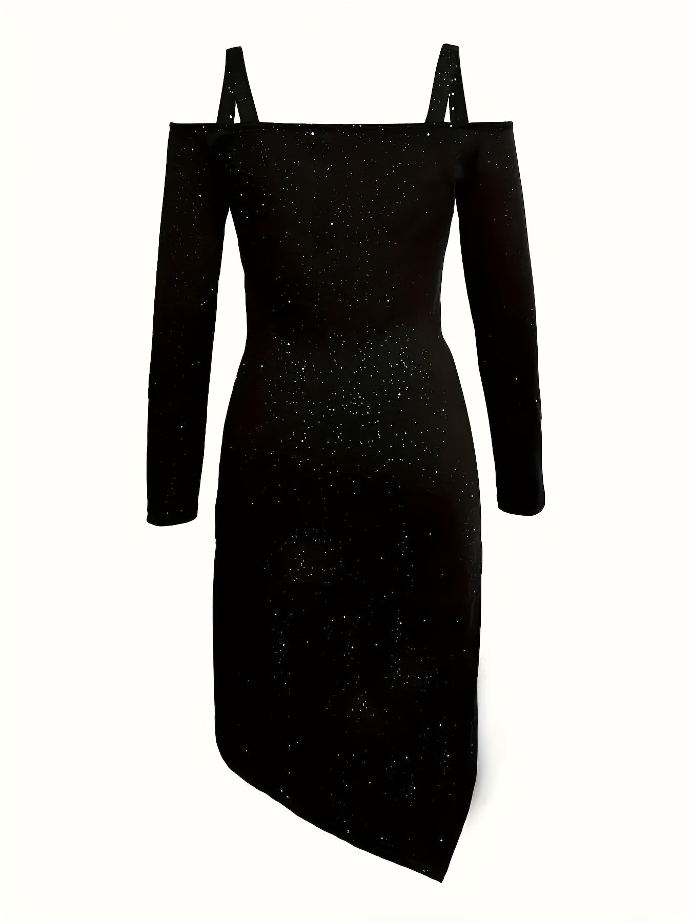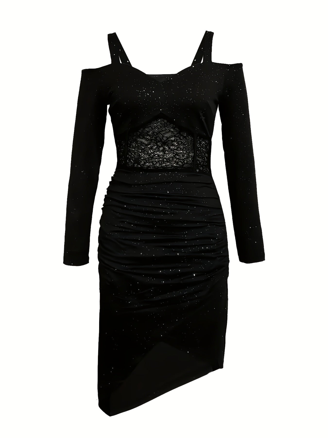 Elegant Off-Shoulder Lace-Trimmed Bodycon Dress for Women - Black with Sparkling Sequins, Ruched Front & High-Low Hemline, Stretchy Polyester Blend, Perfect for Parties & Formal Events, Stylish Women's Outfit | Offshoulder Go