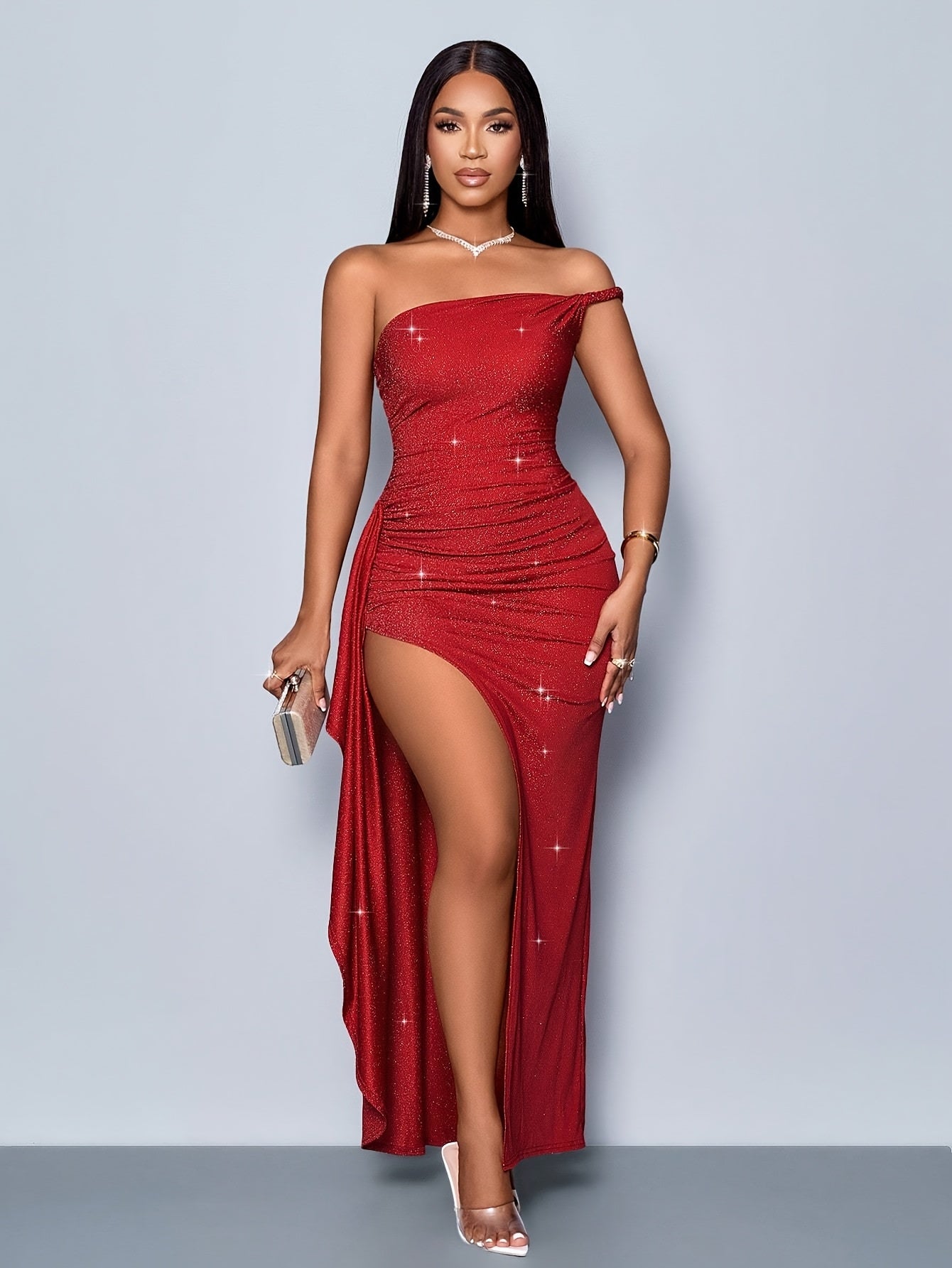Elegant Red Off-Shoulder Glitter Gown with Asymmetrical Ruffle Hem & High Side Slit - Perfect for Parties & Special Occasions, Special Occasion Dress | Asymmetrical Design | Shimmering Fabric, Party Dress