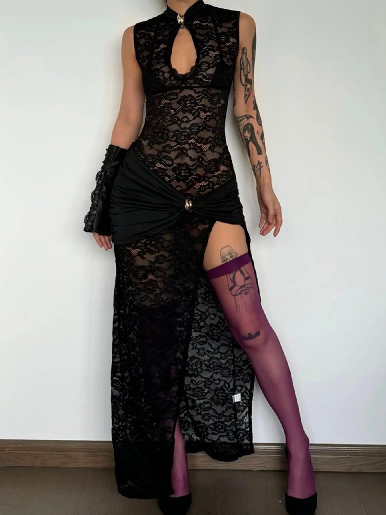 Sexy Women's Lace Hollow Out High Slit Sleeveless Dress - Black with White Lace Print, Slim Fit Semi-Sheer Bodycon Dress, Machine Washable & Dry Cleanable for Parties, Night Out, European & American Fashion, Lace Dress, Party