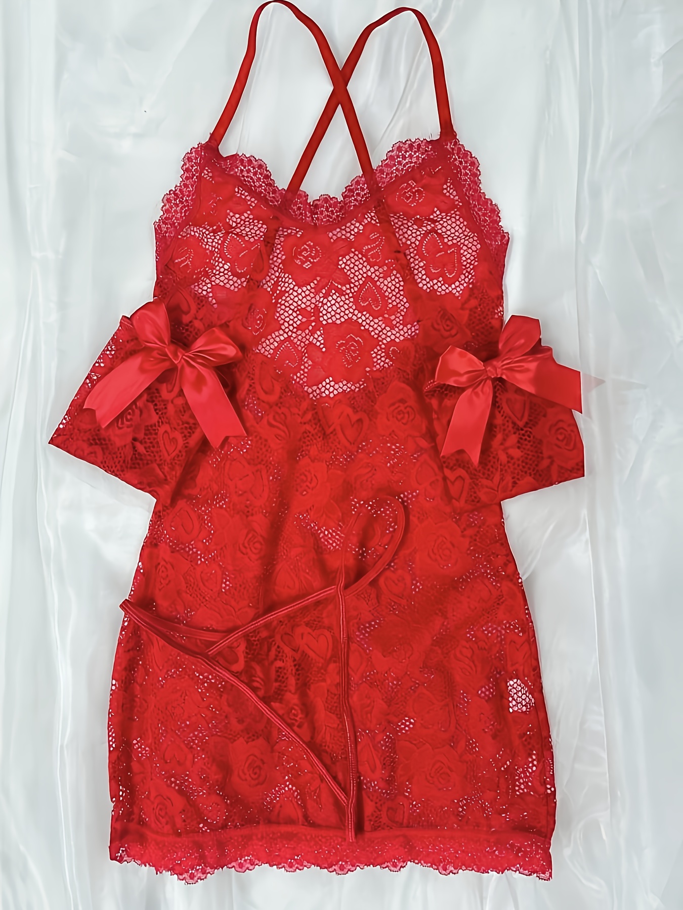 Women'S Sexy Red Lace Dress with Rose Floral Pattern - Off-Shoulder, Long Sleeves, Thong Panties Set for Adult, Adult Date Night Attire|Elegant Lace Dress|Thong Panties, Lace Dress