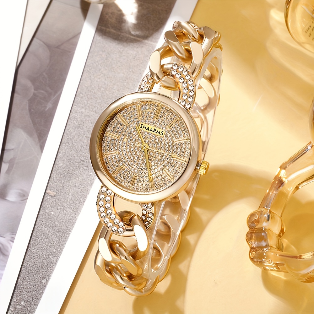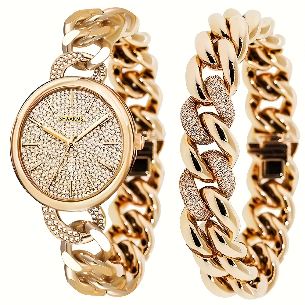 2pcs Elegant Women's Golden-Toned Quartz Watch with Sparkling Rhinestone Dial & Chunky Chain Bracelet Set - Perfect Fashion Gift for Her, Women's Fashion Accessory|Coordinated Outfit|Alloy Construction