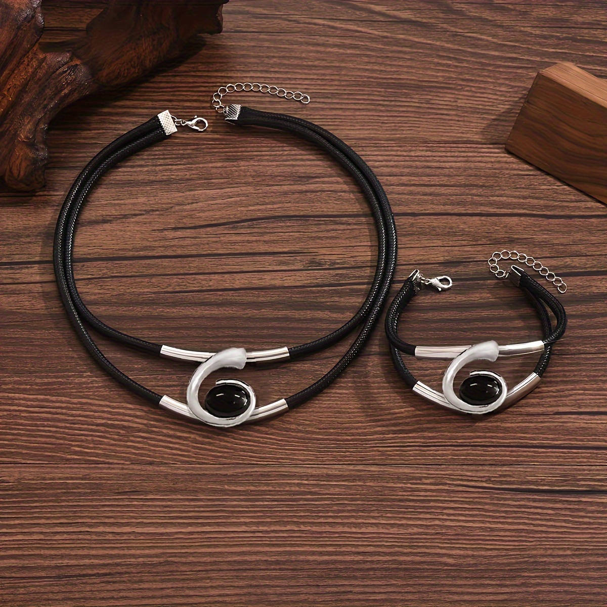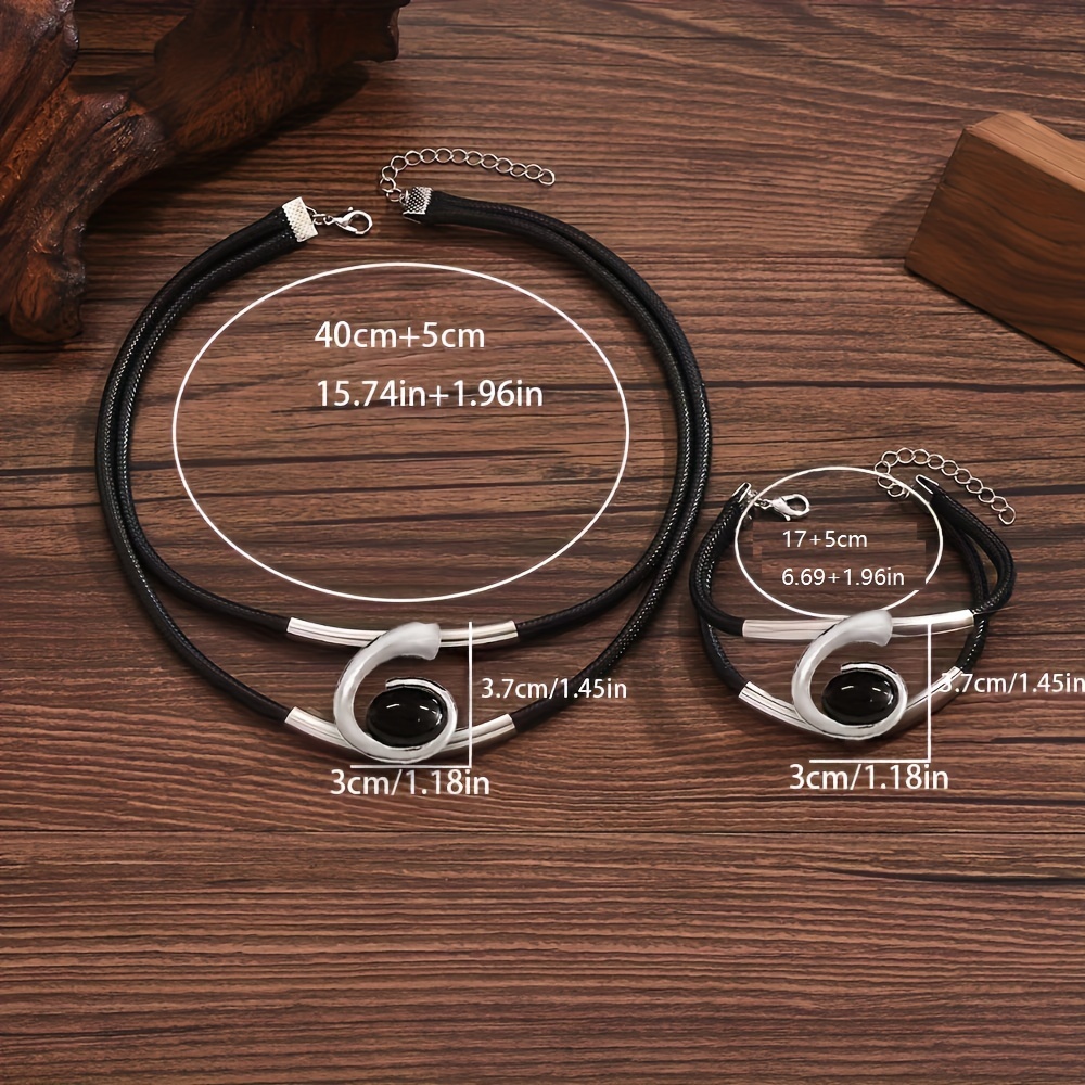 2pcs set of fashionable double-row black imitation PU braided rope through metal pipe + black resin geometric spiral creative necklace bracelet set, Women's daily party versatile jewelry set