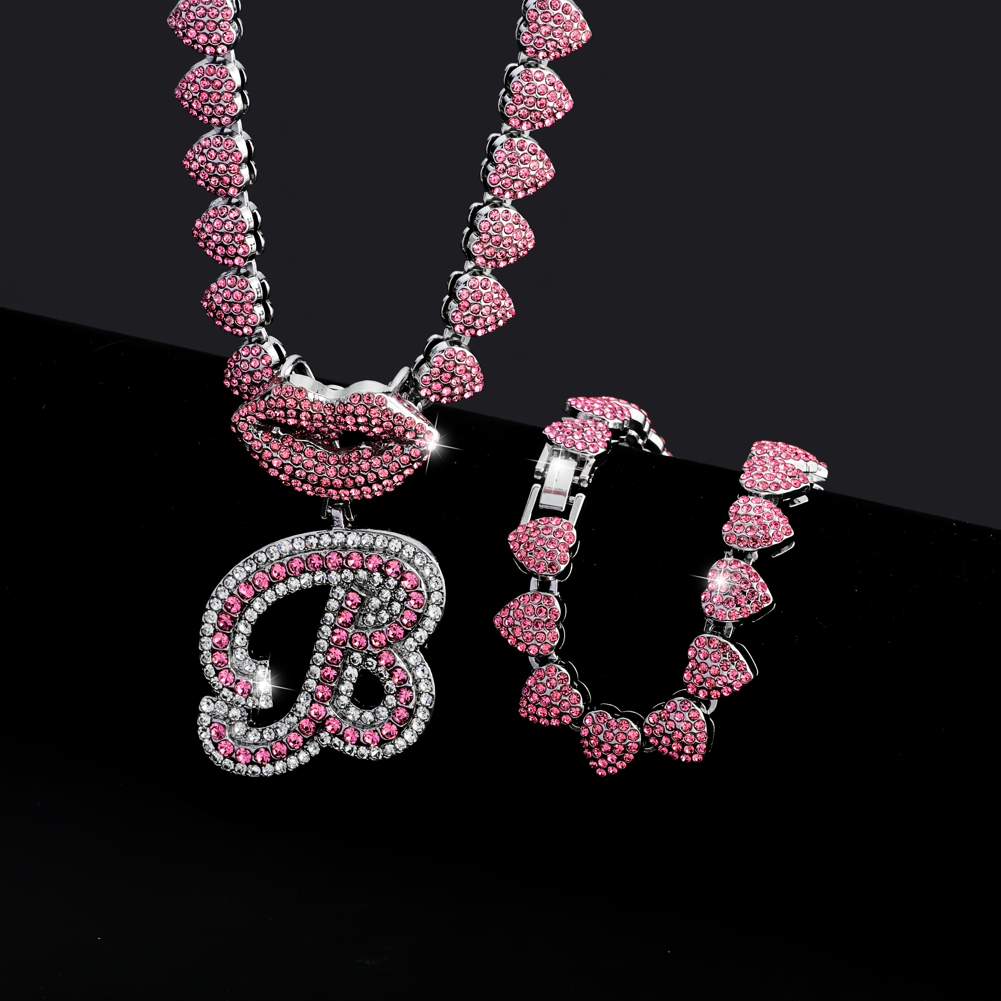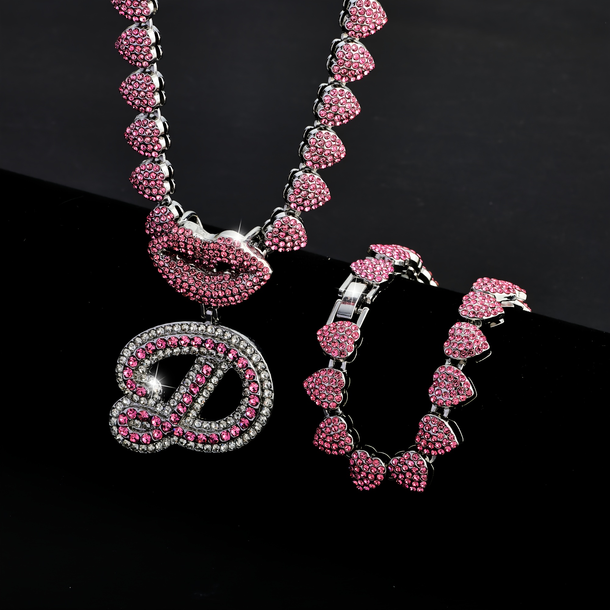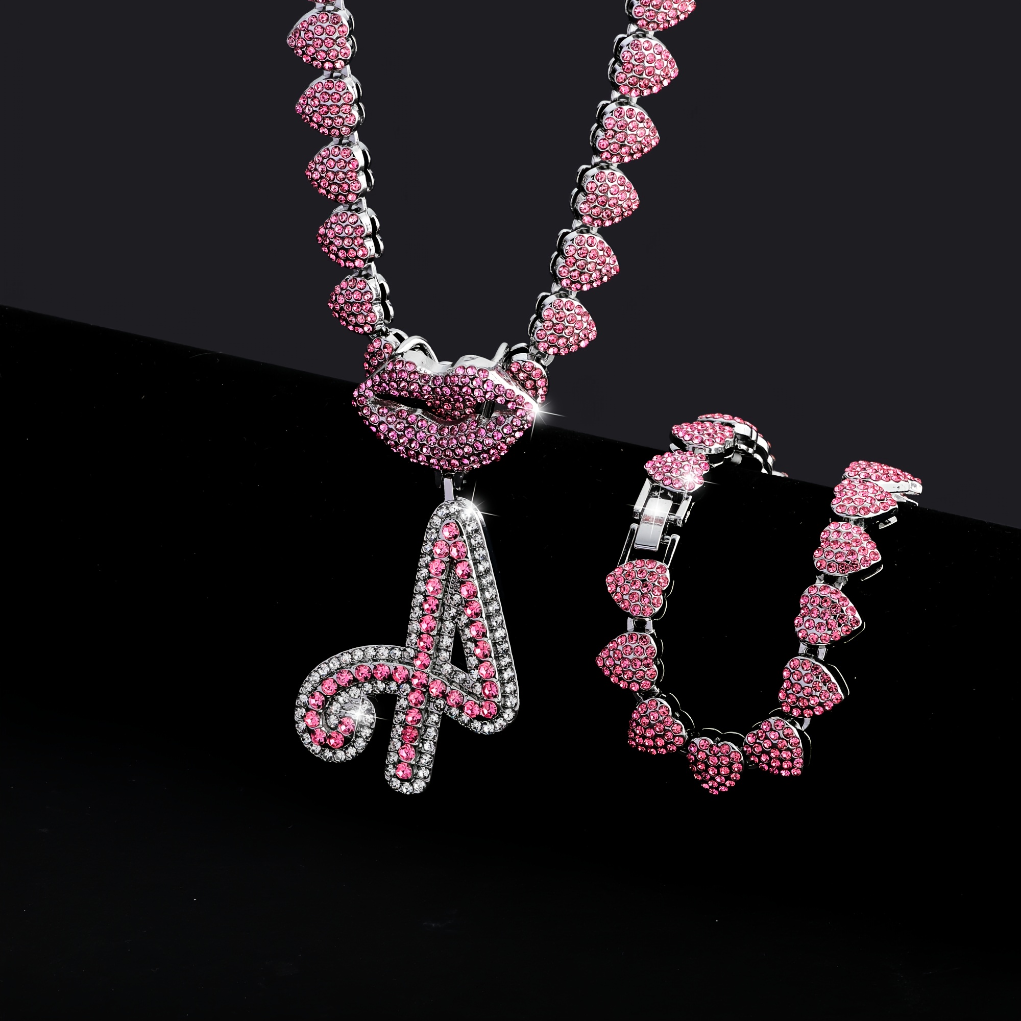 Hip Hop Y2K Style Pink Sexy Lips Pendant Necklace and Bracelet Set, A-Z Initials, Rhinestone Inlay, Zinc Alloy, Perfect for Daily Wear or Parties, Ideal Valentine's Day Gift for Men and Women, Hip Hop Jewelry