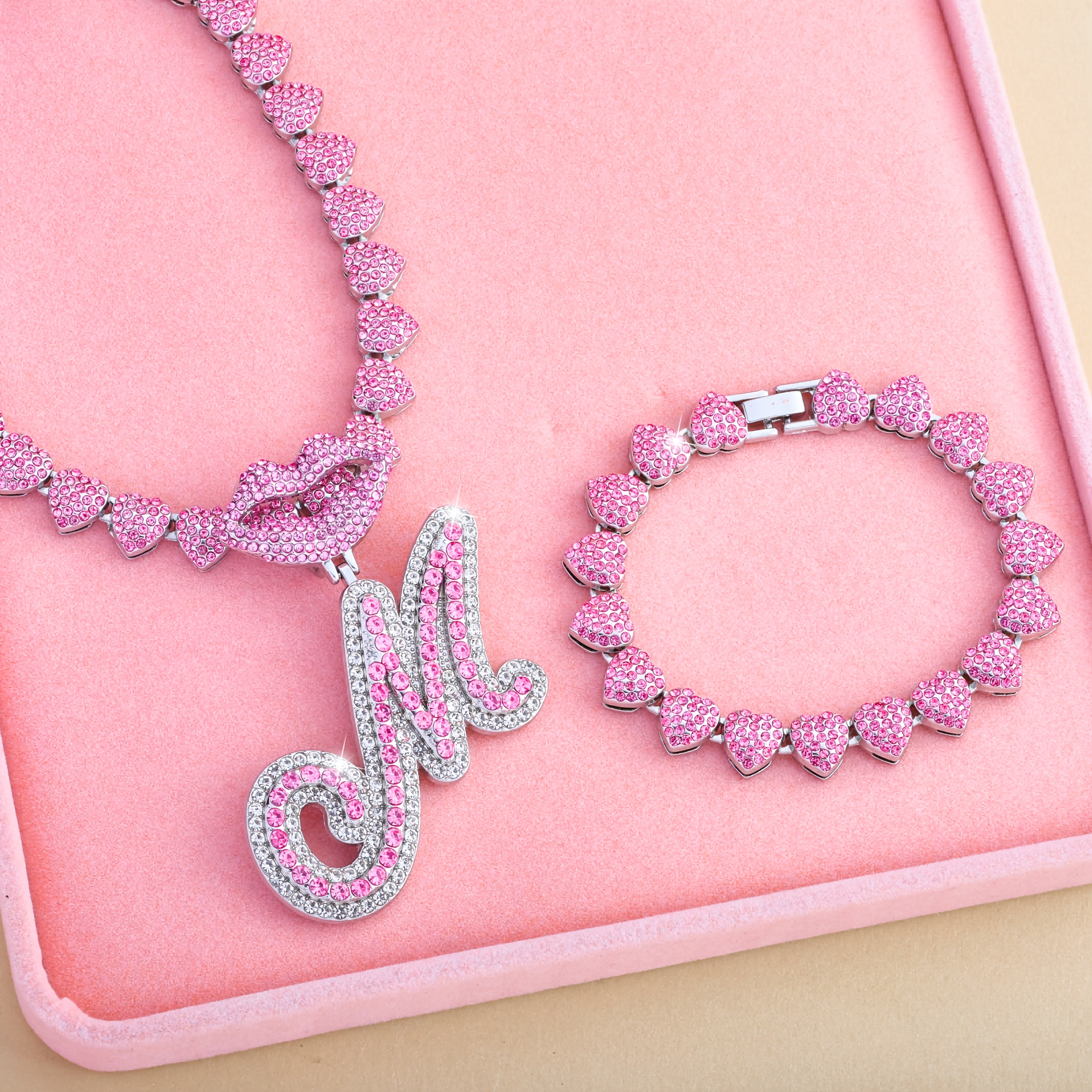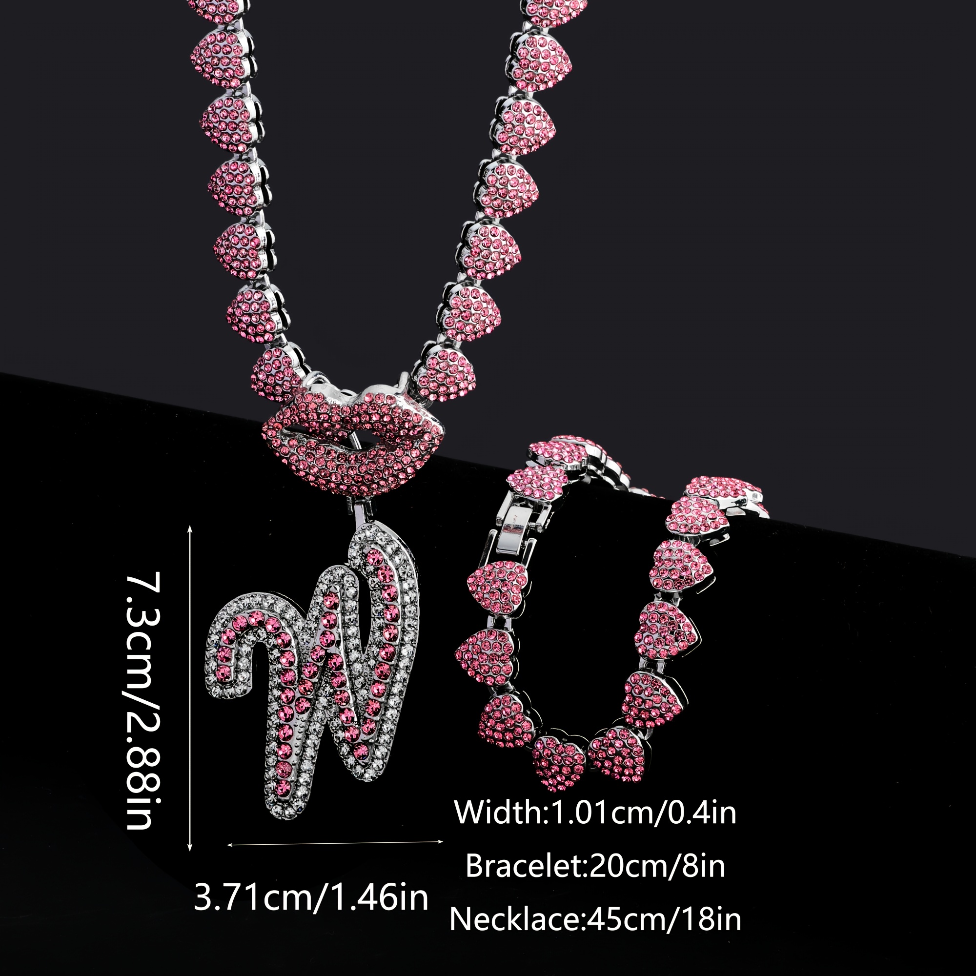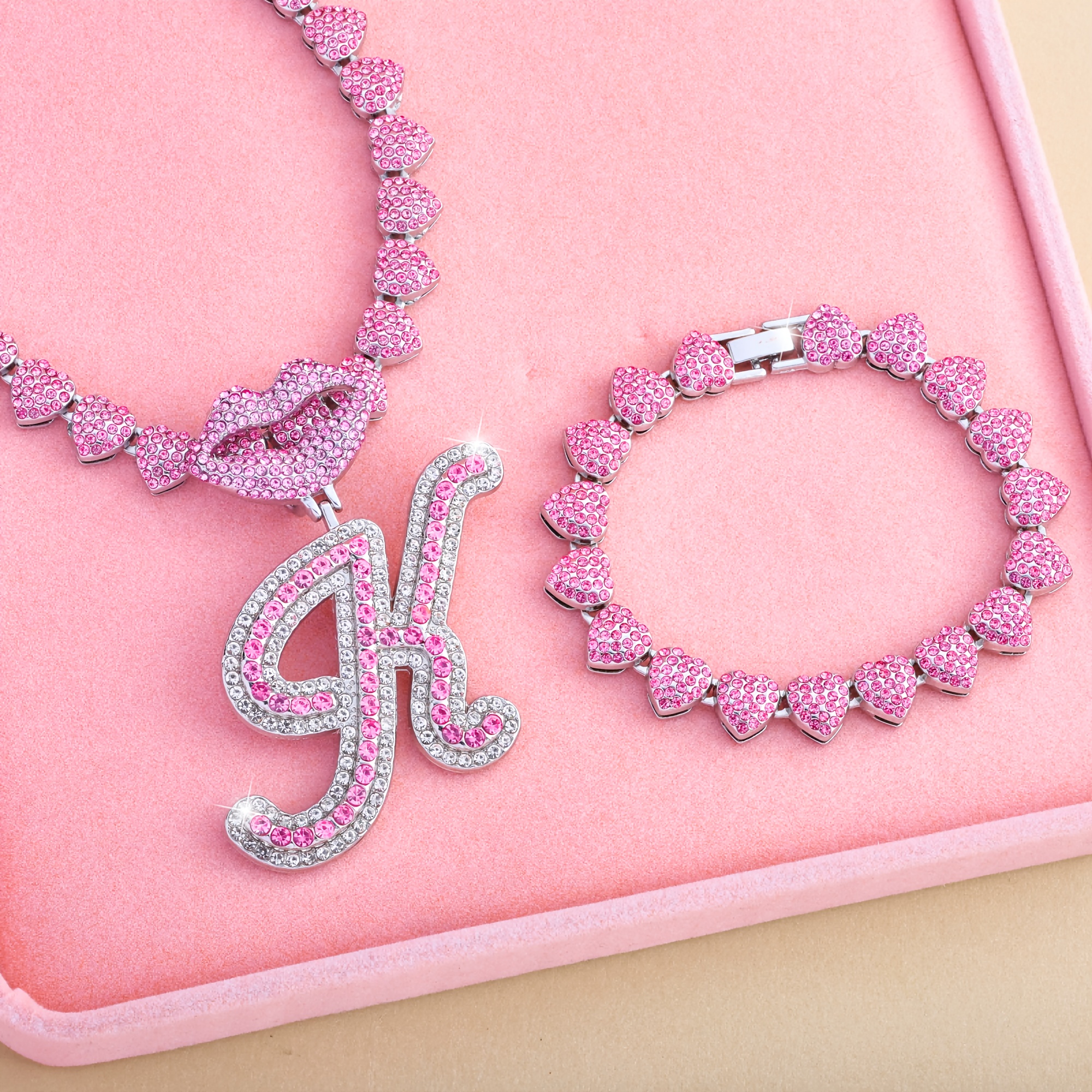 Hip Hop Y2K Style Pink Sexy Lips Pendant Necklace and Bracelet Set, A-Z Initials, Rhinestone Inlay, Zinc Alloy, Perfect for Daily Wear or Parties, Ideal Valentine's Day Gift for Men and Women, Hip Hop Jewelry