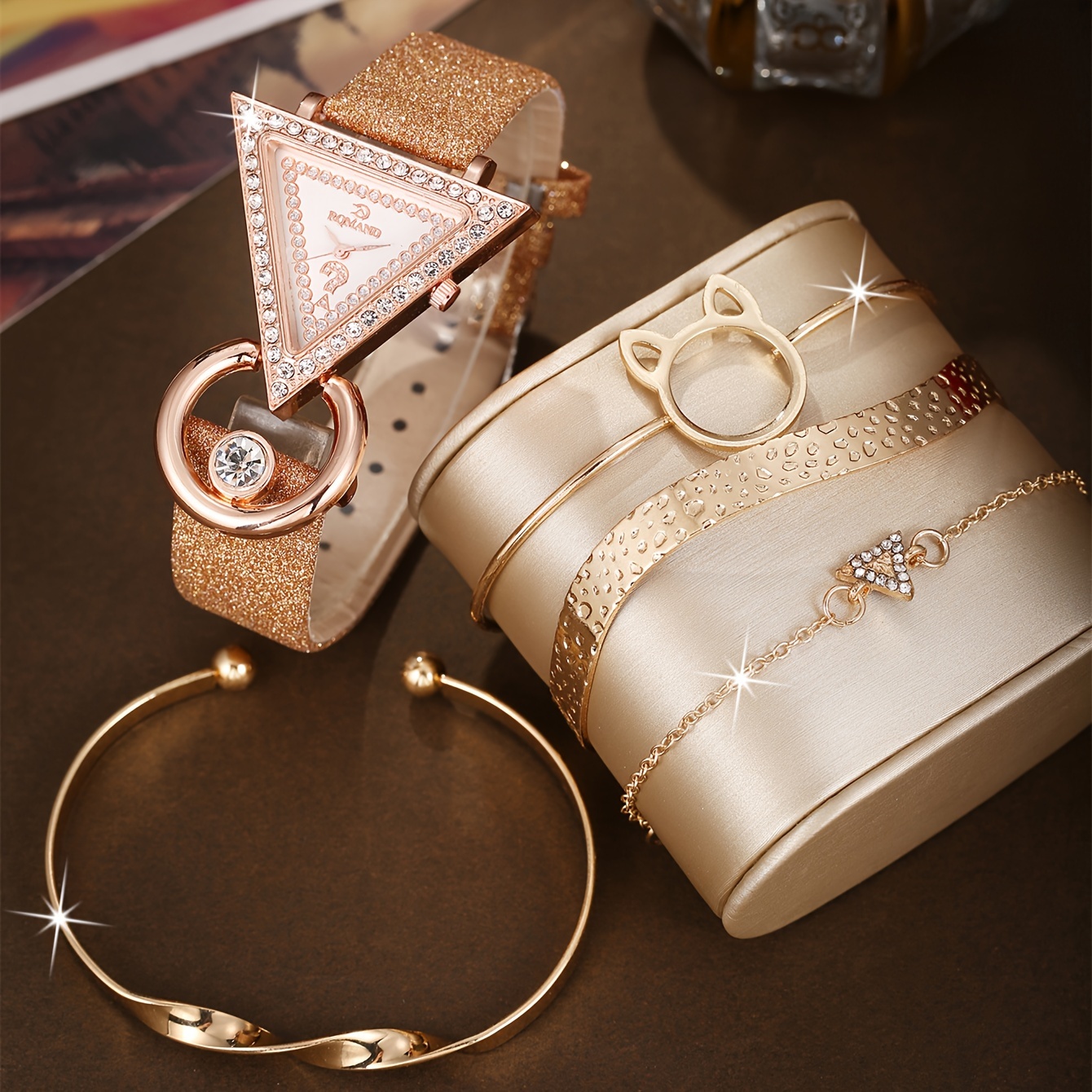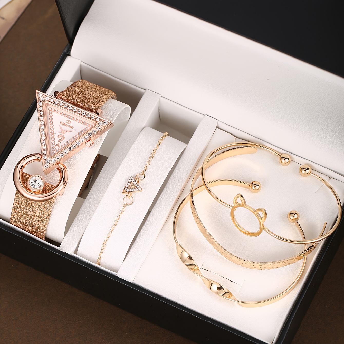 Luxury 5-Piece Women's Quartz Watch and Bracelet Set with Glittering Triangle Dial, PU Leather Band, Electronic Quartz Movement, Zinc Alloy Case, and Rhinestone Accents (Non-rechargeable Button Battery Included)