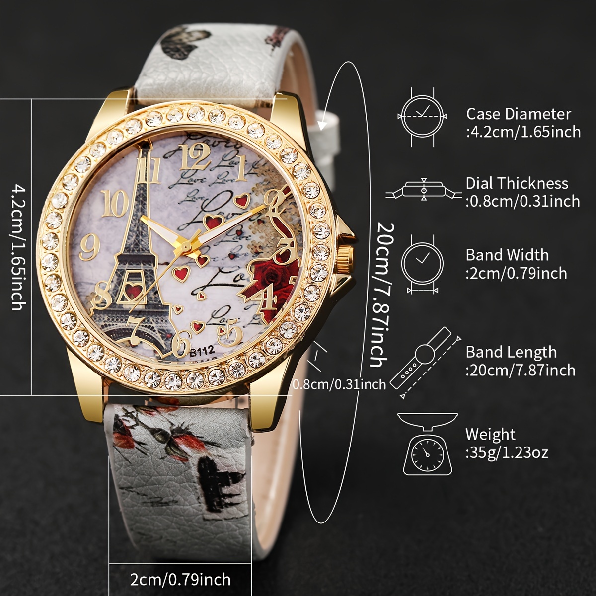 [Popular Choice] Ladies' Fashion Quartz Wristwatch with Digital Eiffel Tower Dial and Bracelet Set, 5pcs - Faux Leather Strap, Alloy Case, Non-Rechargeable Button Battery