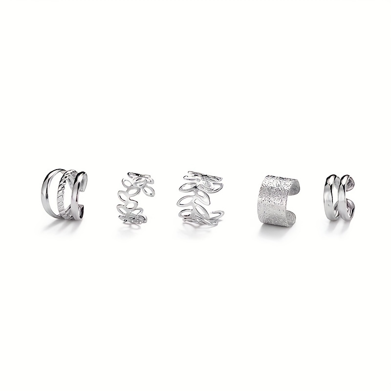 Add a touch of nature-inspired elegance to your daily look with this 5-piece set of hollowed-out leaf ear cuffs. Crafted from lightweight iron with a refined, minimalist design, these non-pierced clip-ons are perfect for creating layered ear styles without the need for actual piercings. Whether you’re dressing up for a casual outing or elevating your everyday fashion, these cuffs deliver charm and versatility in every detail.