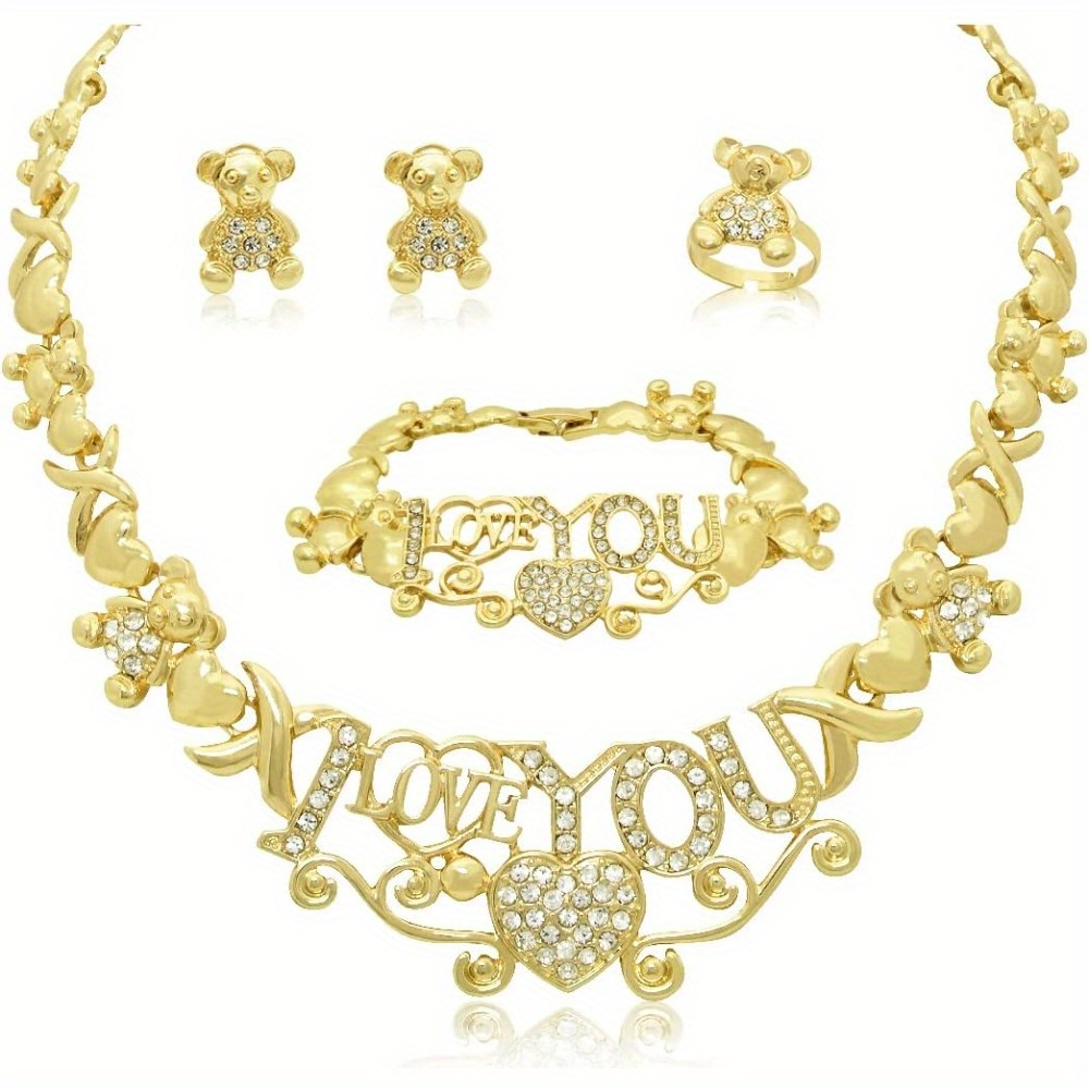 Women Jewelry Necklace Set 18K Gold Plated Bride Bridesmaid Fashion Rhinestone Wedding Jewelry Necklace Earrings Bracelet Ring 4 Pieces Set