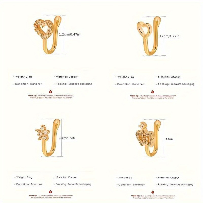 Upgrade your look with this chic 9-piece set of non-piercing nose rings! Each clip-on nose ring is designed with comfort and style in mind—no piercing needed. Featuring playful shapes like stars, hearts, and crowns, these gold-plated U-shaped rings are adorned with sparkling zirconia stones for a fashionable edge. Perfect for festivals, Mardi Gras, vacations, or everyday flair.