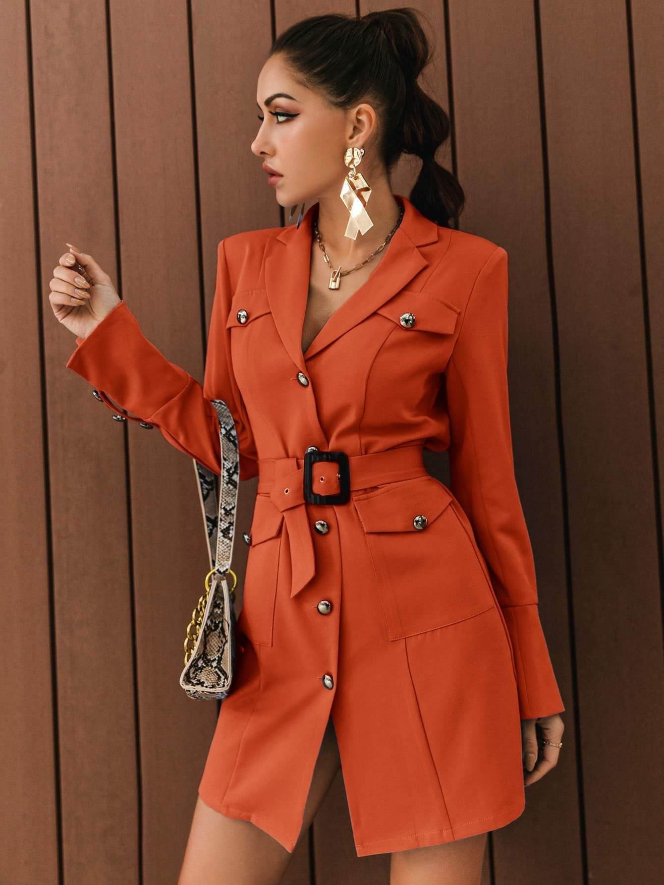 GLAMAKER BUTTON FRONT BELTED BLAZER DRESS Women's Casual Jacket Fashion Beauty Button Front Belted Blazer Dress Unique Comfortable Charming Lovely