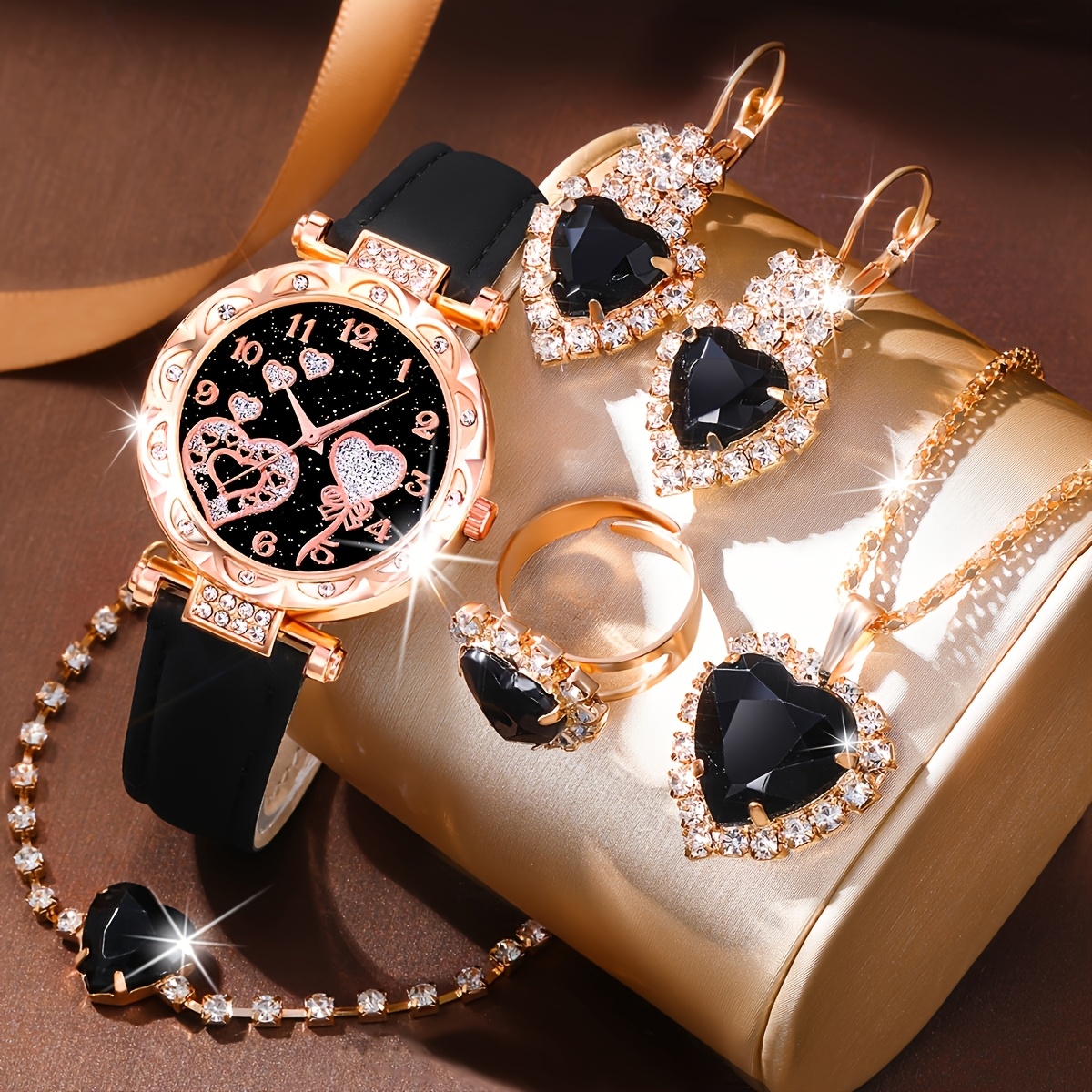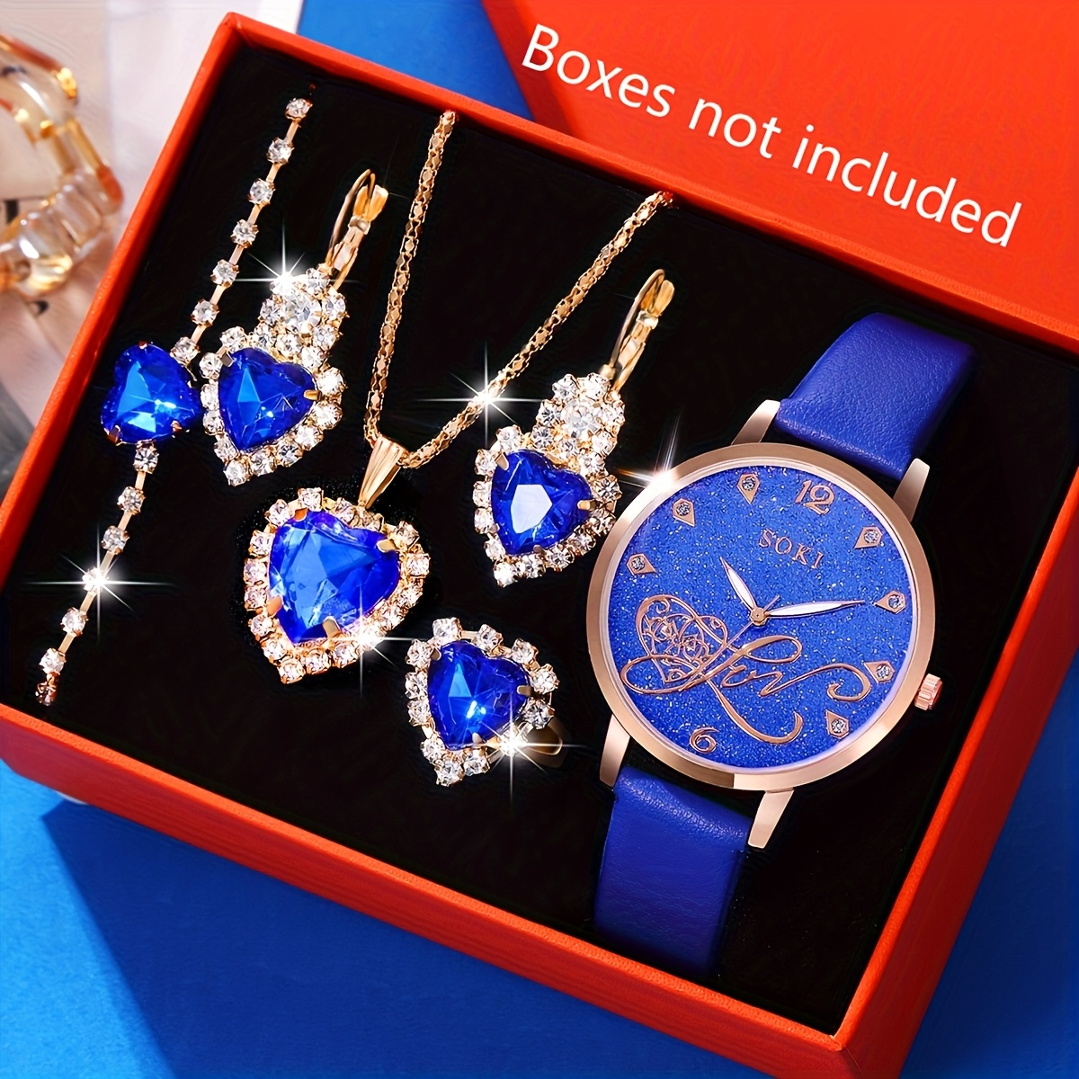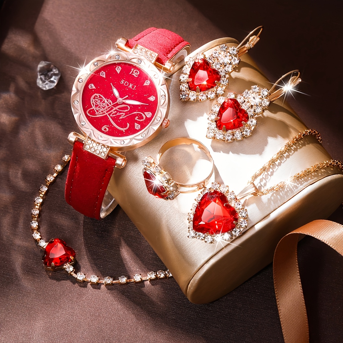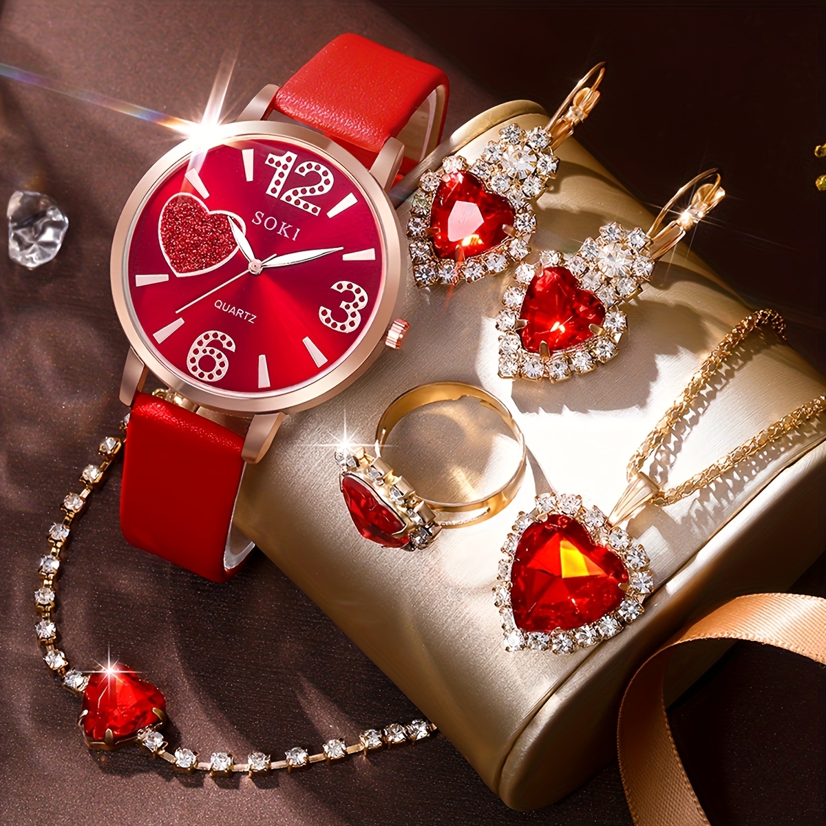 6pcs/Set SOKI Women'S Watch, Glamorous Round Digital Quartz Faux Leather Strap Alloy Case Heart Pendant Necklaces, Earrings, Rings, Bracelets Accessories with Non-rechargeable Button Battery (Diameter<20mm) for Women's, Mot