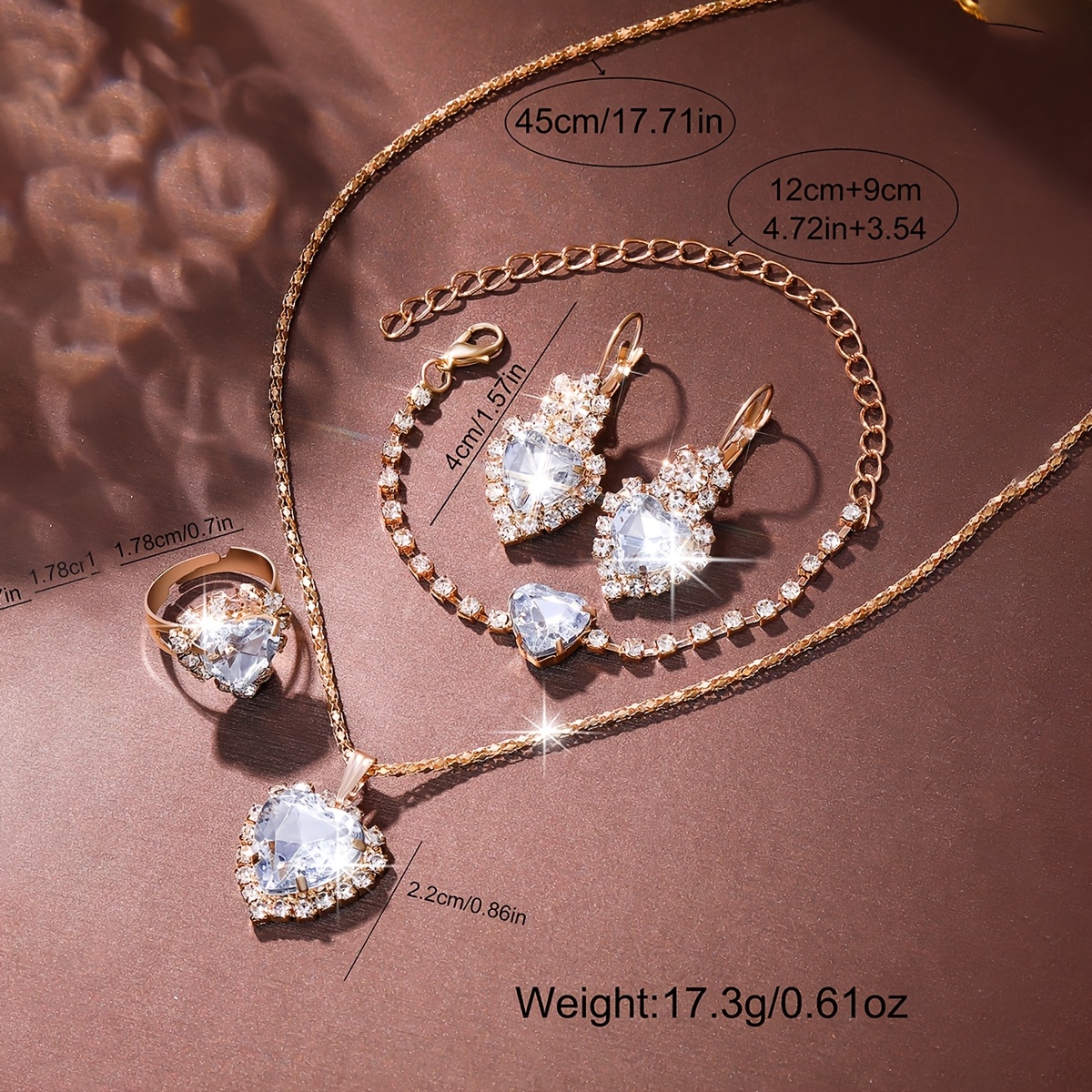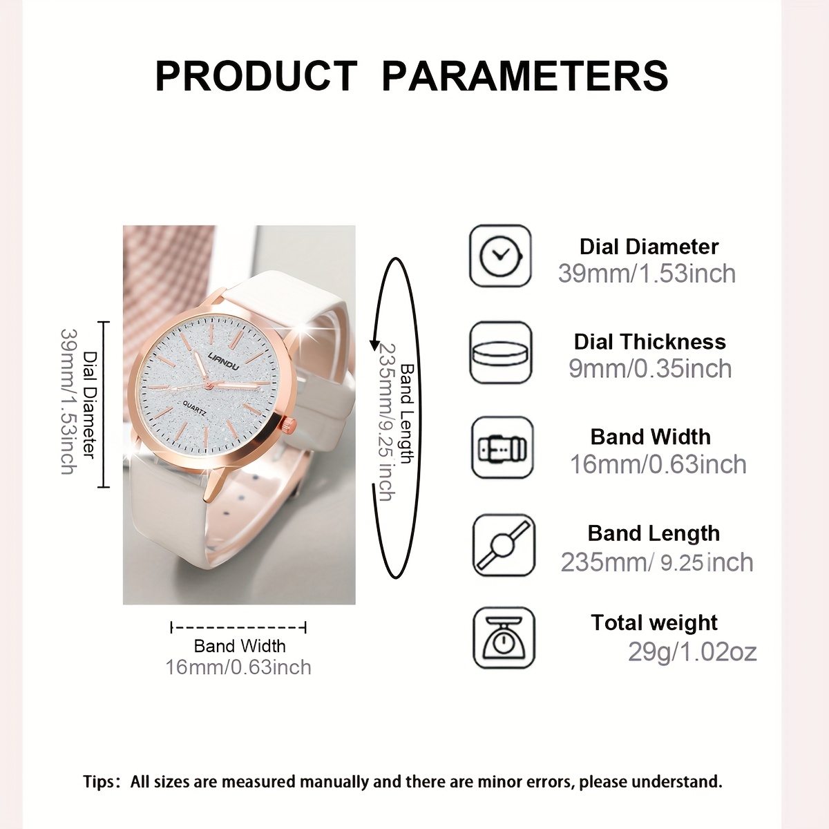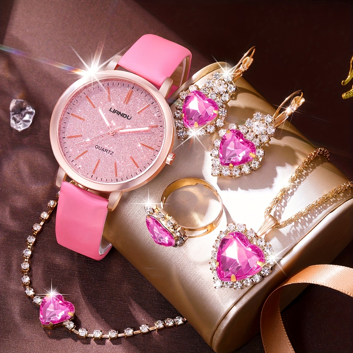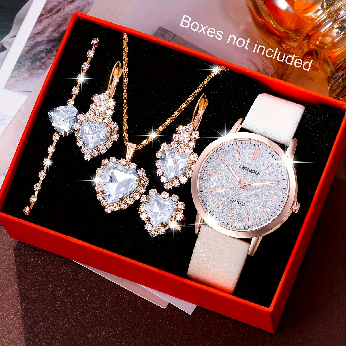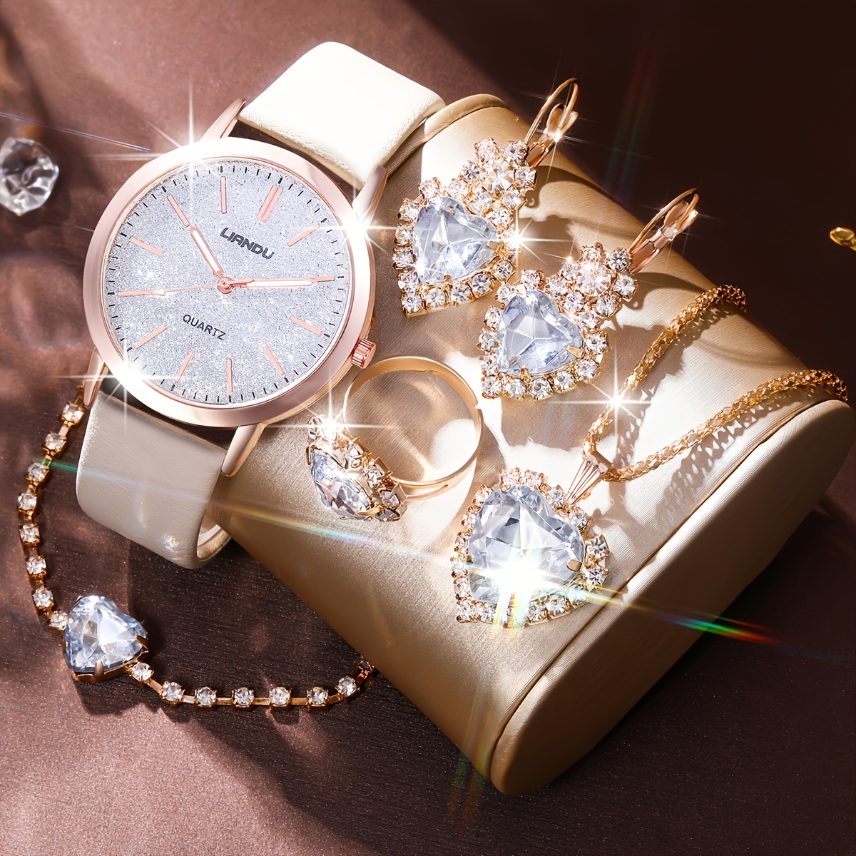 6pcs/Set SOKI Women'S Watch, Glamorous Round Digital Quartz Faux Leather Strap Alloy Case Heart Pendant Necklaces, Earrings, Rings, Bracelets Accessories with Non-rechargeable Button Battery (Diameter<20mm) for Women's, Mot