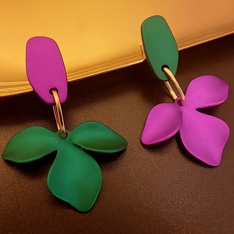 Elegant Asymmetrical Purple & Green Flower Drop Earrings - -Plated Alloy, 925 Sterling Silver Hooks, Perfect for Daily Wear, Parties, and Concerts, Everyday Earrings|Asymmetrical Earrings| Plated Earrings