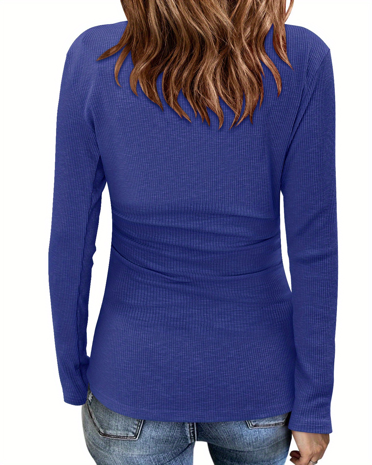 Women'S Basic Long-Sleeved Jumpsuit, Lapel Casual Shirt, Cute Crew Neck Ribbed Shirt