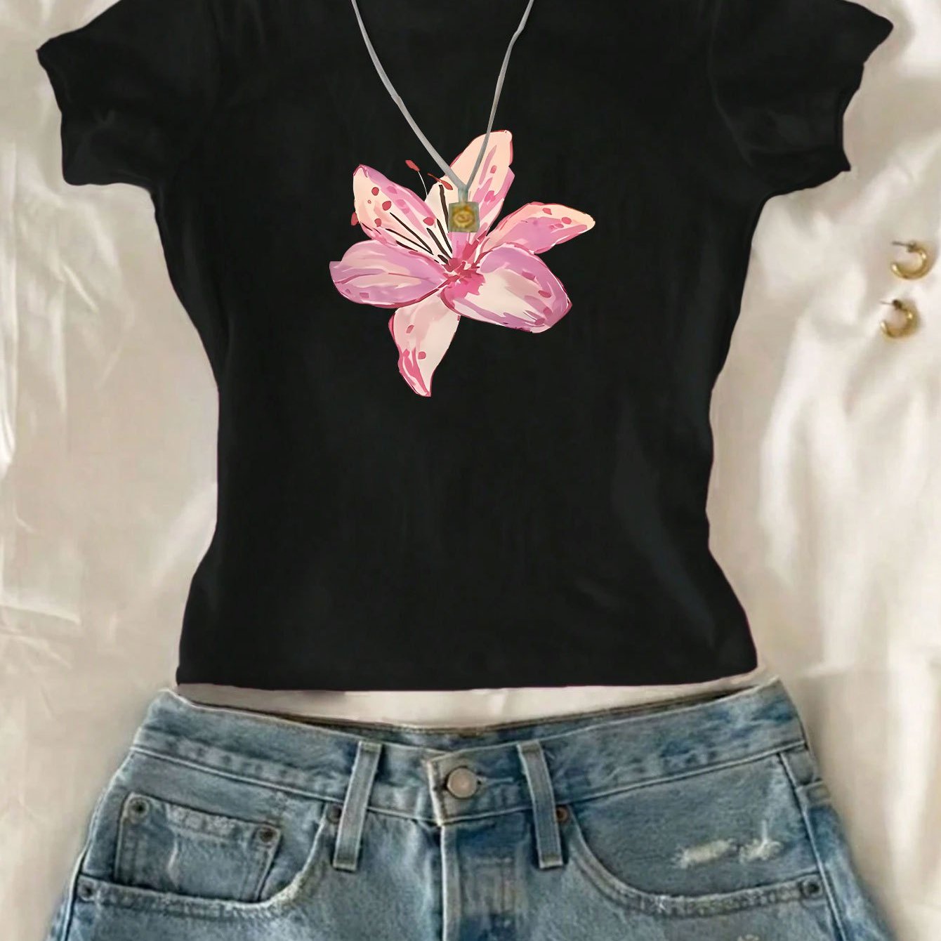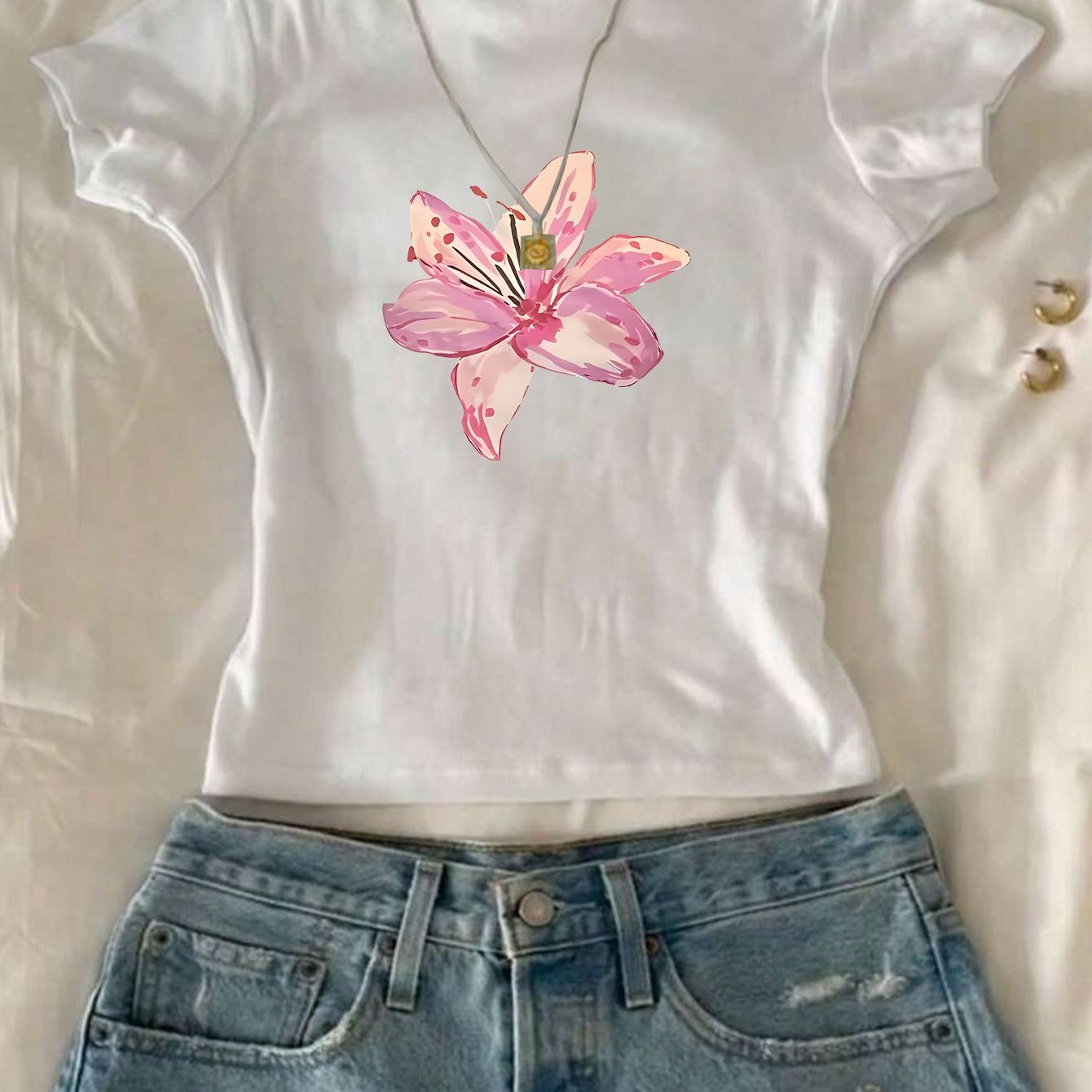Flower Printed Crew Neck T-Shirt, 100% Casual Fit Women'S T-Shirt Top, Summer And Spring Fashion