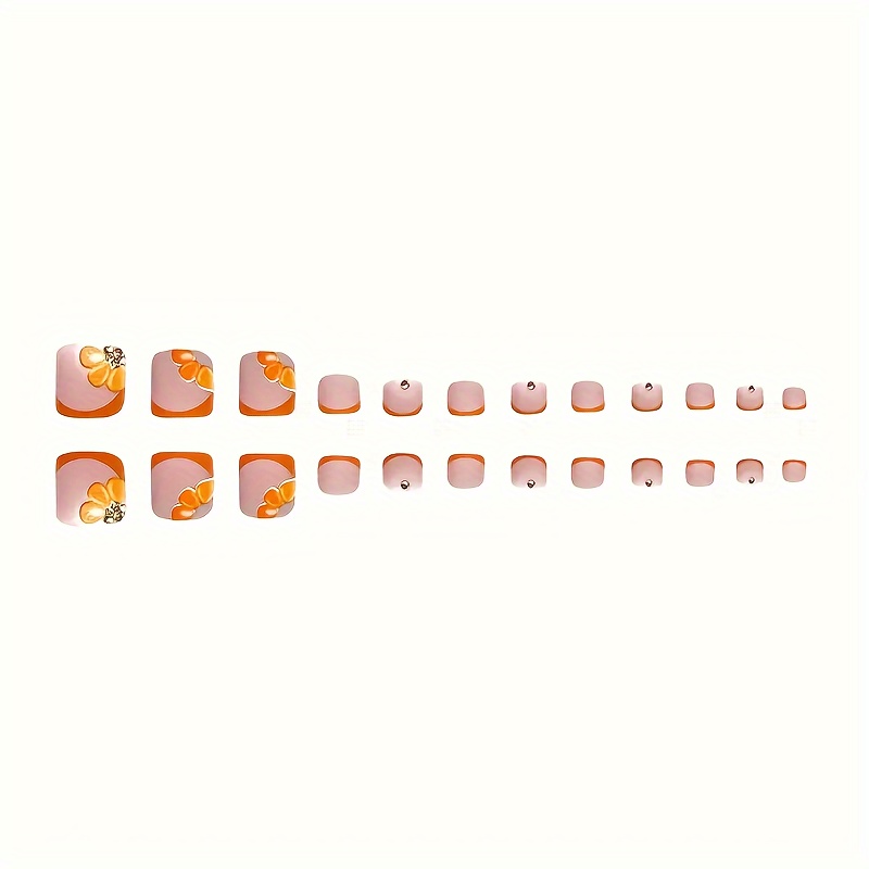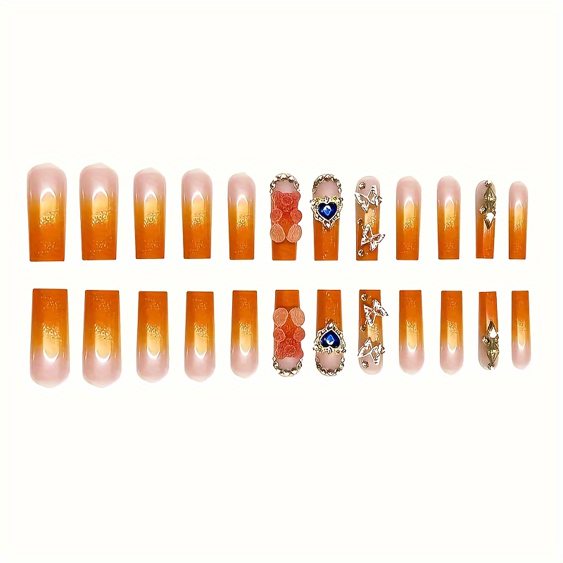 2 boxes of 48pcs European and American press-on nails, orange 3D bear heart butterfly flower glitter rhinestone high-end design water pipe style long false nails suitable for s and women daily wear, includes 2 jelly glue and