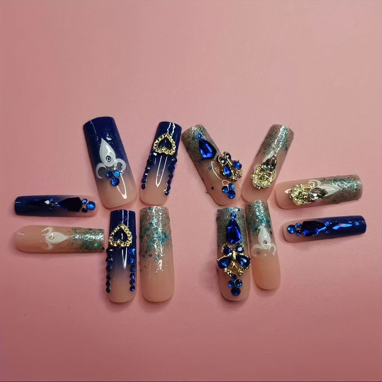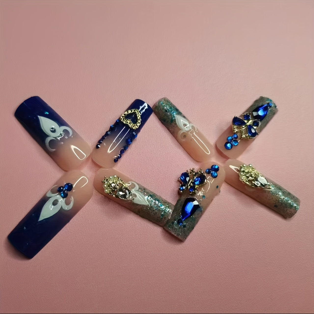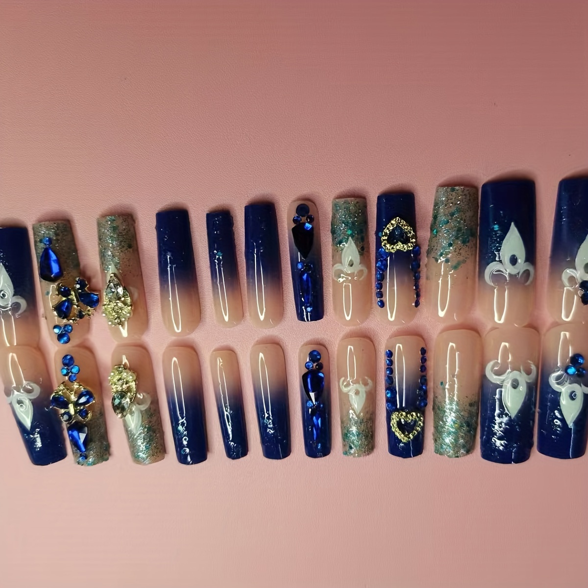 24pcs Luxe Blue Gradient 3D Press-On Nails with Rhinestones, Pearls & Golden Accents - Long Square Shape, Glamorous Heart & Floral Design for Elegant Manicures, Nail Art