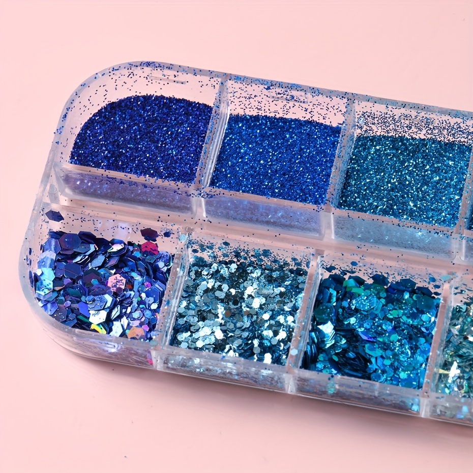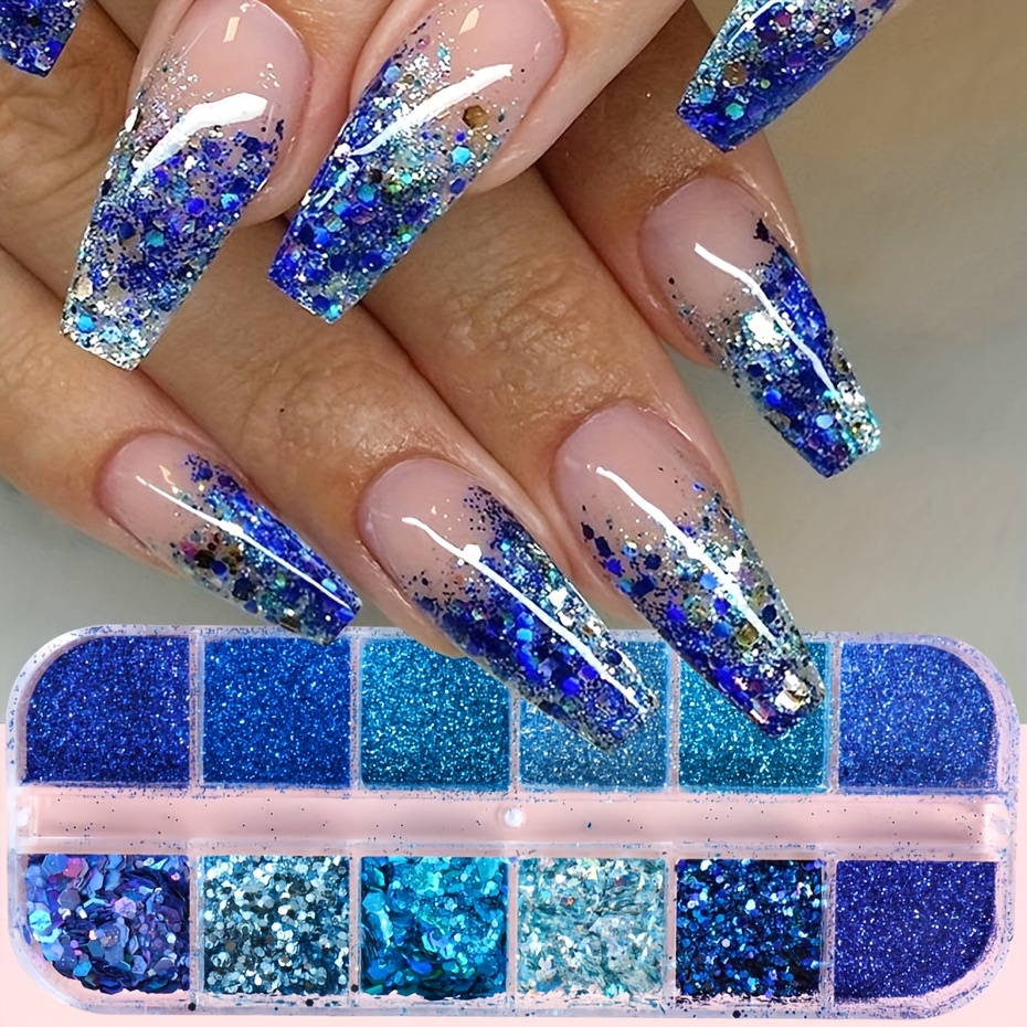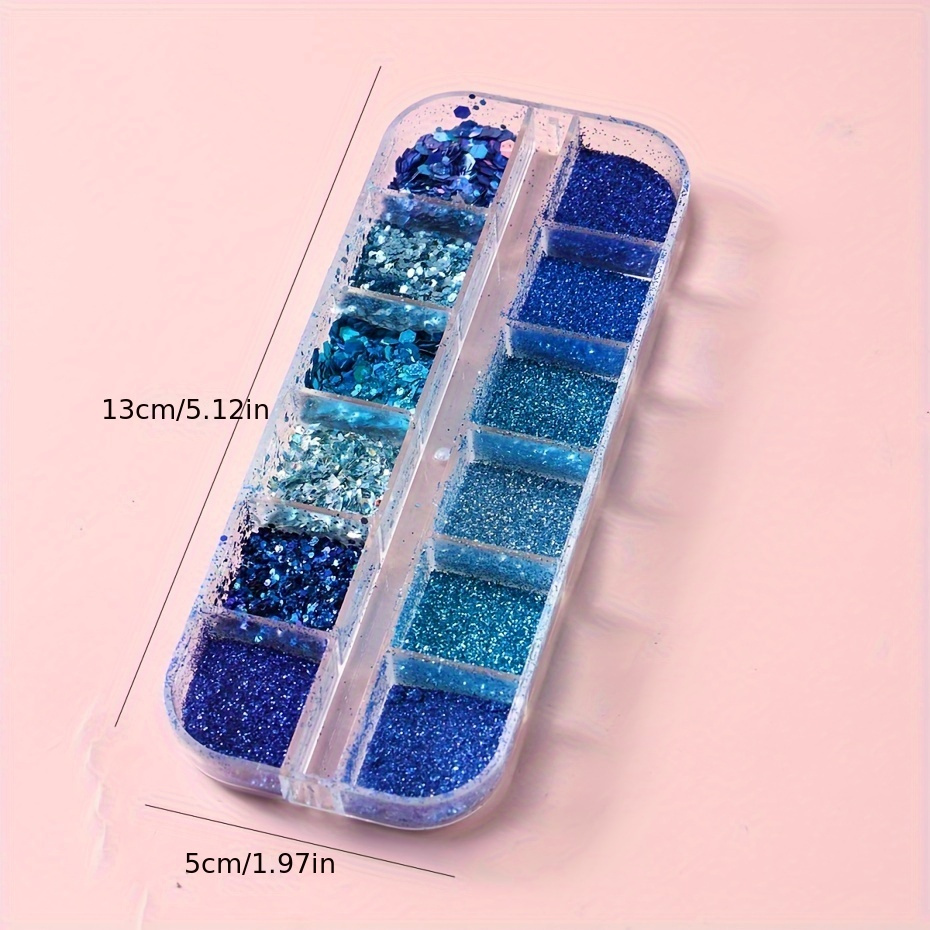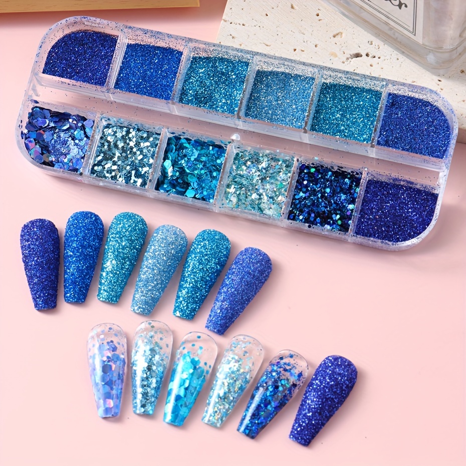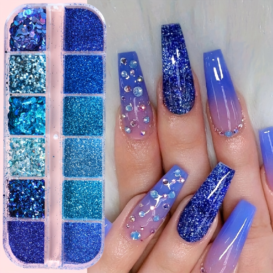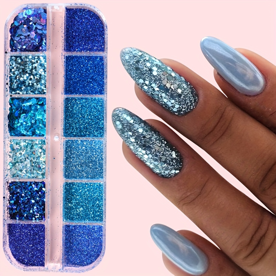 FULL BEAUTY Sparkly Blue Nail Glitter Set: 12 Grids of Shimmering Blue Sequins, Diamond Chrome, Fine Powder, Dust, Chunky Flakes, and Paillettes for DIY Manicure Decoration