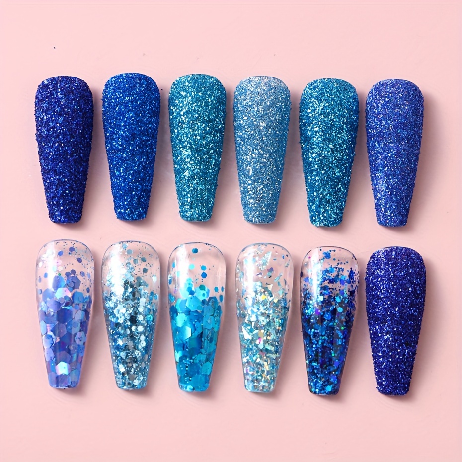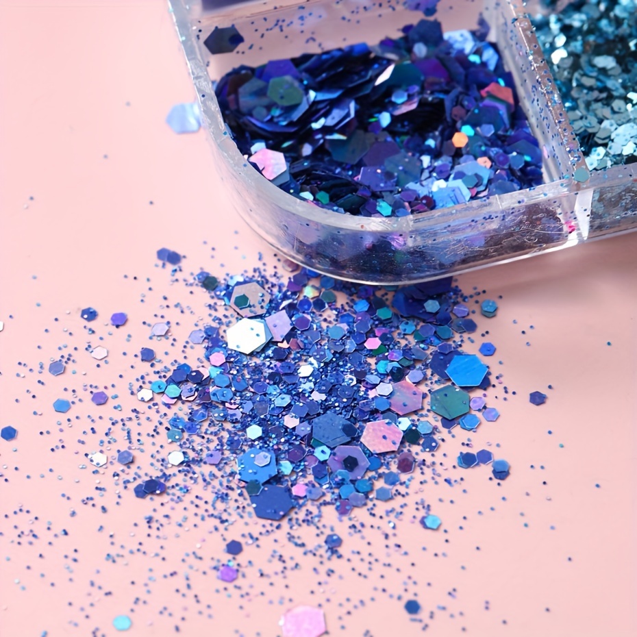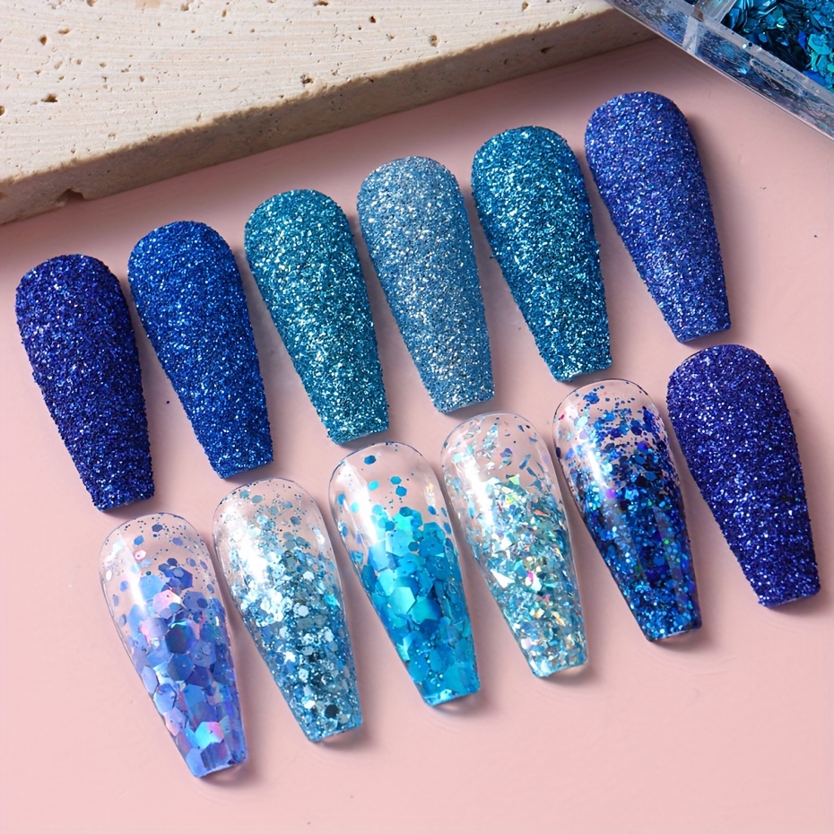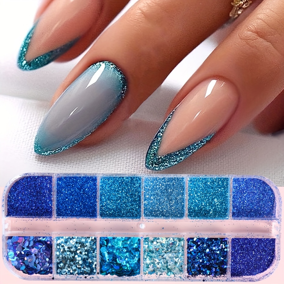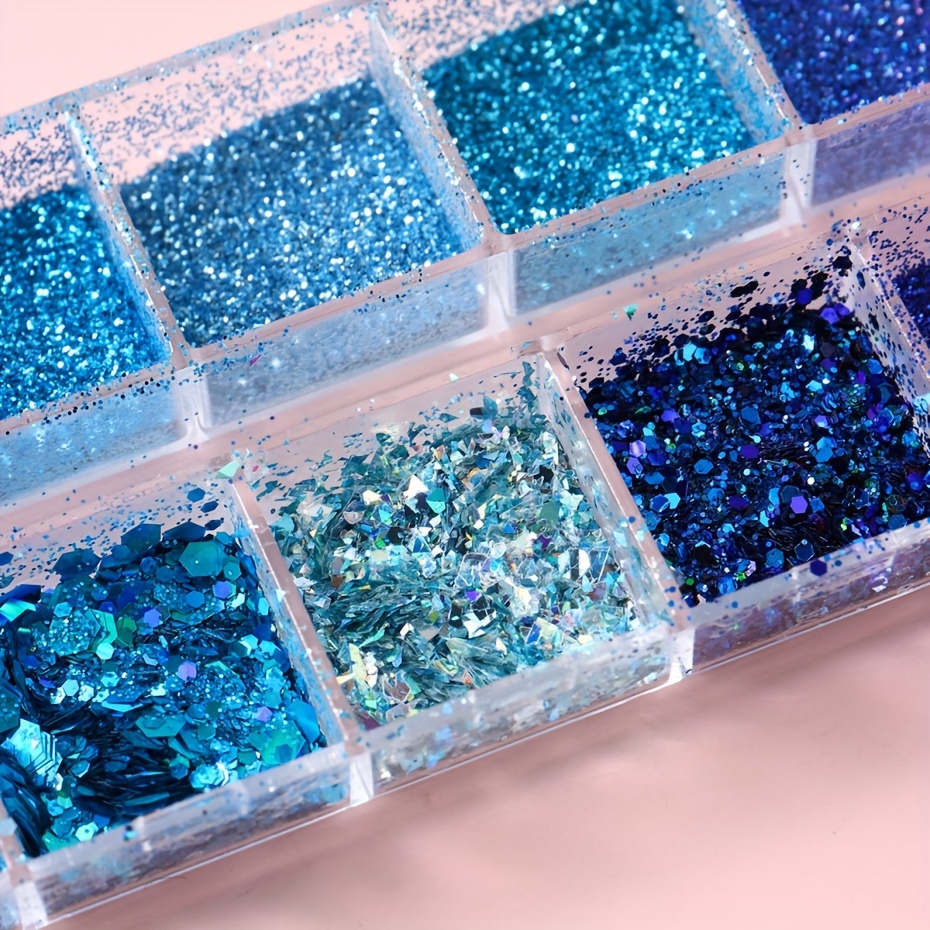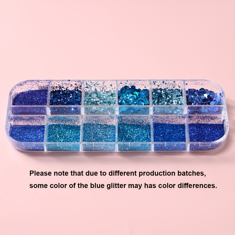 FULL BEAUTY Sparkly Blue Nail Glitter Set: 12 Grids of Shimmering Blue Sequins, Diamond Chrome, Fine Powder, Dust, Chunky Flakes, and Paillettes for DIY Manicure Decoration