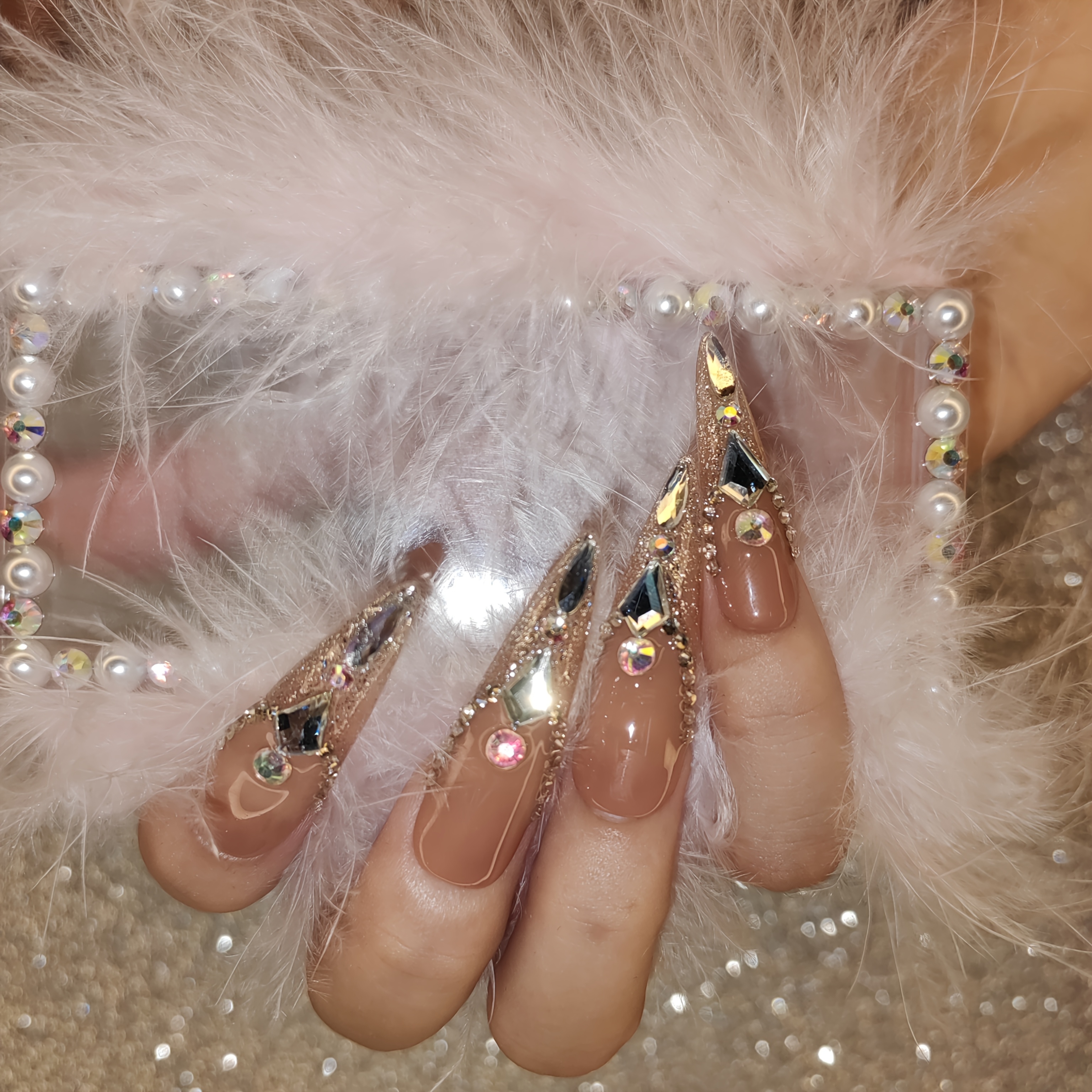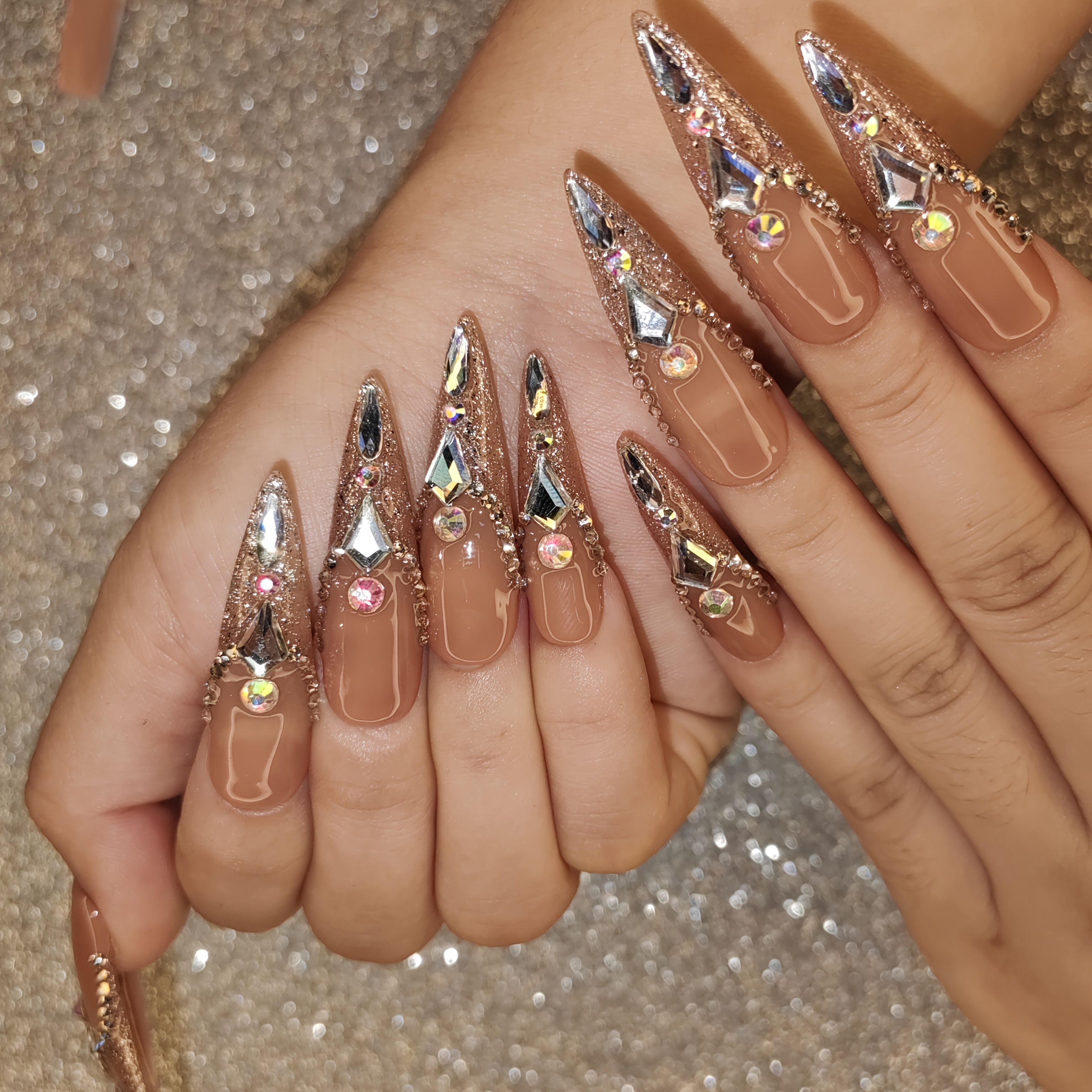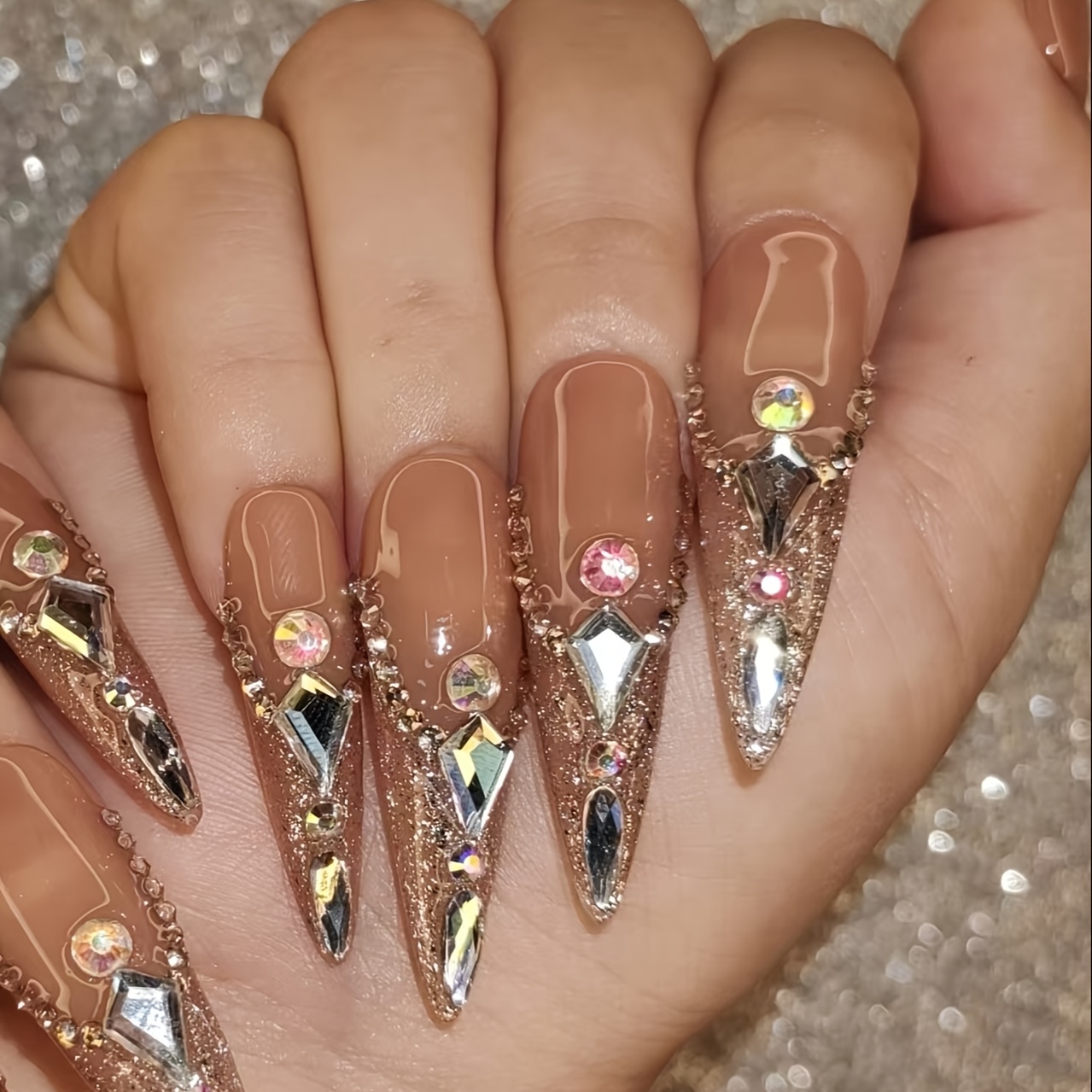 Handcrafted Ultra-Pointed Nude Press-On Nails with Luxurious Large Rhinestones - High-End Elegance, Grandeur & Modern Style for Women | Pure Hand-Set Sparkling Diamonds | Extra-Long Ultra-Durable Design Resists Bending