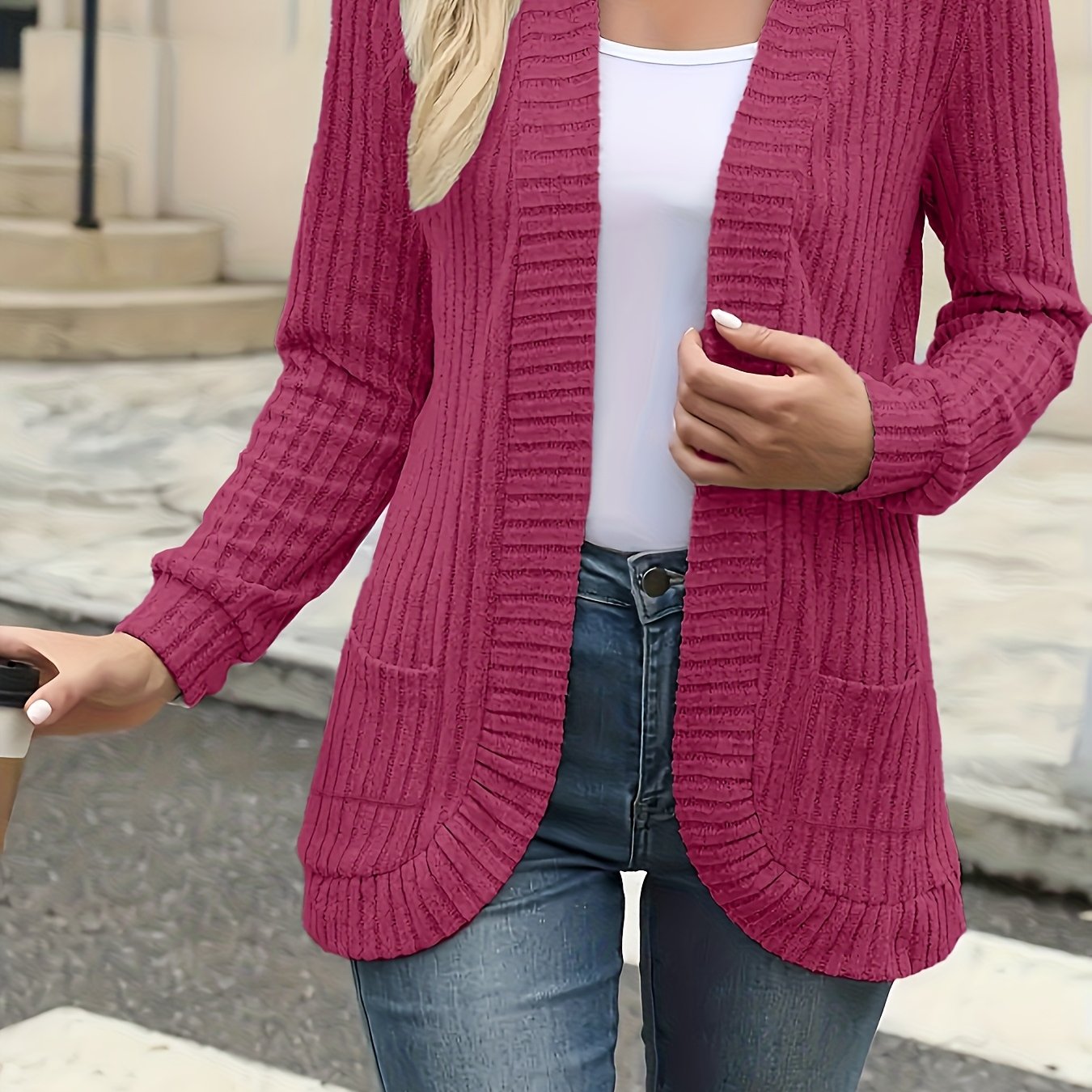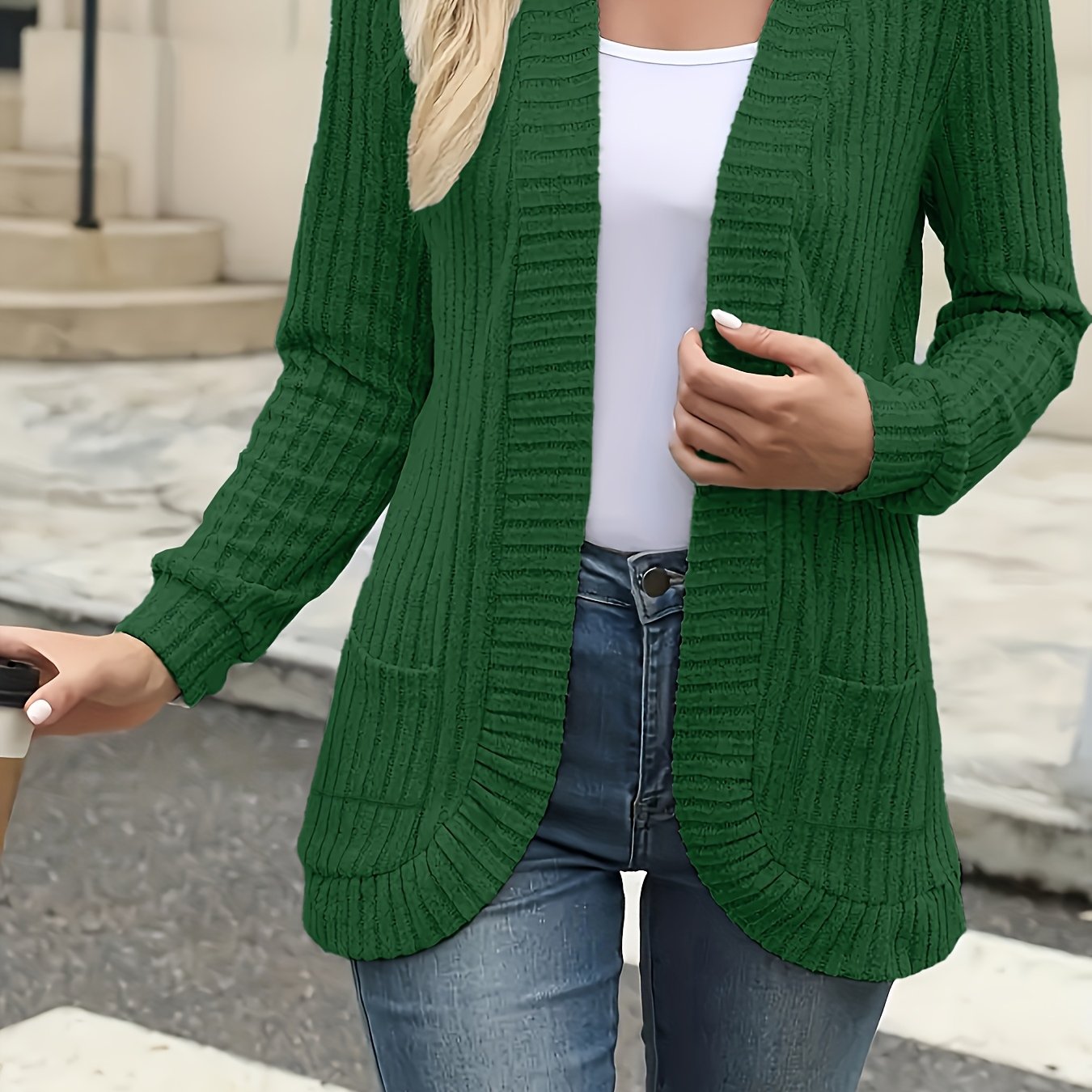 Elegant Women's Front-Button Cardigan - Medium Stretch Long Sleeve with Pleated Detail, Solid Green Machine-Washable Fall Winter Jacket, Regular Fit for Casual & Formal Outfits, Lightweight Cardigan, Winter Apparel, Open Fron