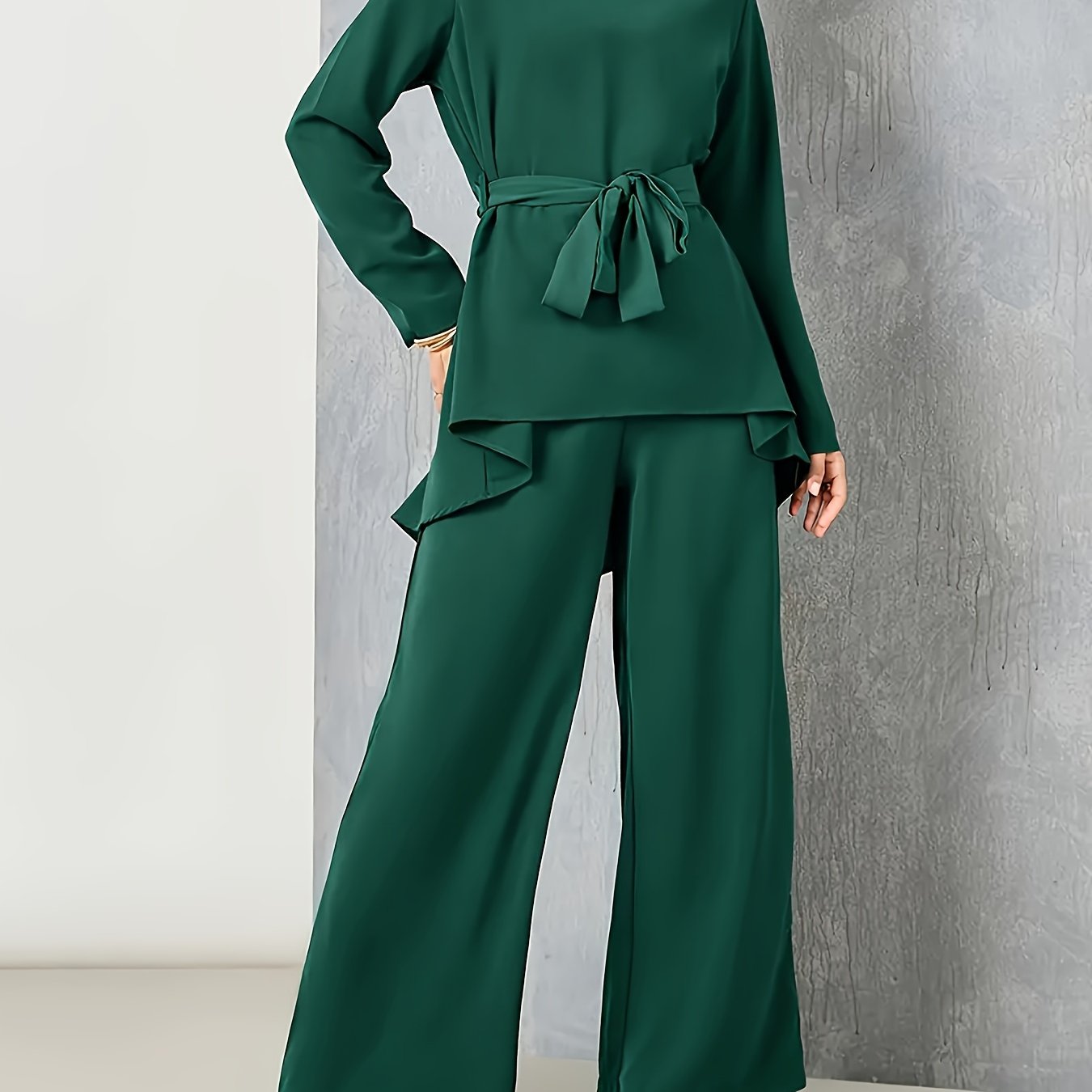 2 Pcs Solid Color Top & Pants Set, Long Sleeve Asymmetric Hem Belted Top & Straight Leg Pants Outfits, Women's Clothing