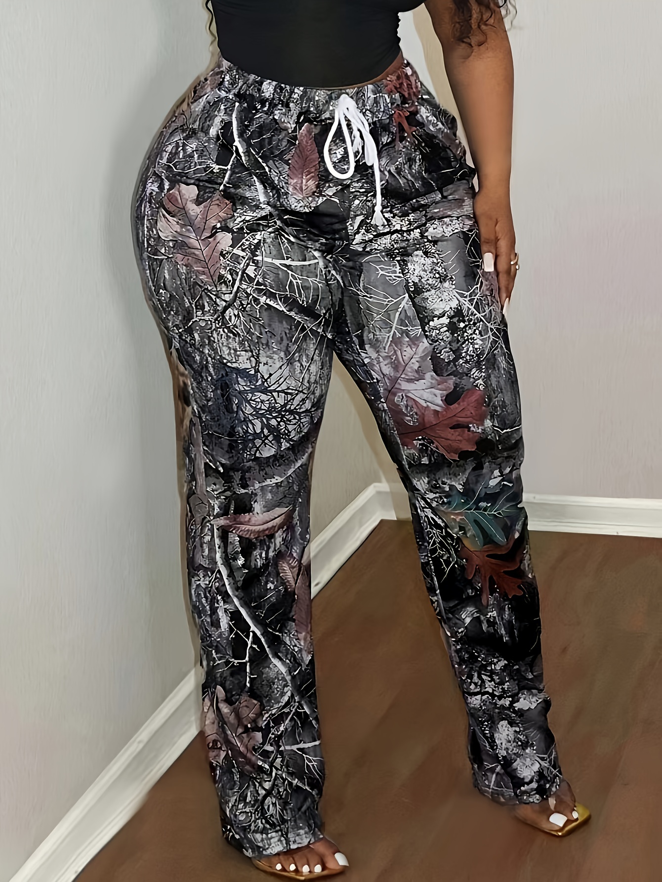 Chic Camo & Branch Print Skinny Pants for Women - Stretchy Polyester Blend, Machine Washable, Sexy High-Waist Design, European And American Style, Slimming
