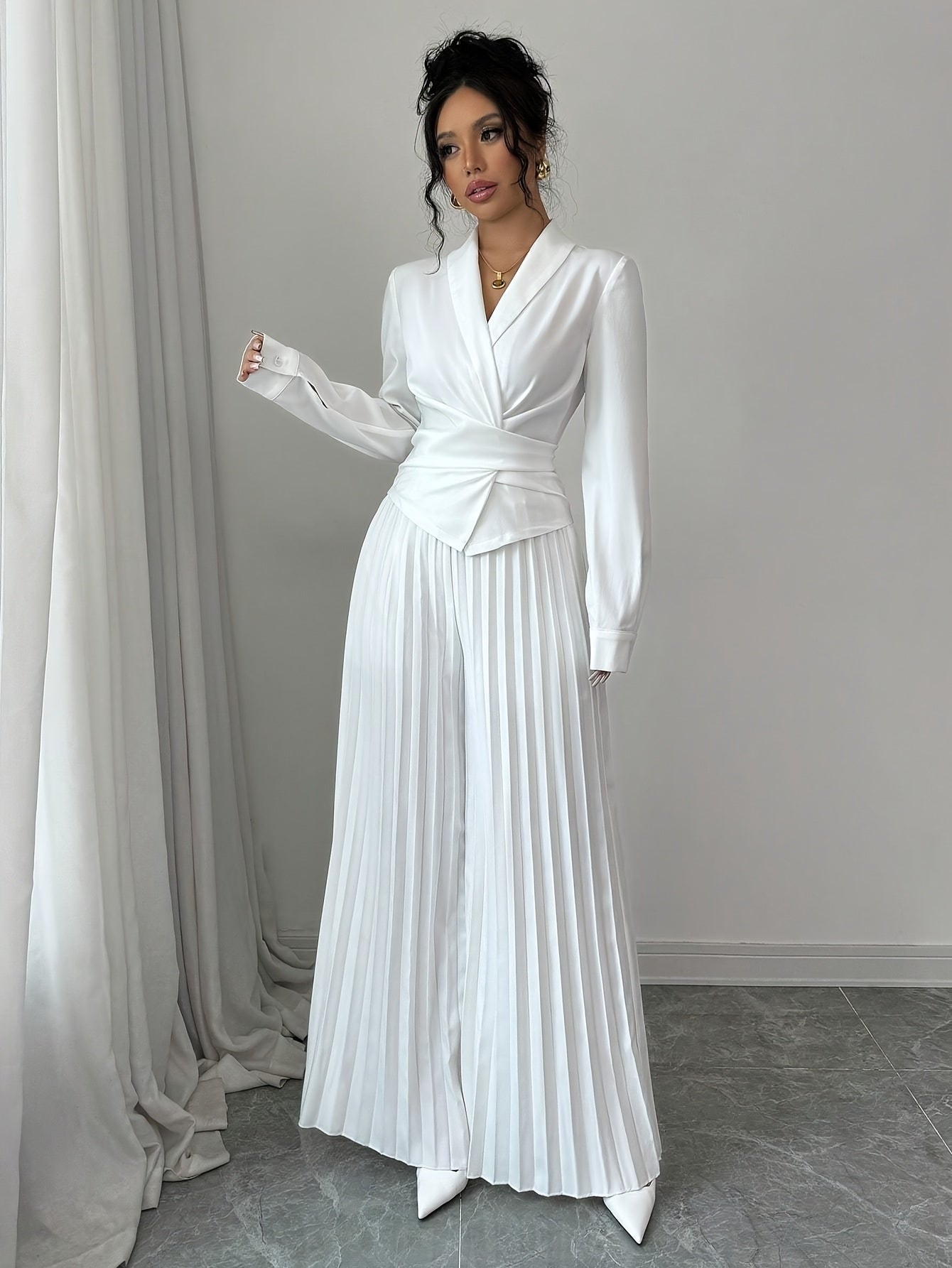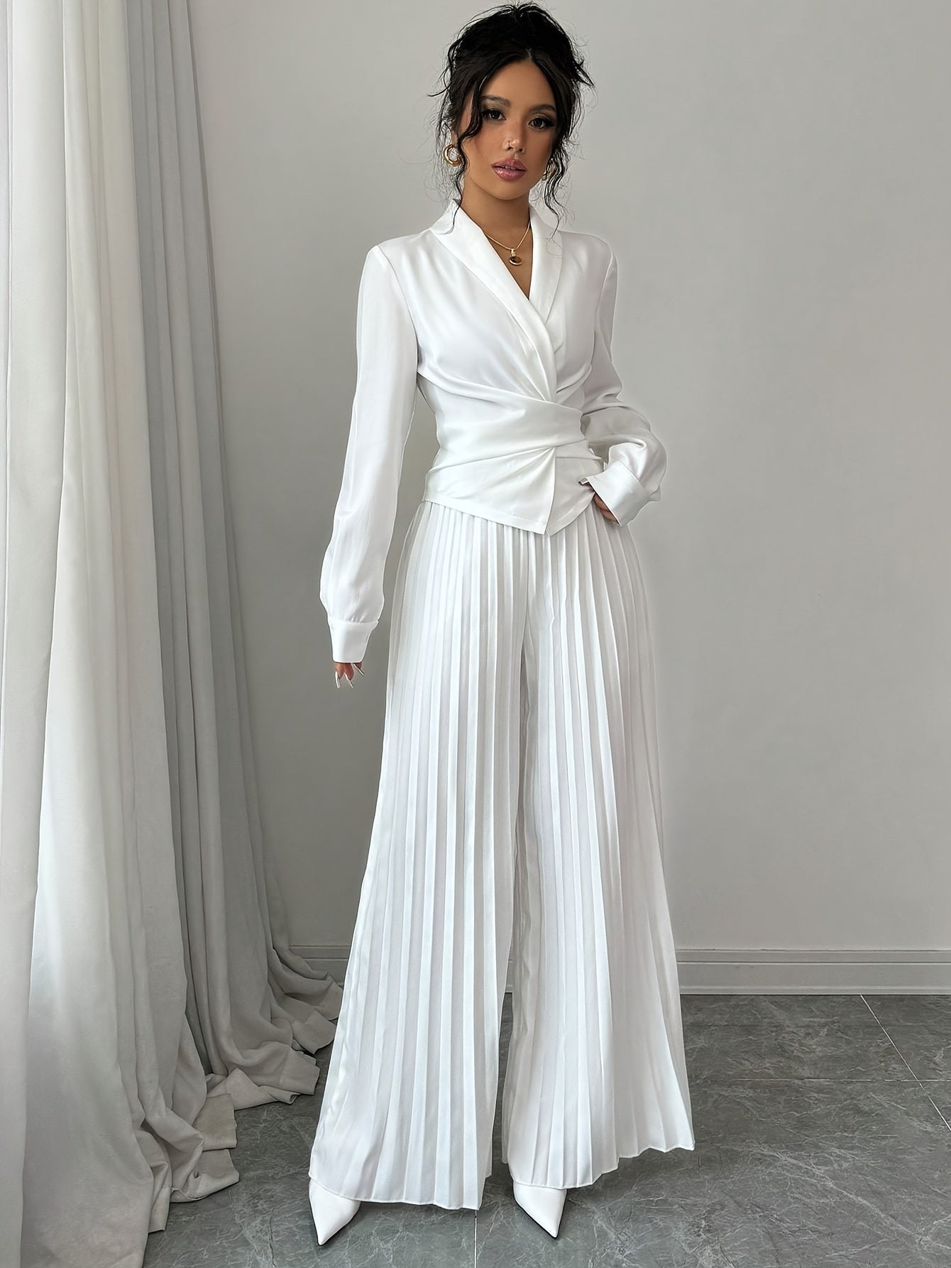 Elegant Women'S V-Neck Long Sleeve Top with Cross Twist Detail + Pleated Long Pants Set, Polyester 100%, Solid Color, Button Detail, Woven Fabric, Lightweight 50/100/120 g/m², Spring/Fall Collection