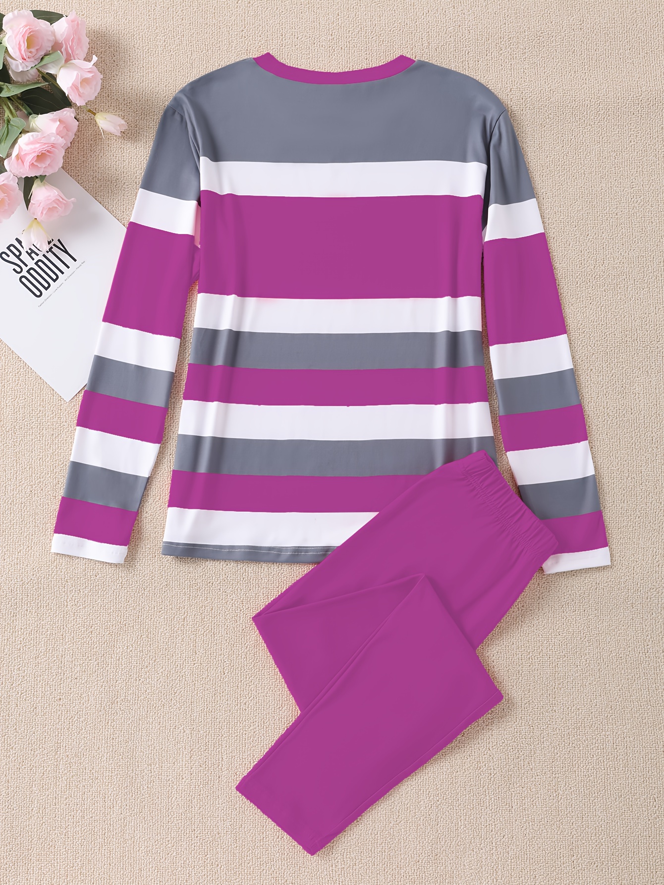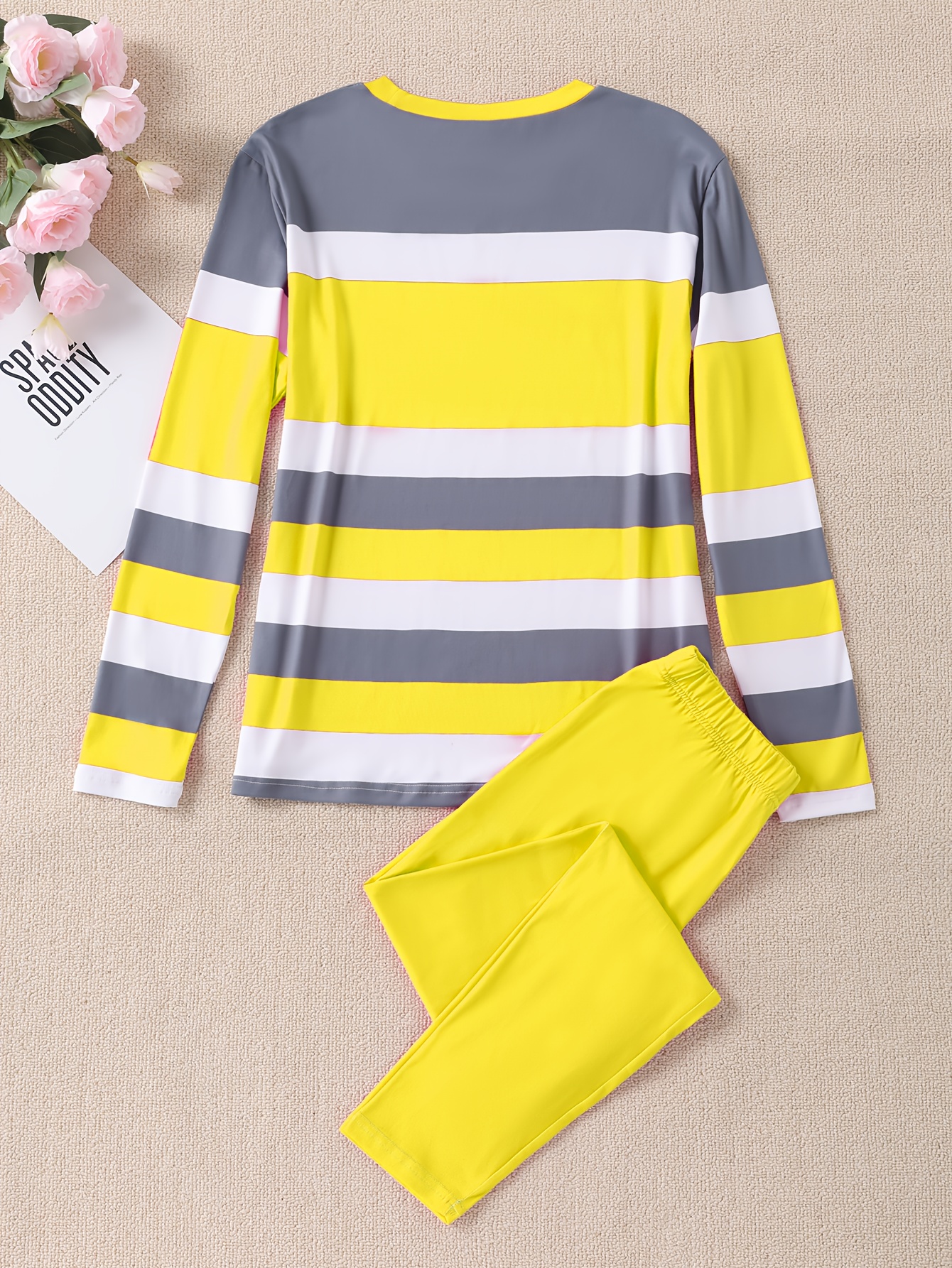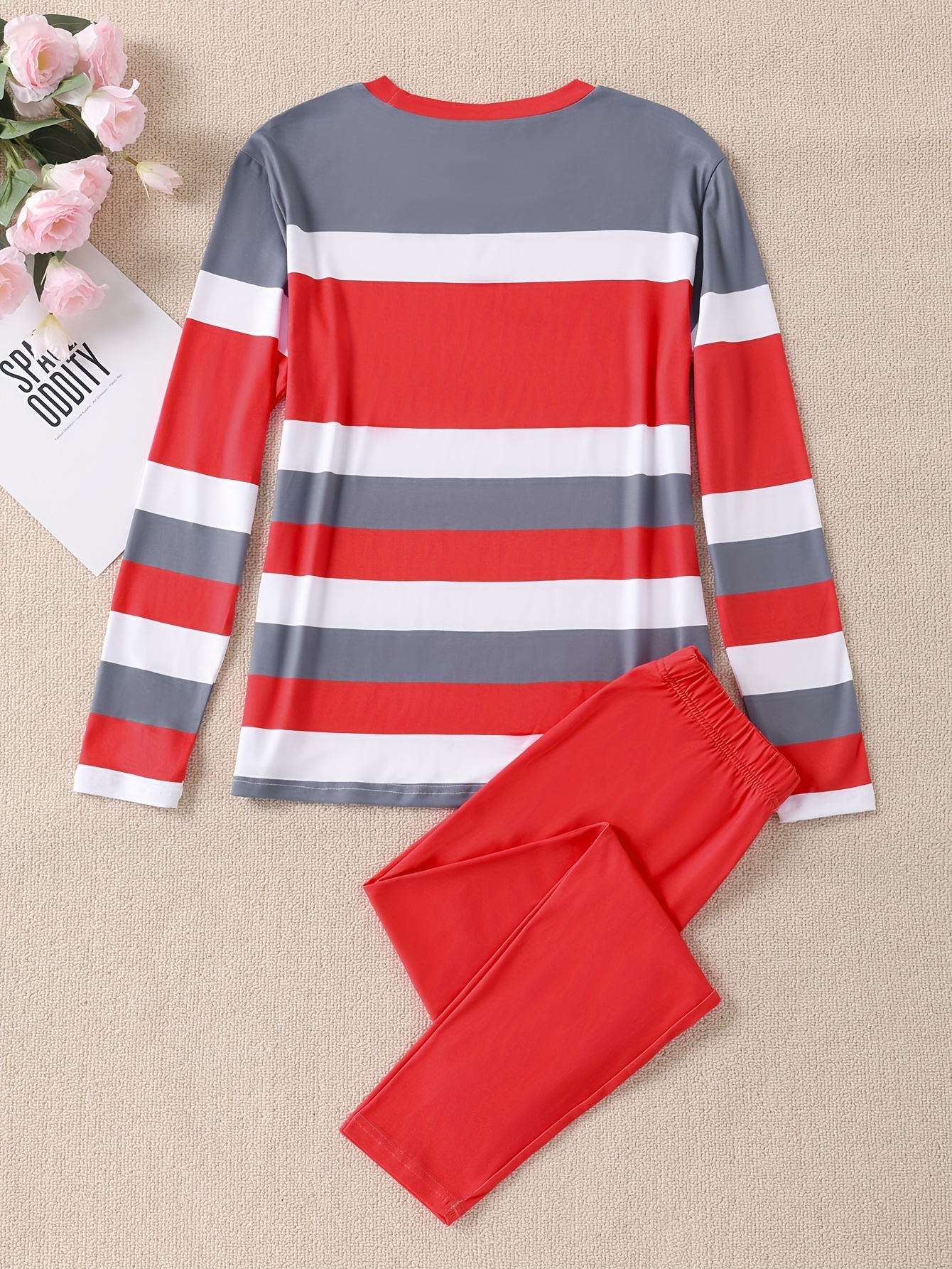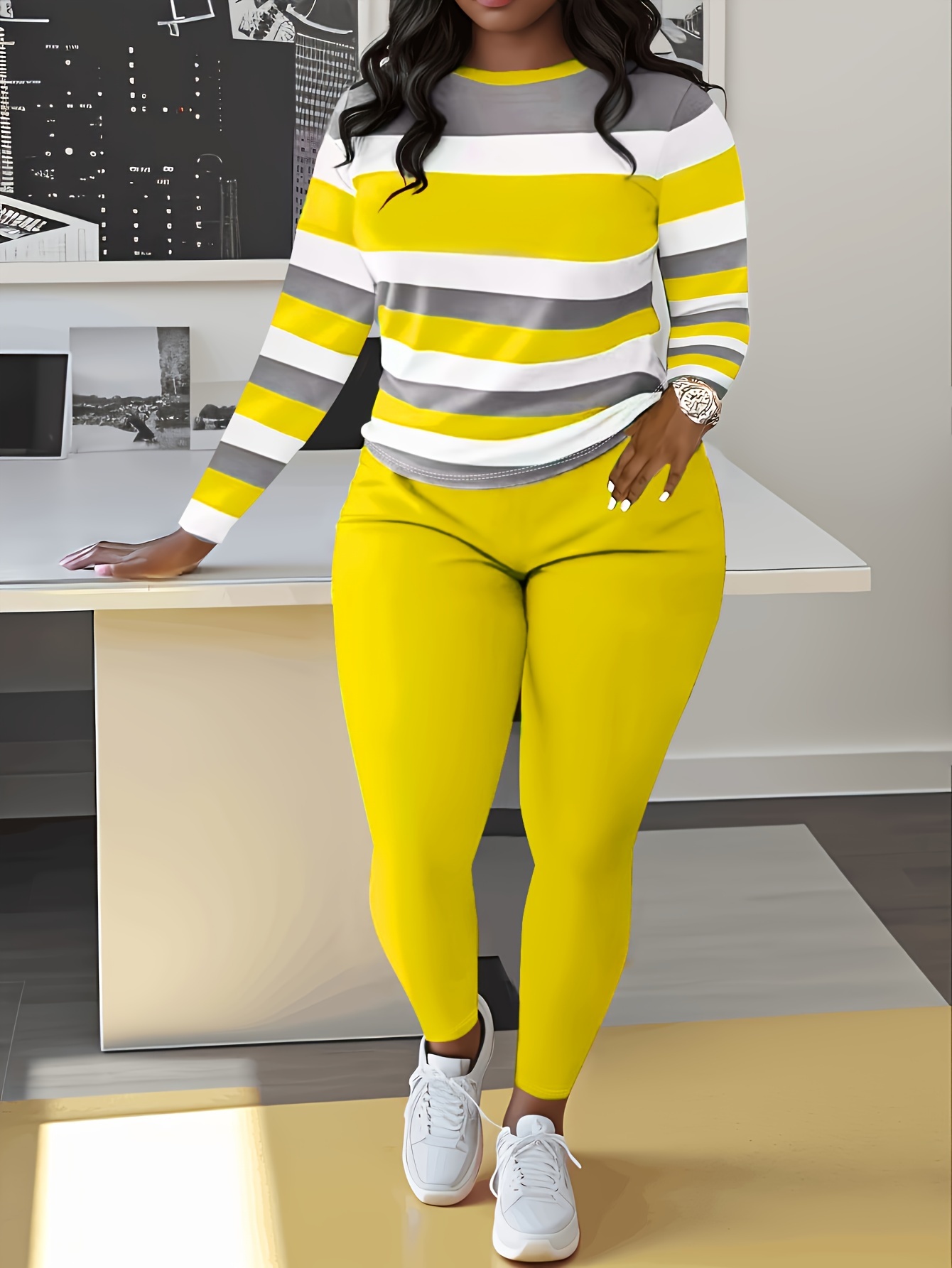 Slim Matching Two-piece Set, Casual Long Sleeve Crew Neck Striped Color Block T-shirt & Solid Elastic Waist Pants Outfits, Women's Clothing