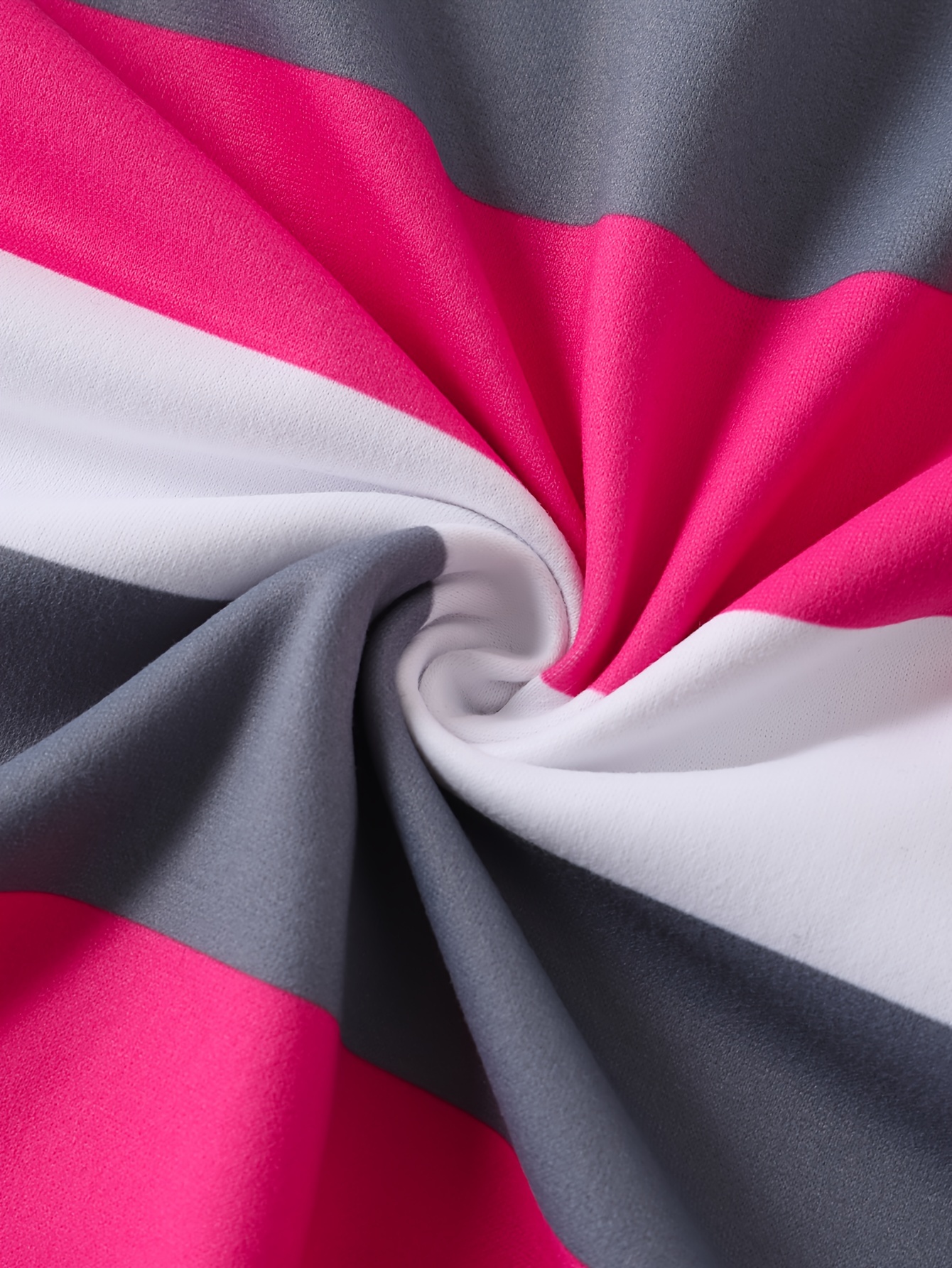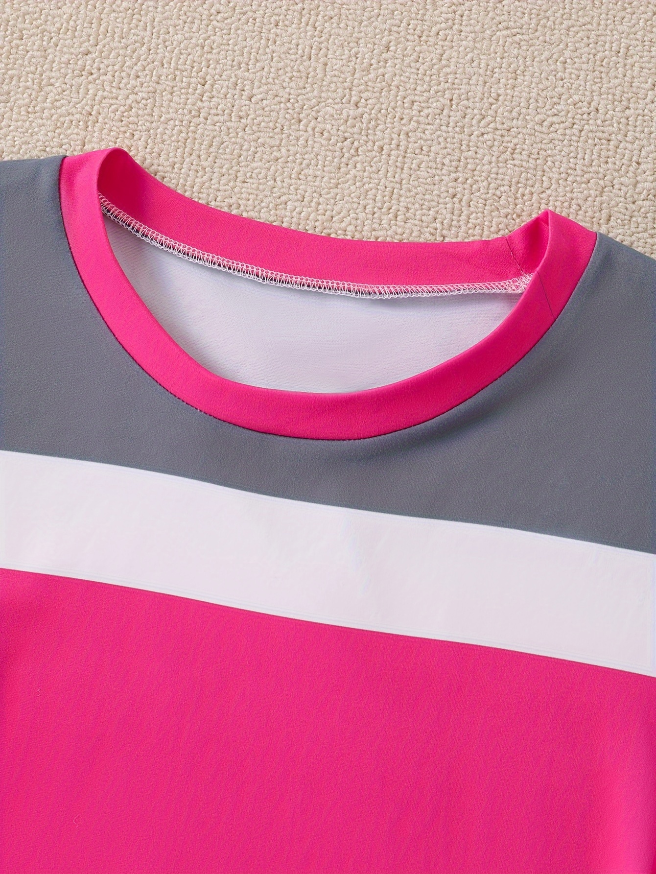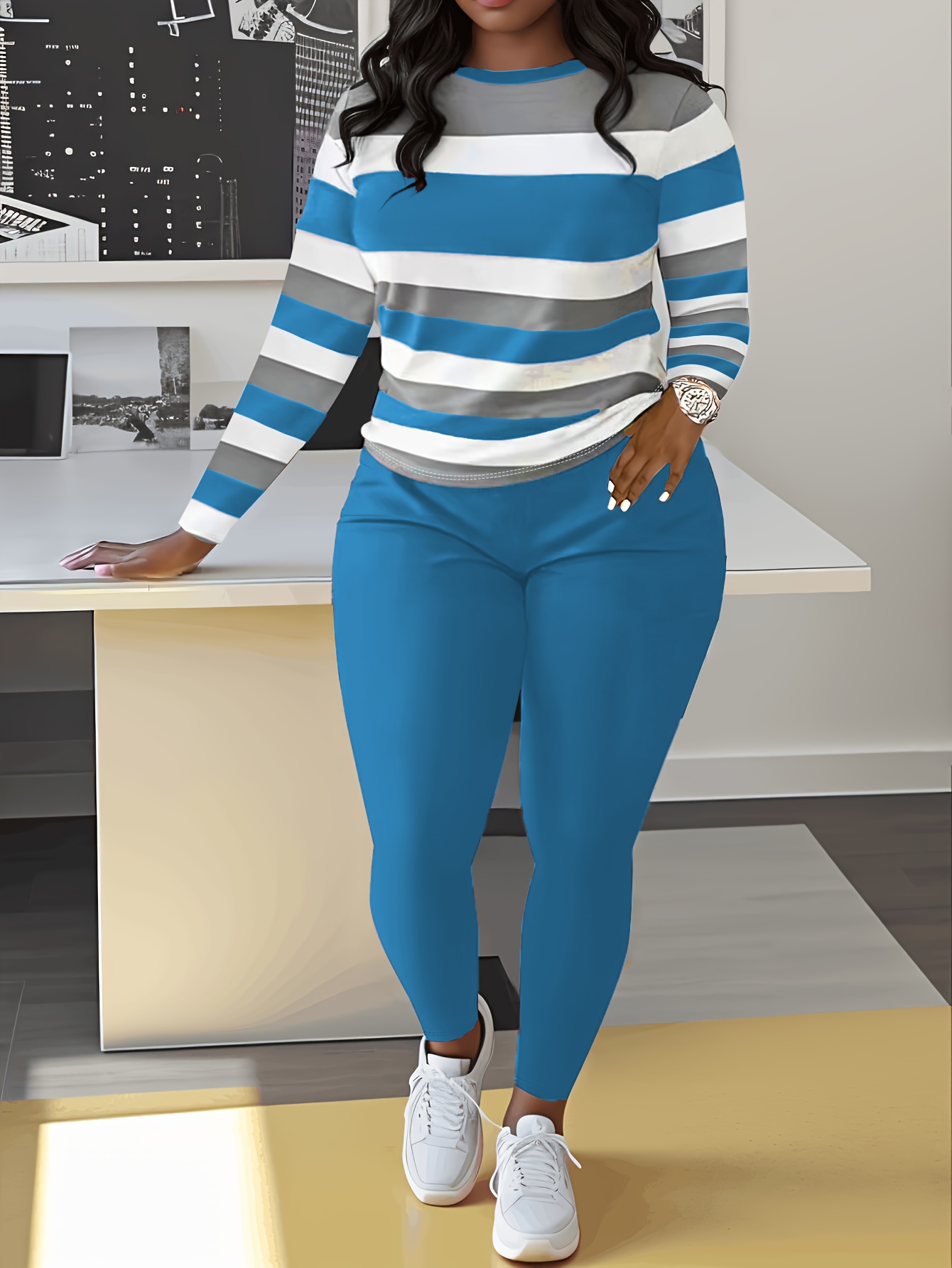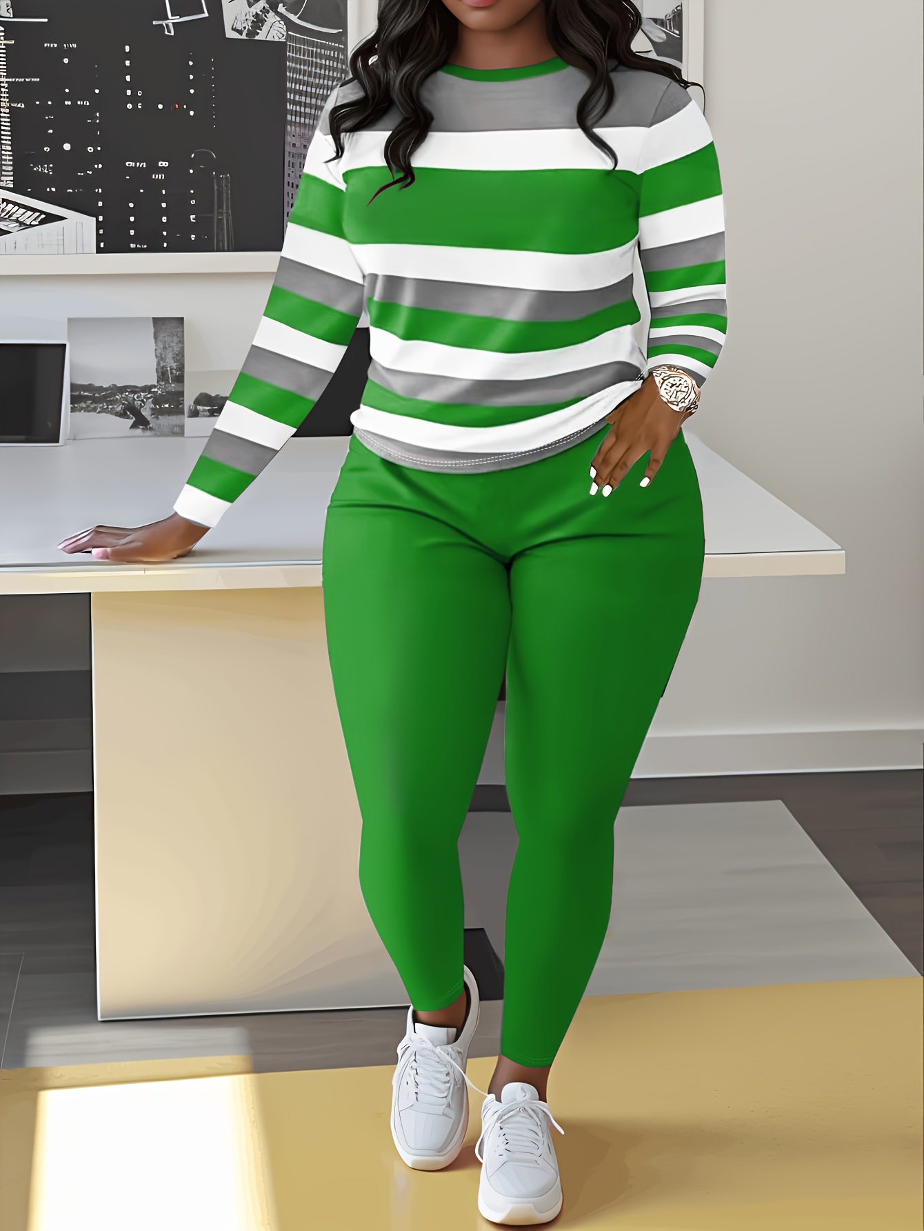 Slim Matching Two-piece Set, Casual Long Sleeve Crew Neck Striped Color Block T-shirt & Solid Elastic Waist Pants Outfits, Women's Clothing