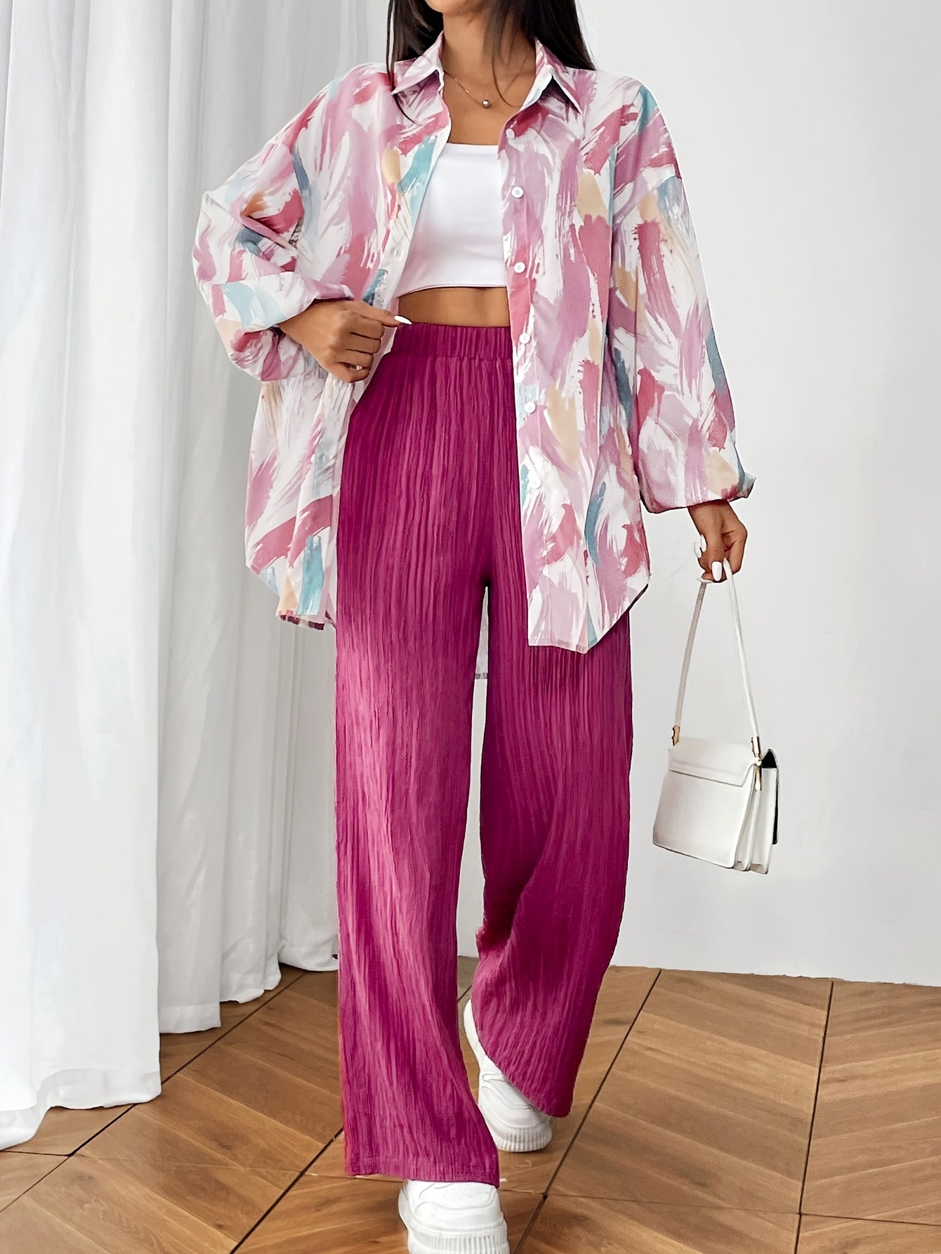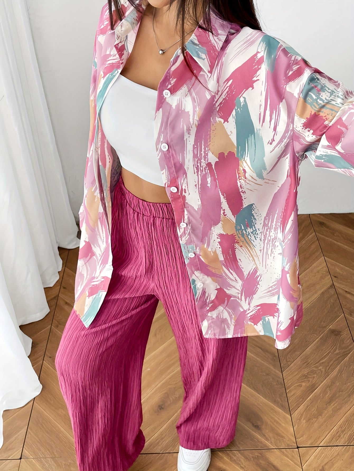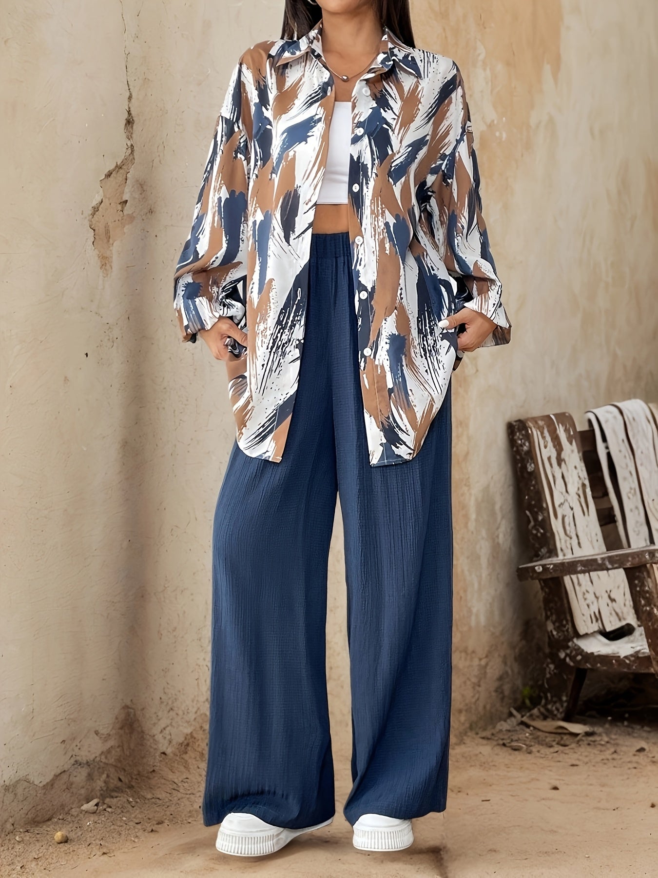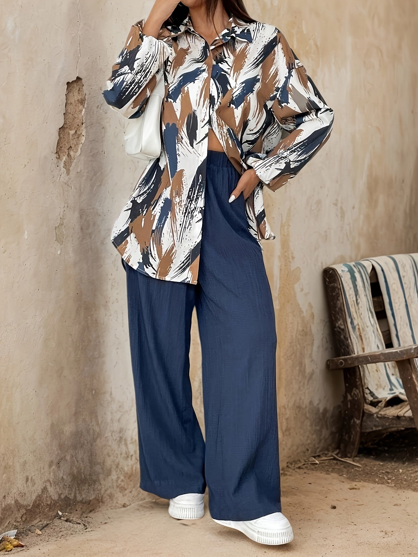 Women'S Casual Spring/Summer 2pcs Set - Floral Print Long Sleeve Blouse & Wide-Leg Pants, Button-Up Top with Pockets, White Sneakers, and White Handbag, Casual Attire|Floral Print Top|Buttonup Top