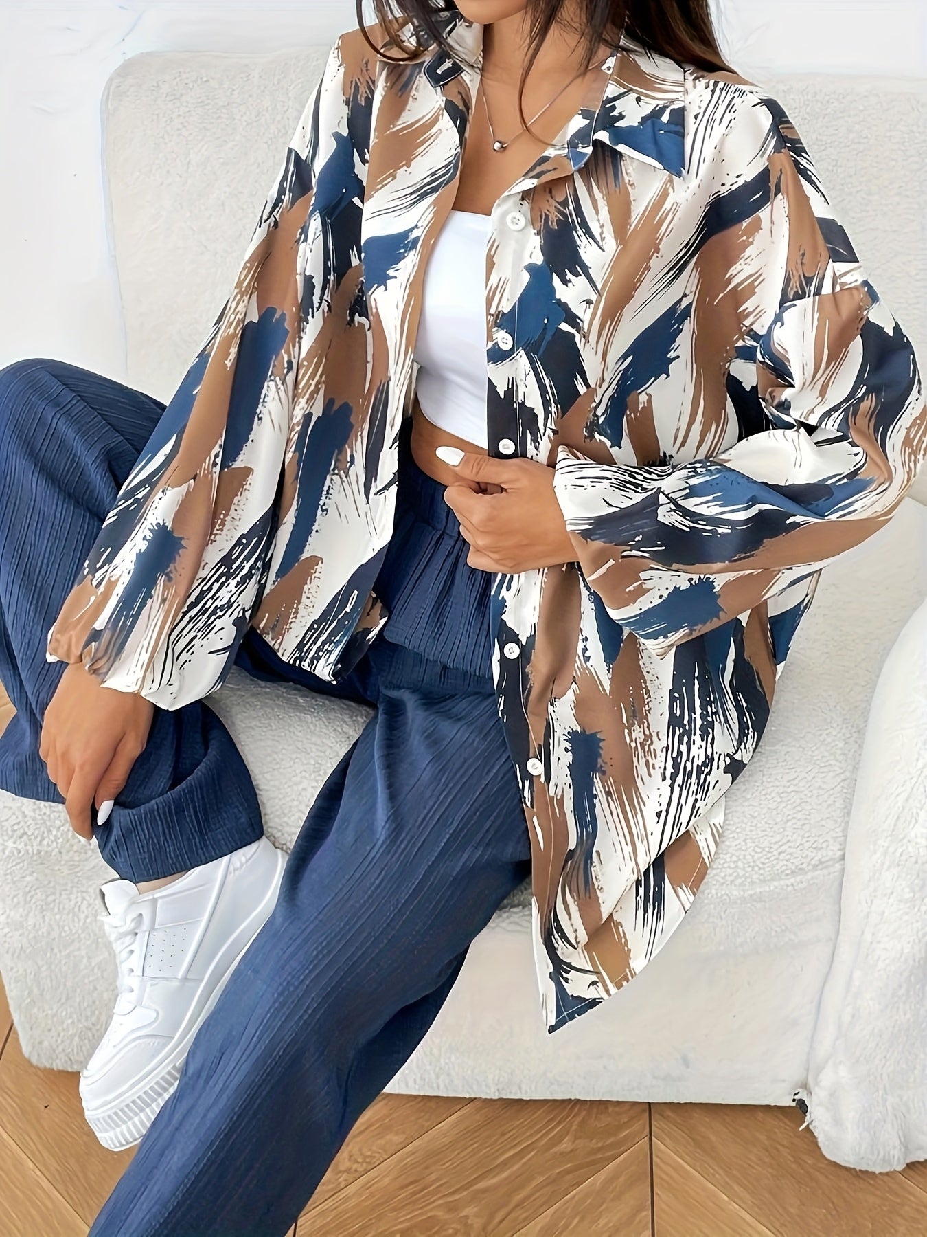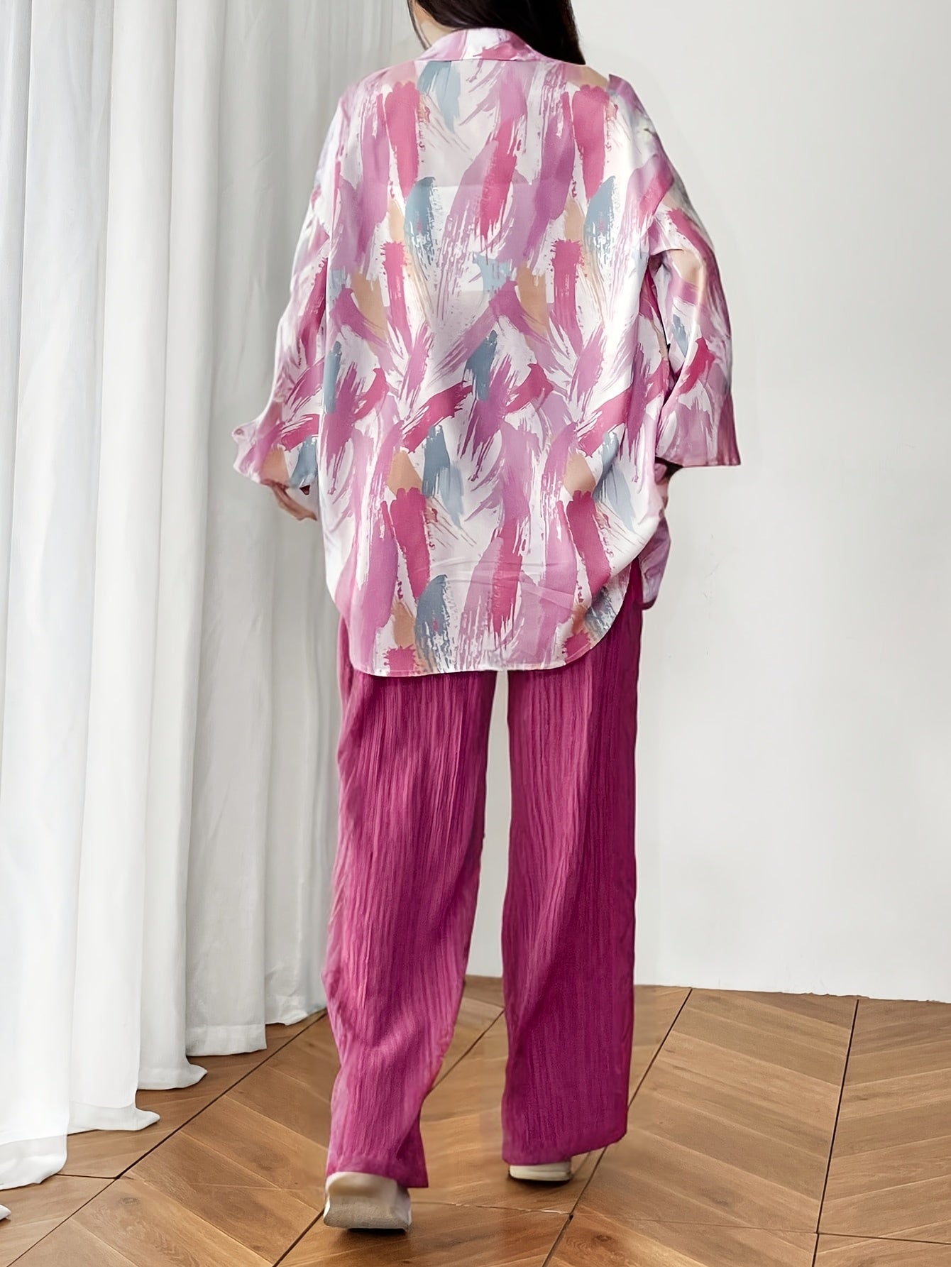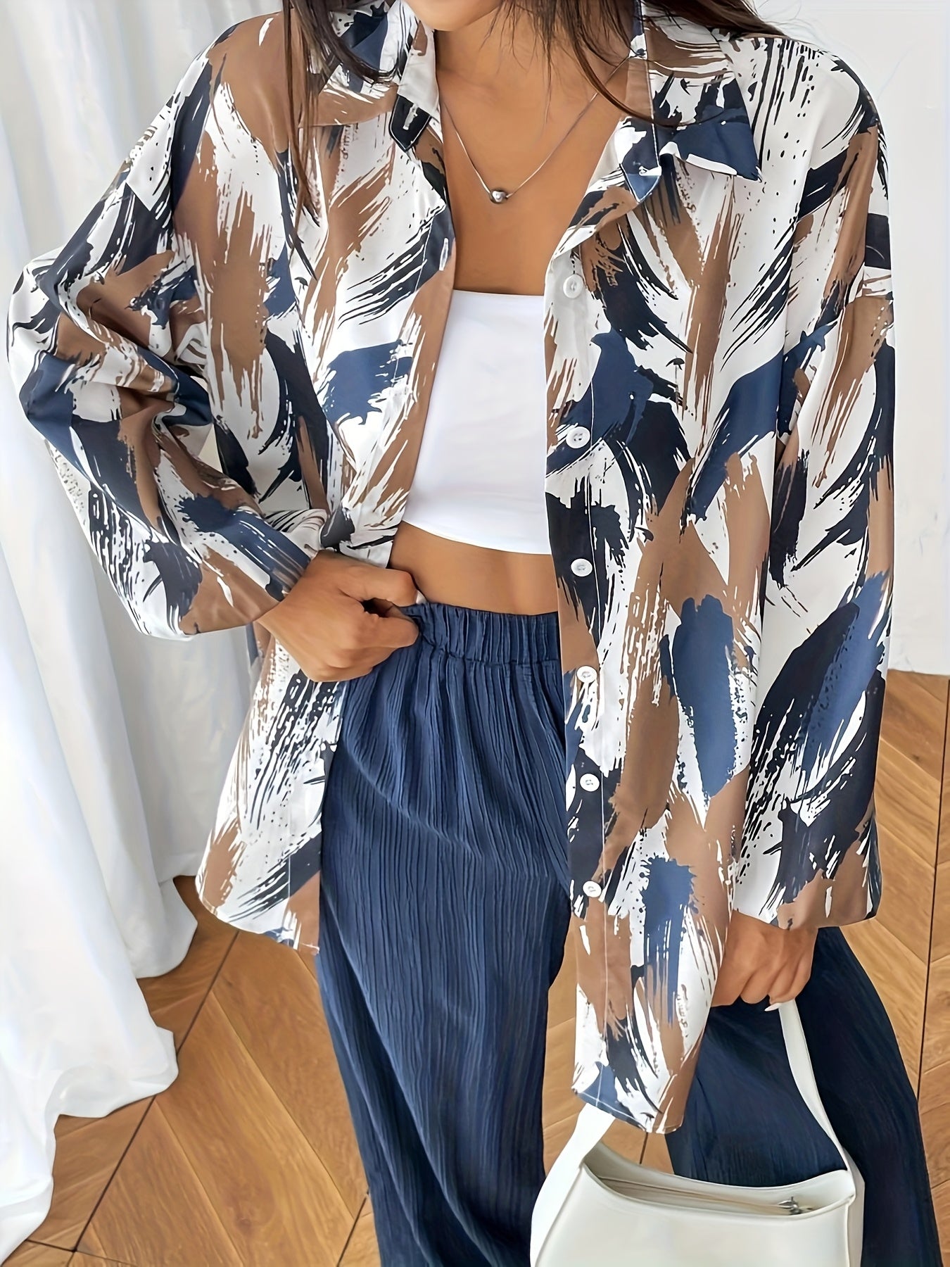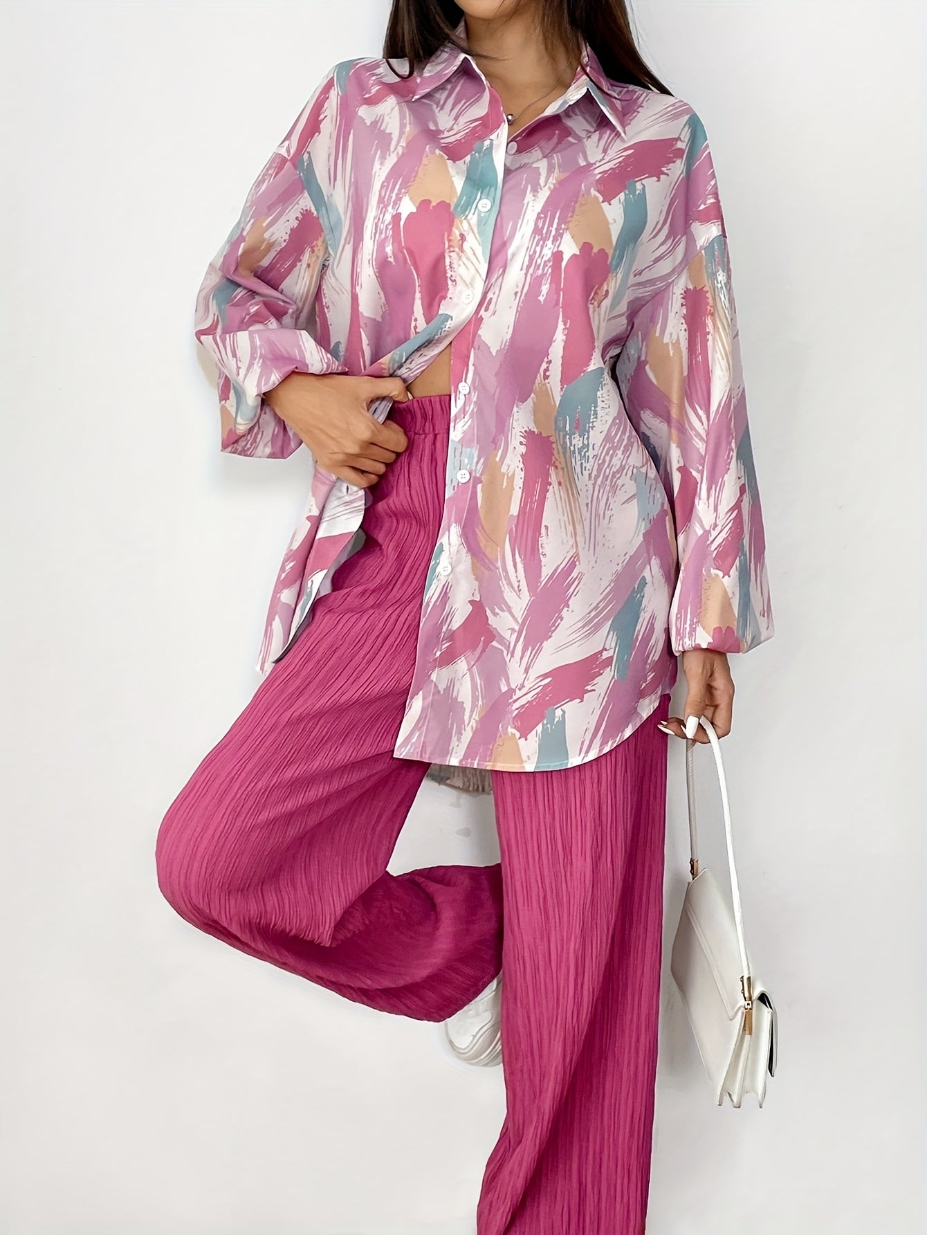 Women'S Casual Spring/Summer 2pcs Set - Floral Print Long Sleeve Blouse & Wide-Leg Pants, Button-Up Top with Pockets, White Sneakers, and White Handbag, Casual Attire|Floral Print Top|Buttonup Top