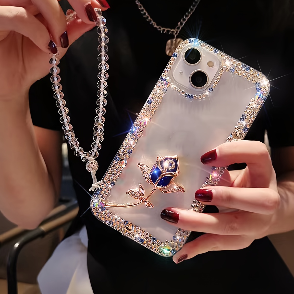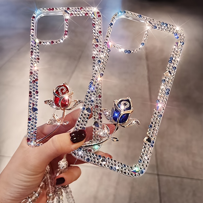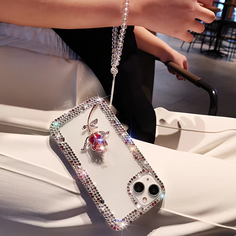 [1pc Luxurious Rose Flower Phone Case] Luxurious And Stylish Three-Row Glass Hardware Rose Flower Phone Case with Sparkle Bracelet Strap, Suitable for Iphone 16 Pro Max, Shockproof Phone Cover.