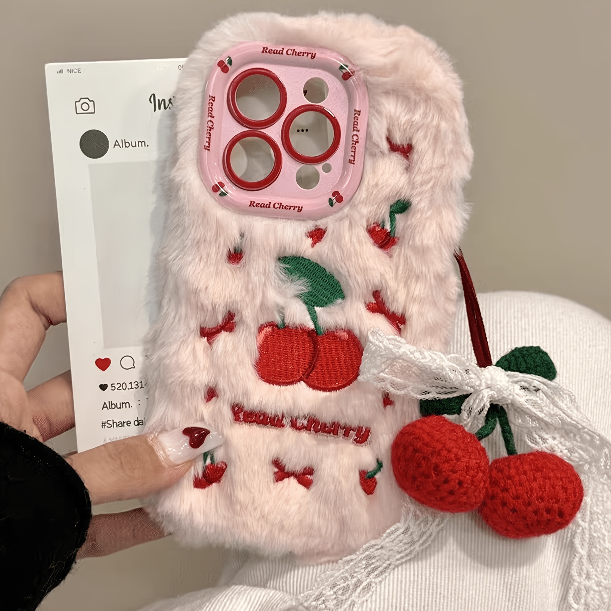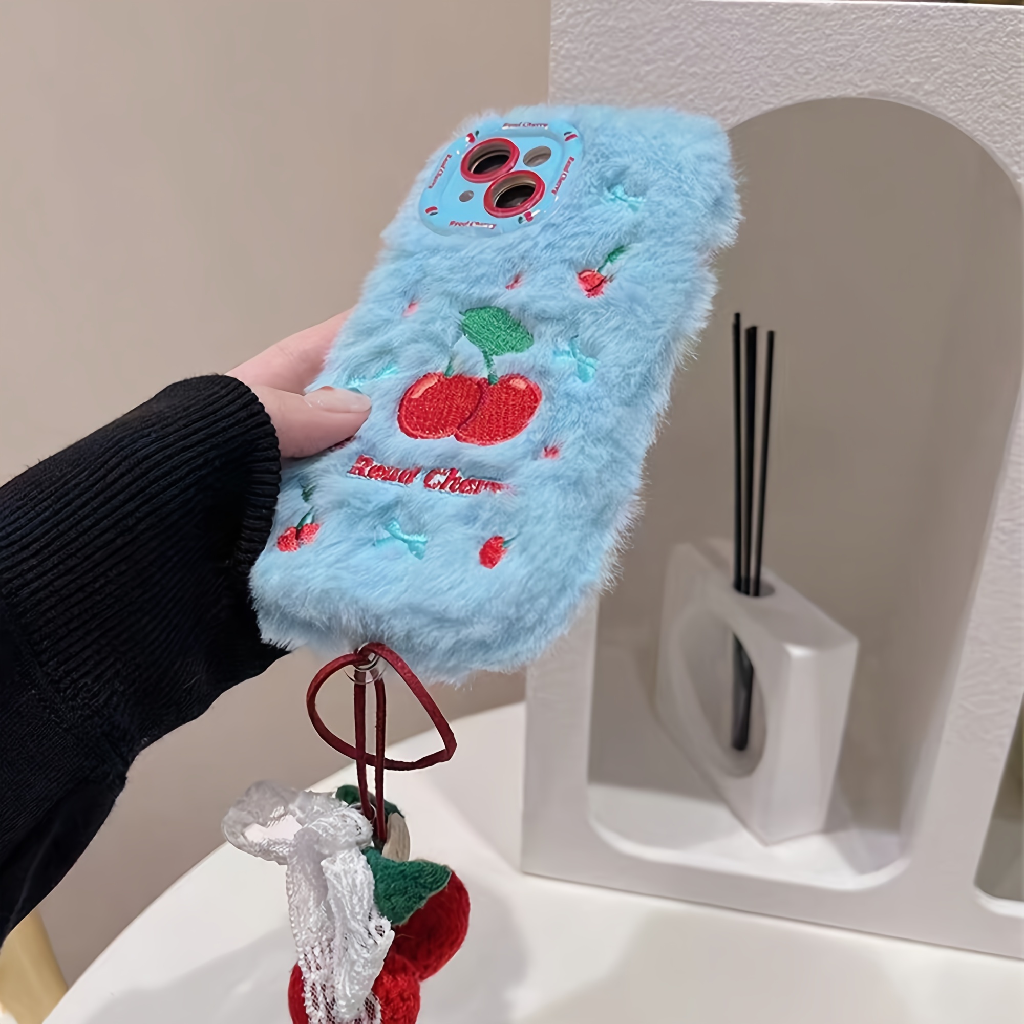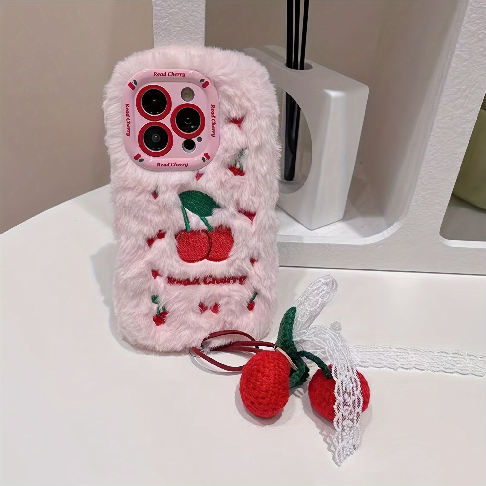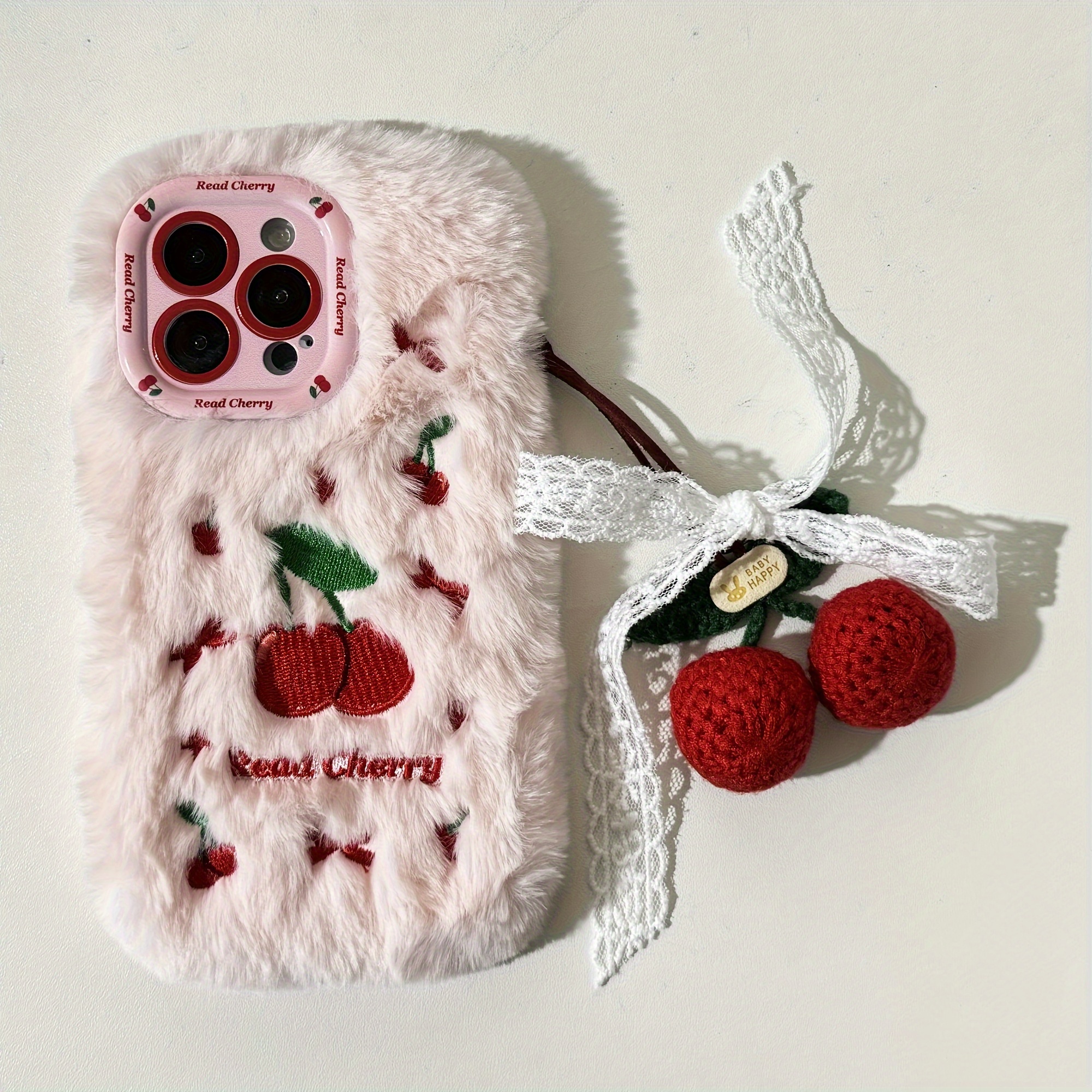 Autumn And Winter Cherry Plush Phone Case with Cherry Pendant for Iphone 16 Pro Max