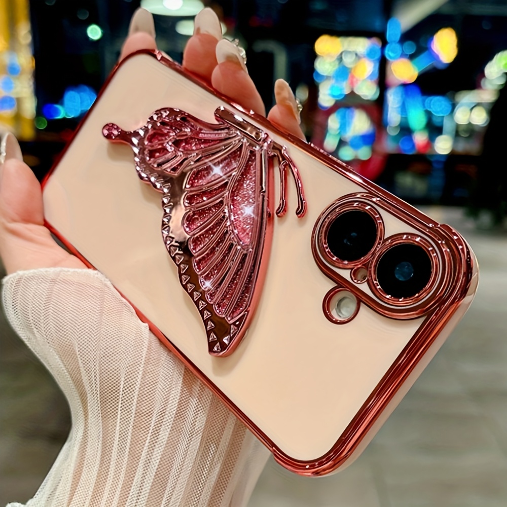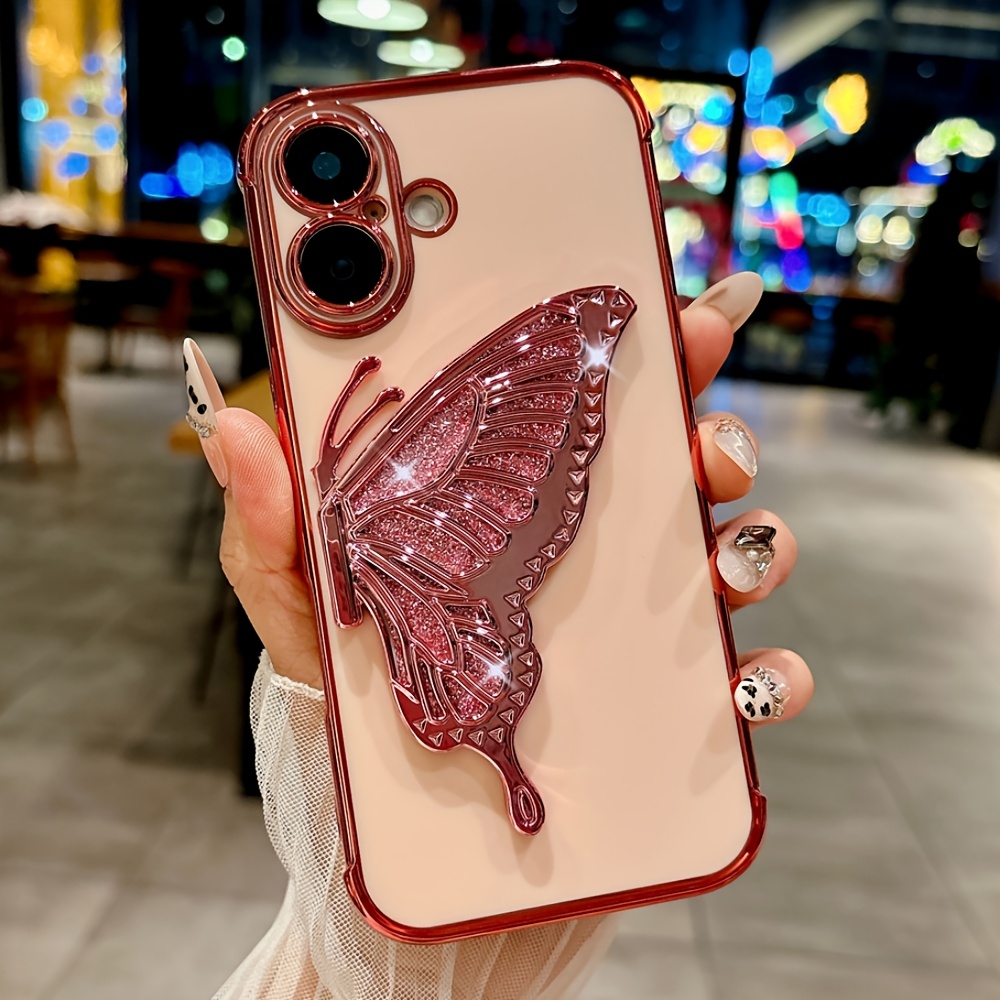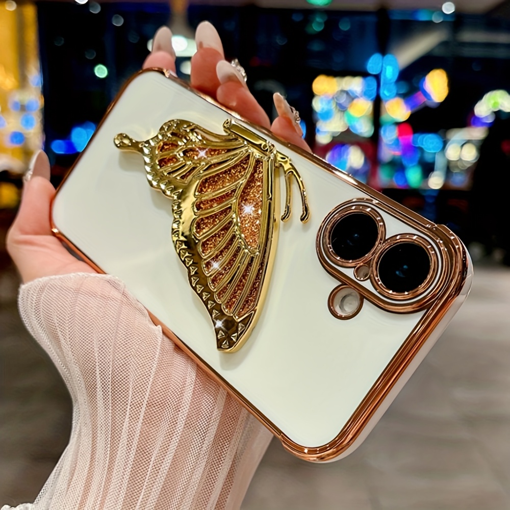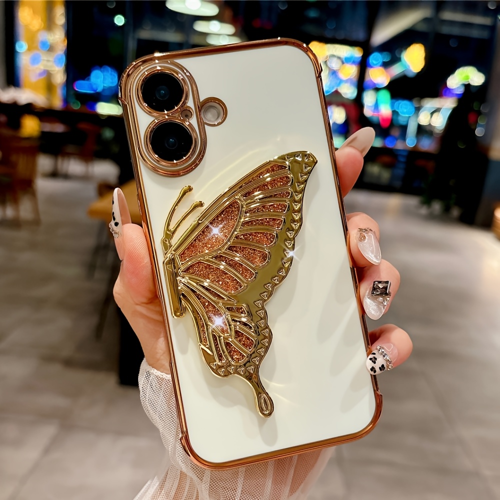Luxury Plated Pattern Glitter Butterfly Holder Stand Phone Case Compatible with iPhone 12 13 14 15 16 Pro Max Plus Bumper Protector Cover