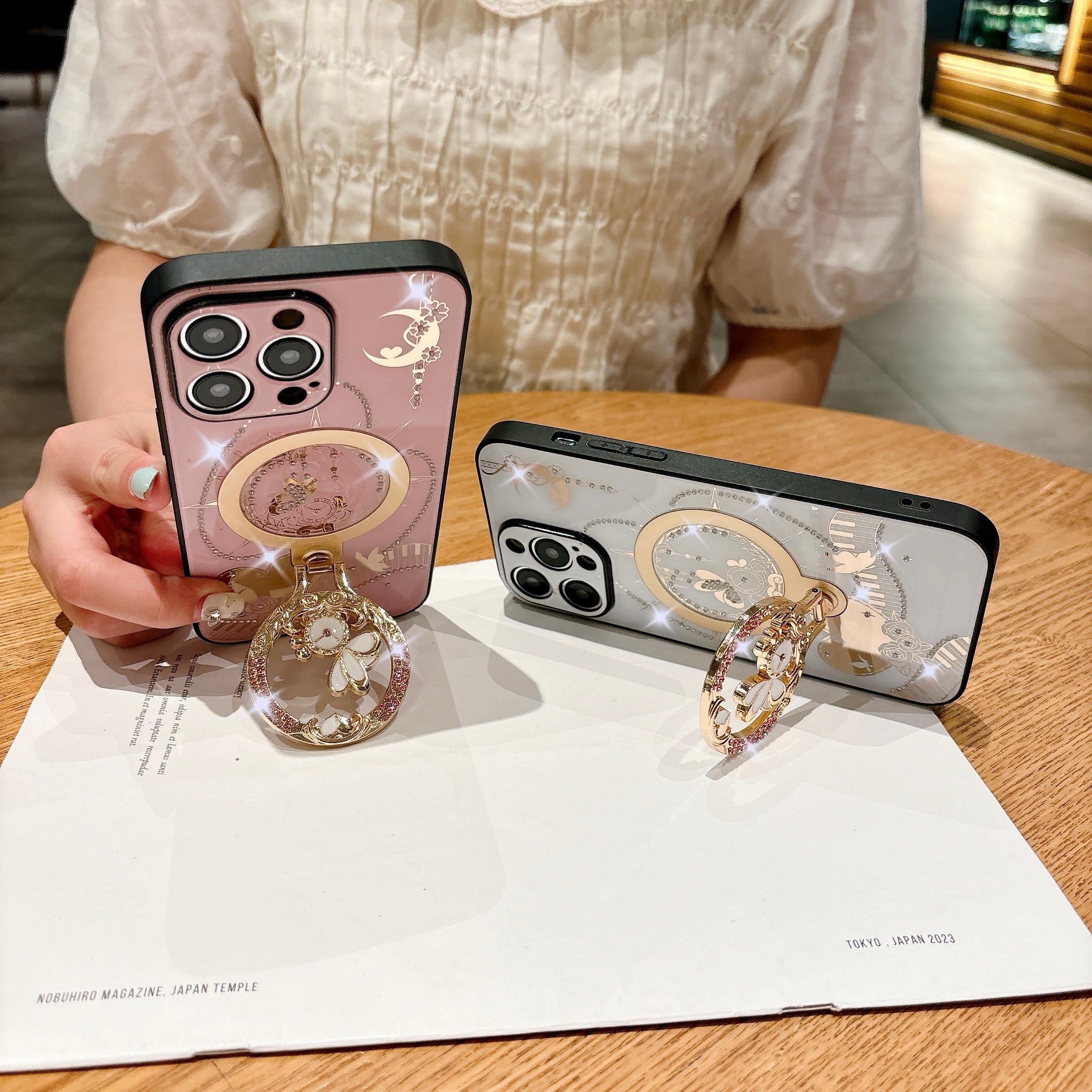 Magntic Luxury Bling Crystal Artificial Diamond Camera Suction Phone Case With Holder For iPhone 16 Promax/ 15 Pro max/14 Pro max/13 Promax Shockproof Protective Bumper Cover