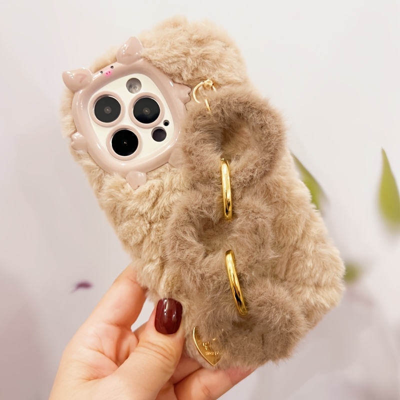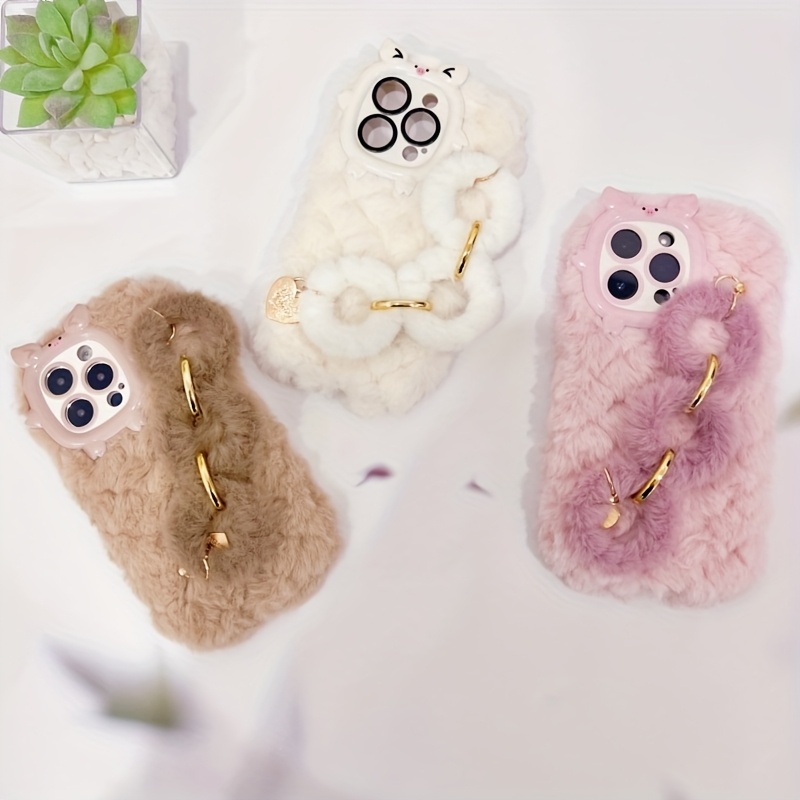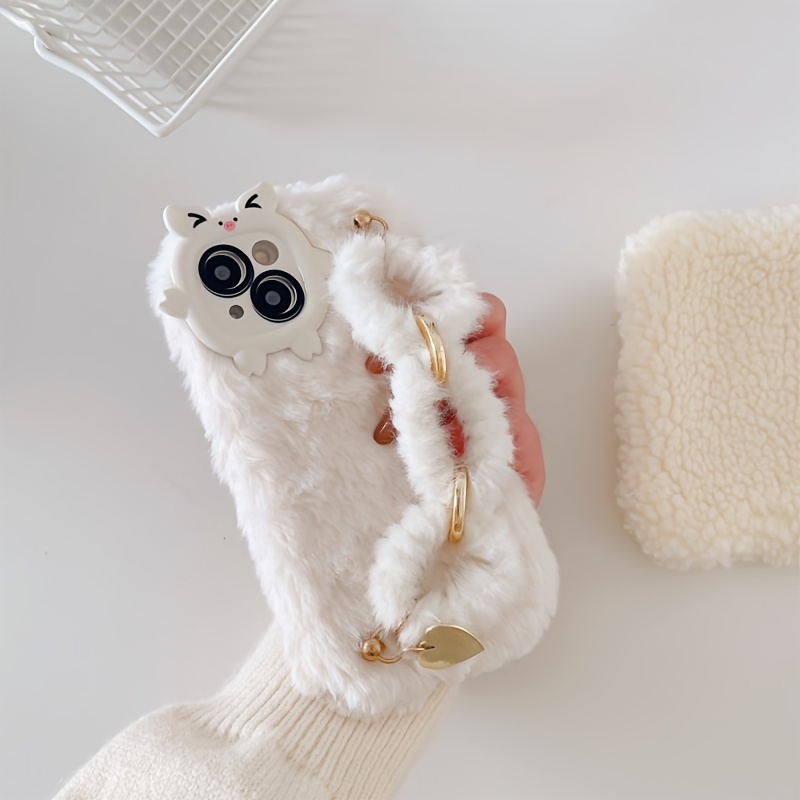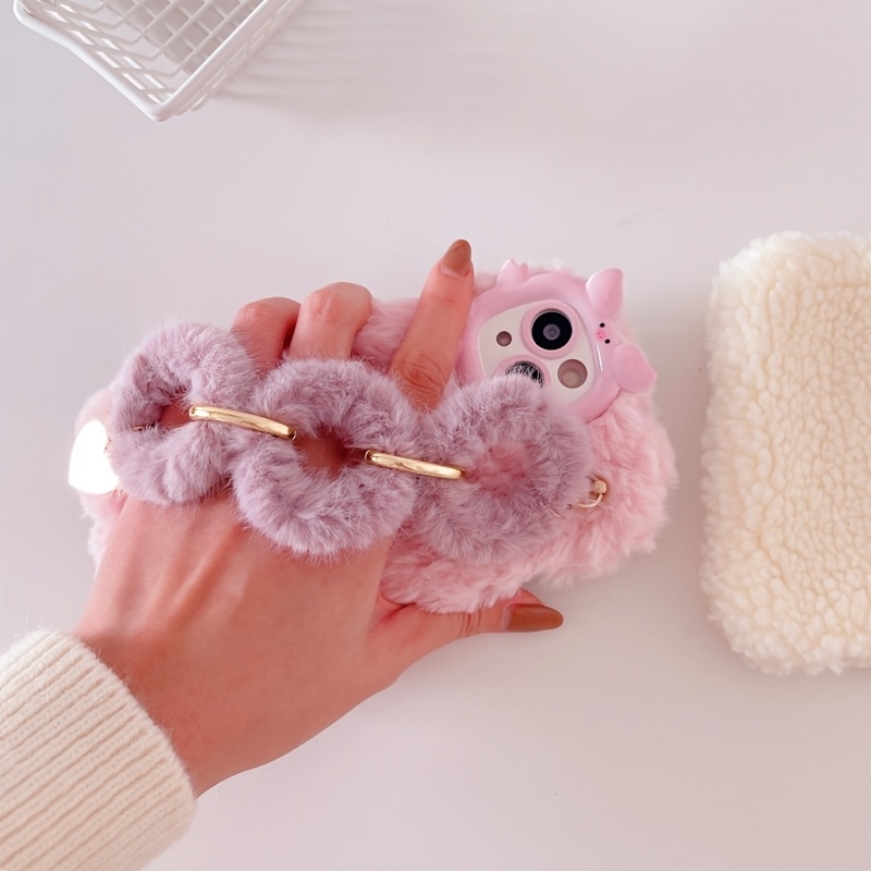 Plush Grid Wristband Lanyard Phone Case, Suitable for Apple 16/15 Pro Max/15 Pro/15/15Plus/14 Pro Max/14 Pro/14Plus/14/13 Pro Max/13 Pro/13 /12 Pro Max/12 Pro/12/11Pro max/11 Autumn and Winter Girl Plush Mobile Phone Protecti